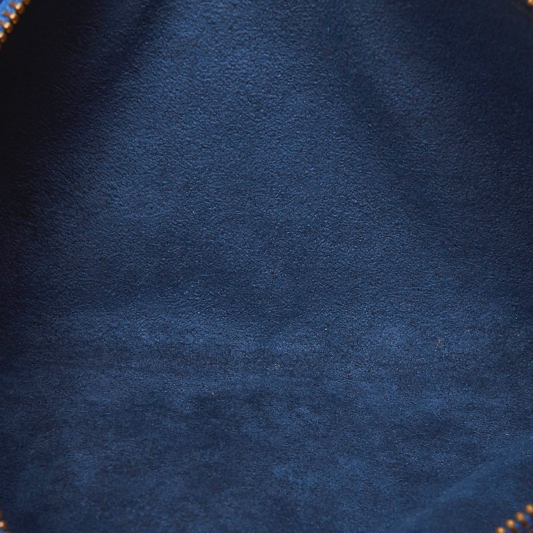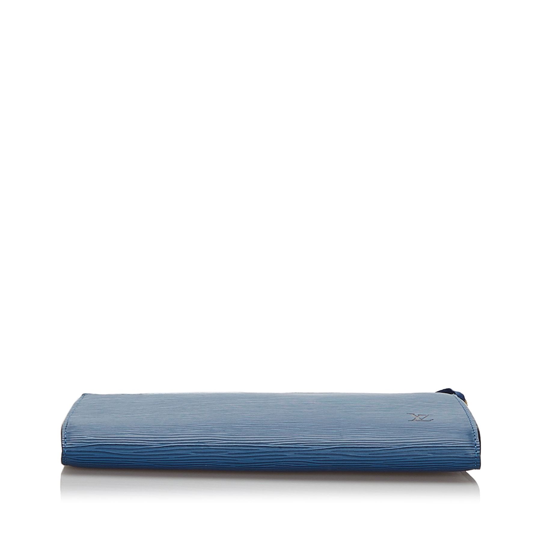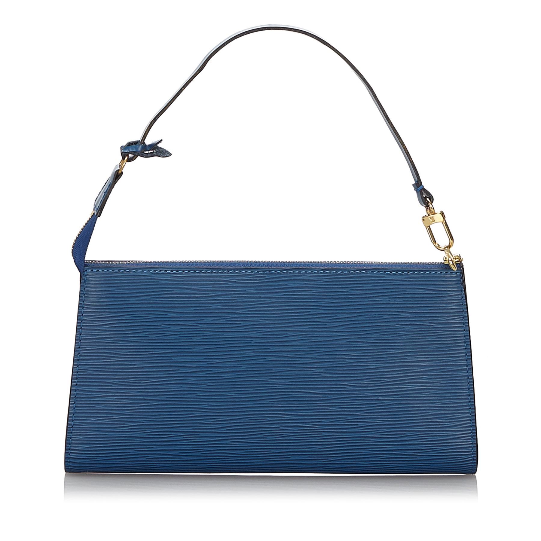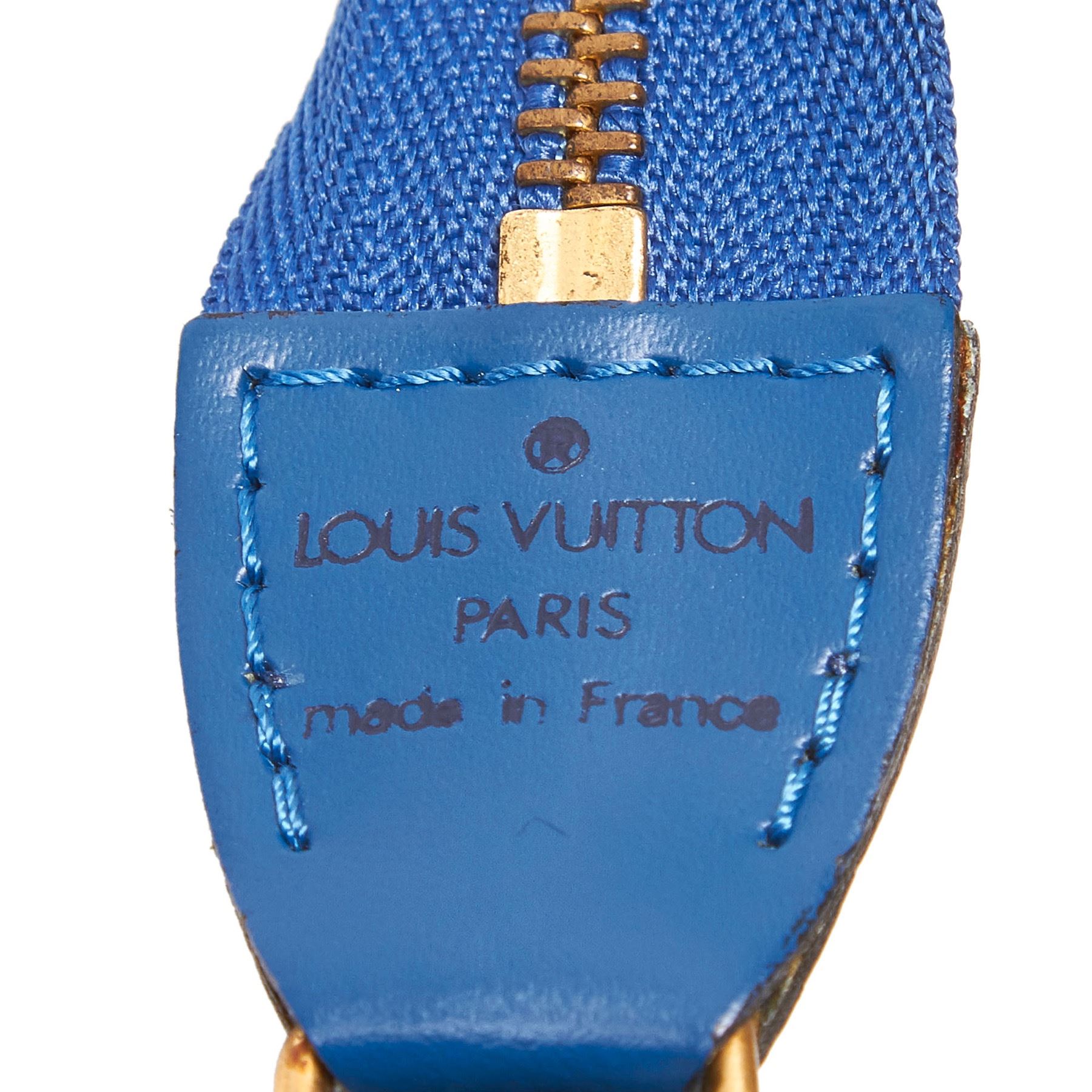 The Pochette Accessoires features an epi leather body, a flat leather strap, and a top zip closure. Leather x Epi Leather Blue Exterior front is scratched. Exterior handle is stained. Interior lining is discolored. Zipper is scratched. Size: 12 x 23.5 x 2 Card: NO. Louis Vuitton pieces do not come with an authenticity card—please refer to the production date code within the bag for its age and as an authenticity reference. Made in: France