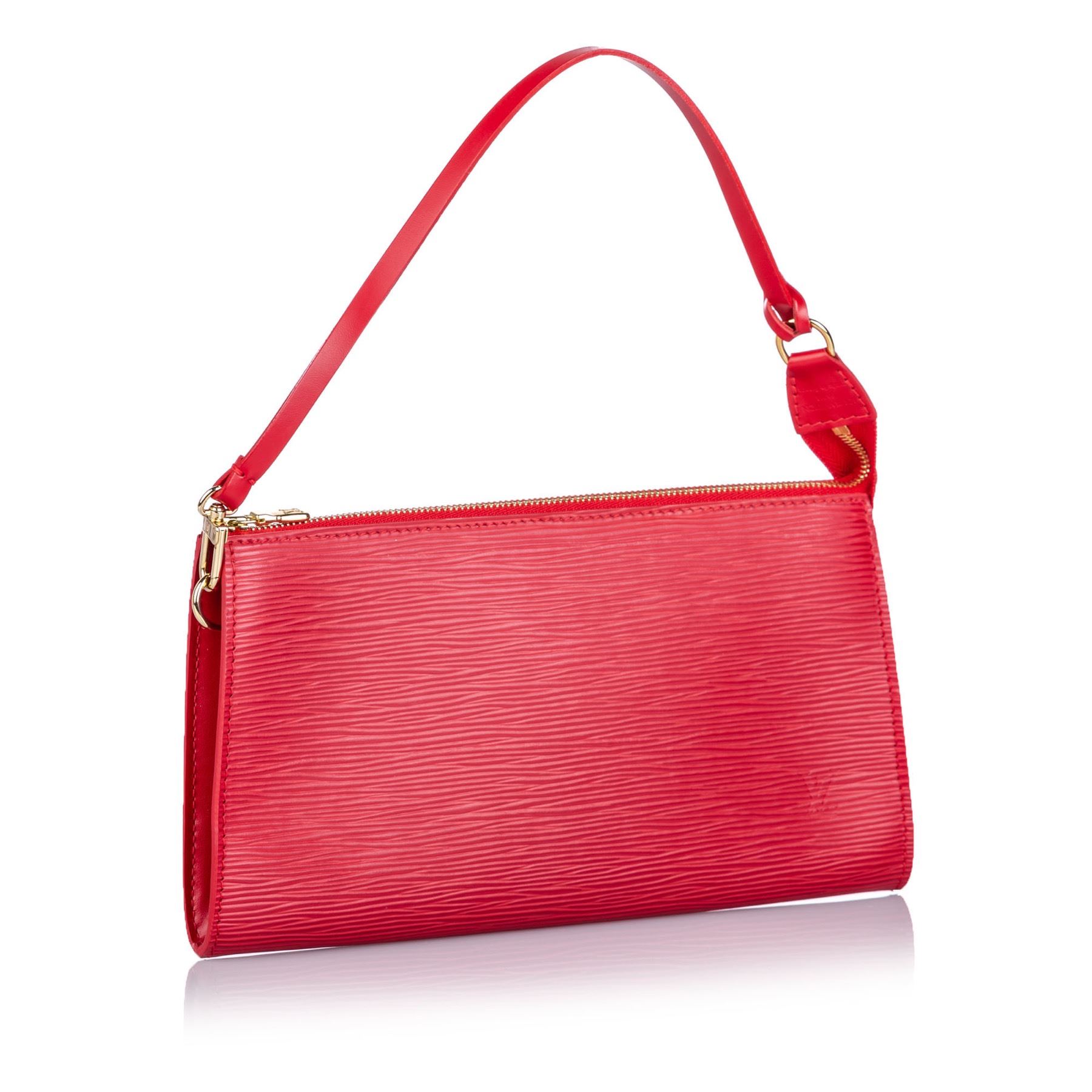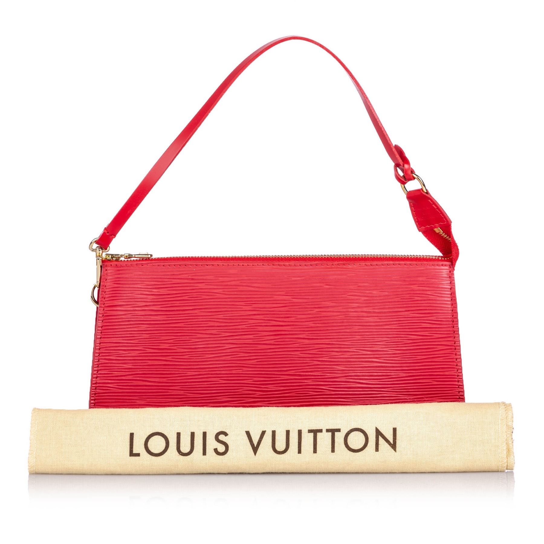 The Pochette Accessoires features an epi leather body, a flat leather strap, and a top zip closure. Leather x Epi Leather Red Size: 14 x 24 x 2 Card: NO. Louis Vuitton pieces do not come with an authenticity card—please refer to the production date code within the bag for its age and as an authenticity reference. Made in: FRANCE