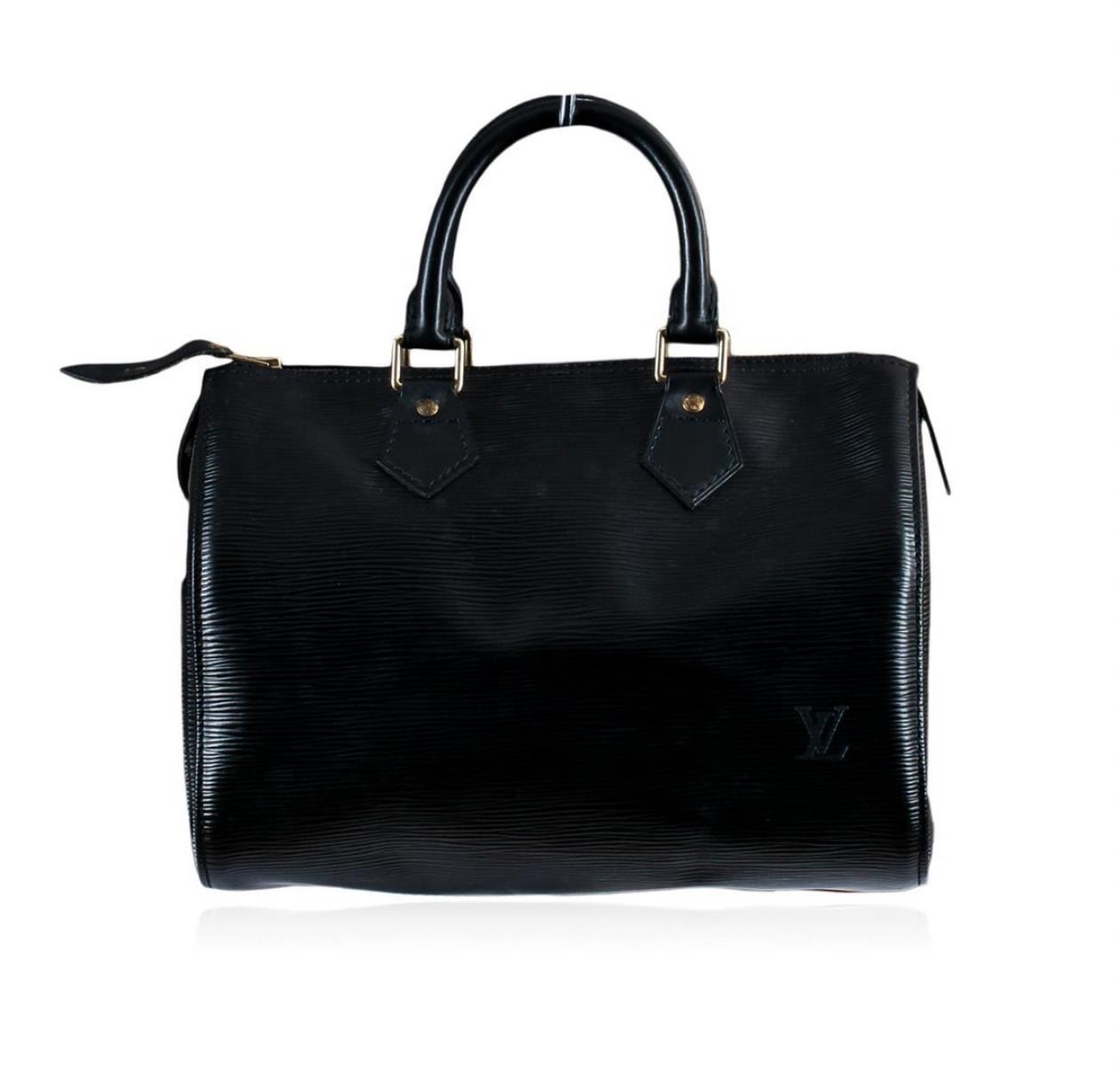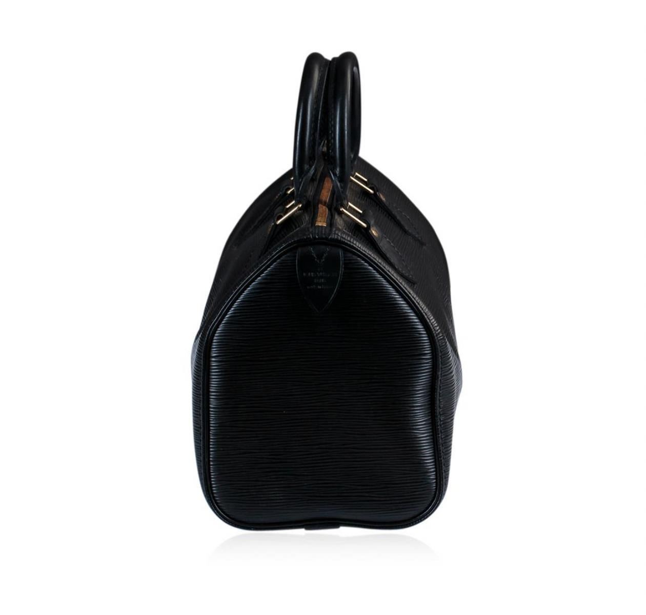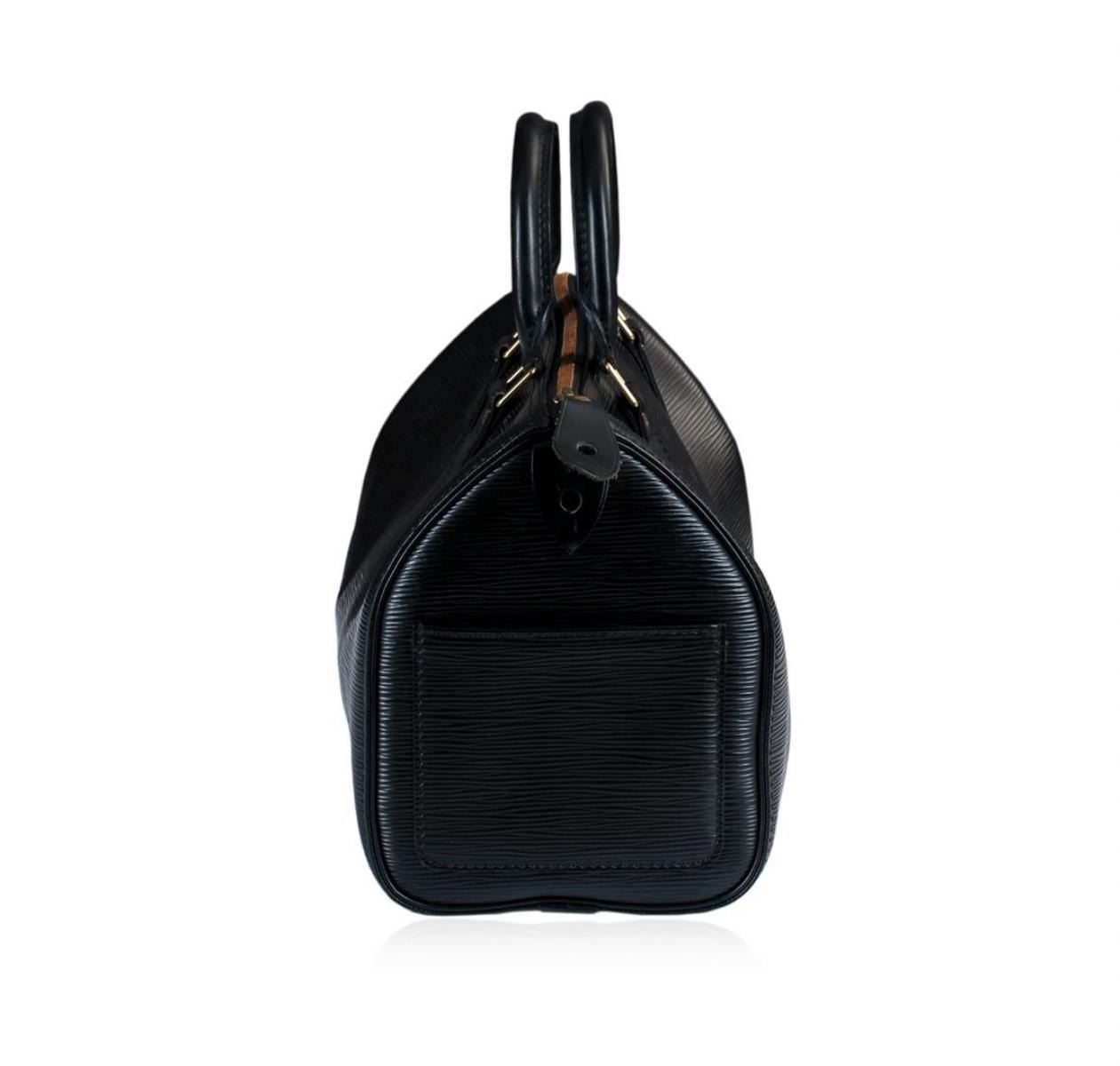 An Authentic Louis Vuitton Epi Speedy 25 Hand Bag in Noir Black. This is the all-purpose Louis Vuitton handbag classic crafted of Louis Vuitton Textured Epi Leather.