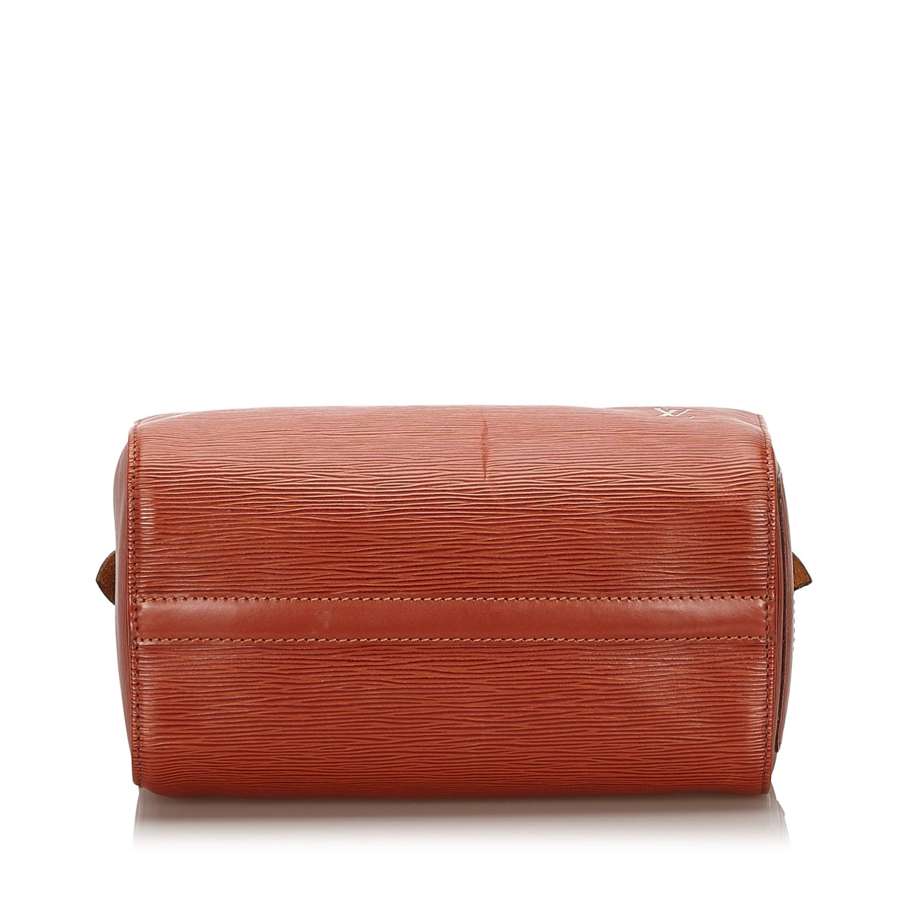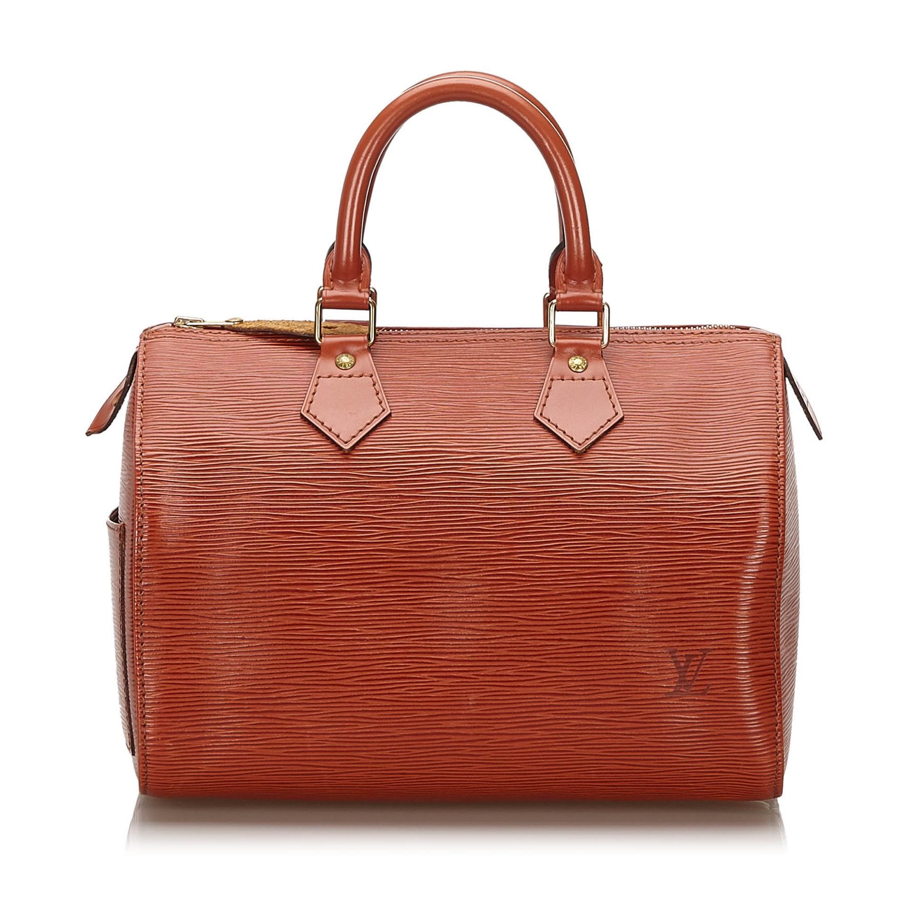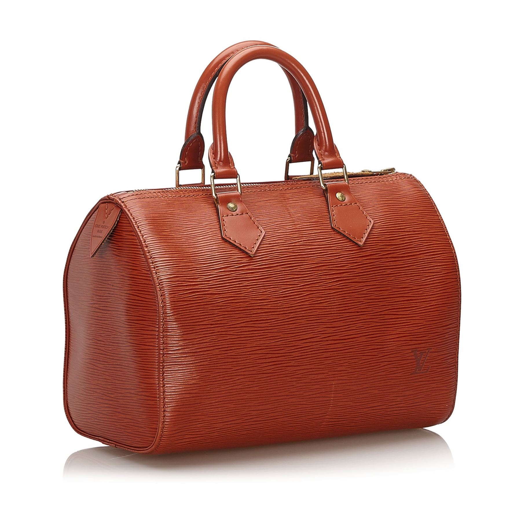 The Speedy 25 features an epi leather body, rolled handles, a top zip closure, and an interior pocket. Leather x Epi Leather Brown Exterior front is scratched. Exterior bottom is scratched. Exterior corners is scratched. Exterior side is stained. Interior lining is stained and scratched. Interior pocket is stained and scratched. Zipper is scratched. Studs is rusty and scratched. Size: 25 x 19 x 15 Card: NO. Louis Vuitton pieces do not come with an authenticity card—please refer to the production date code within the bag for its age and as an authenticity reference. Made in: France