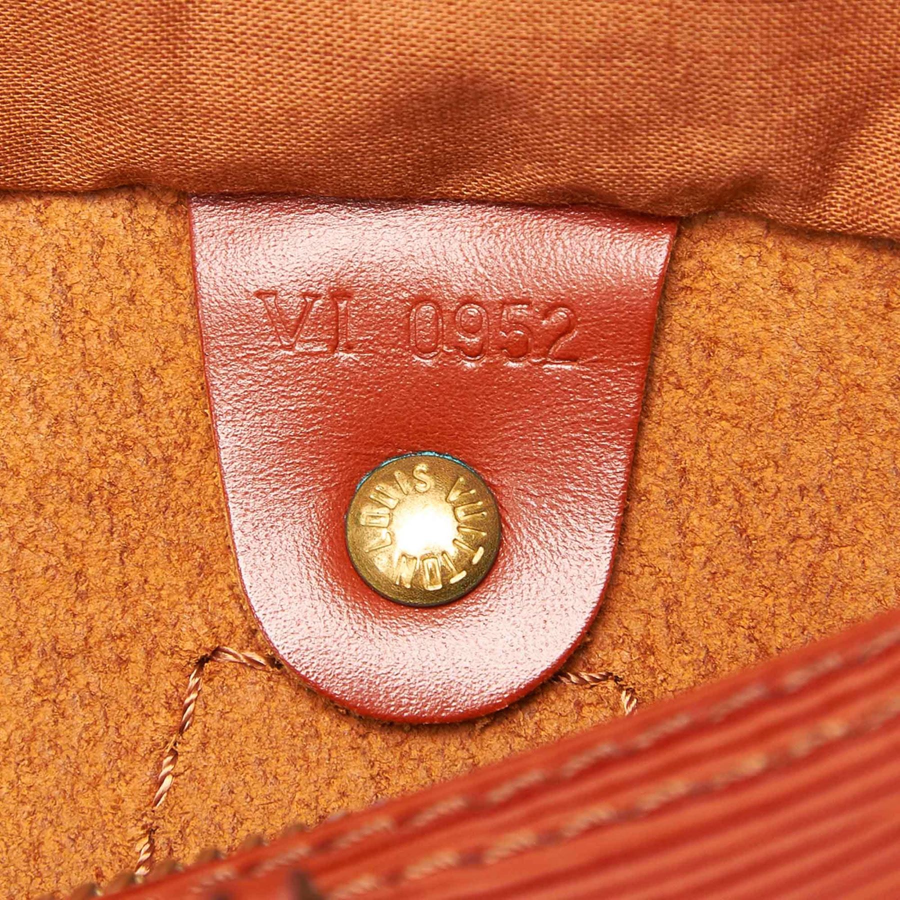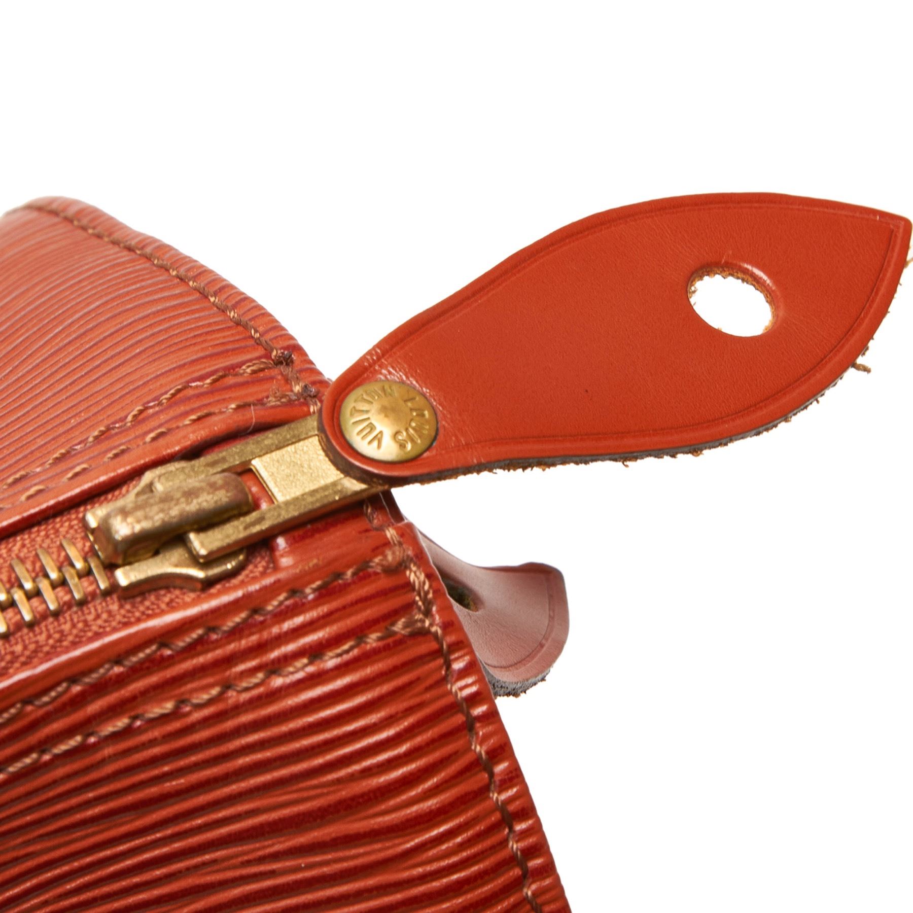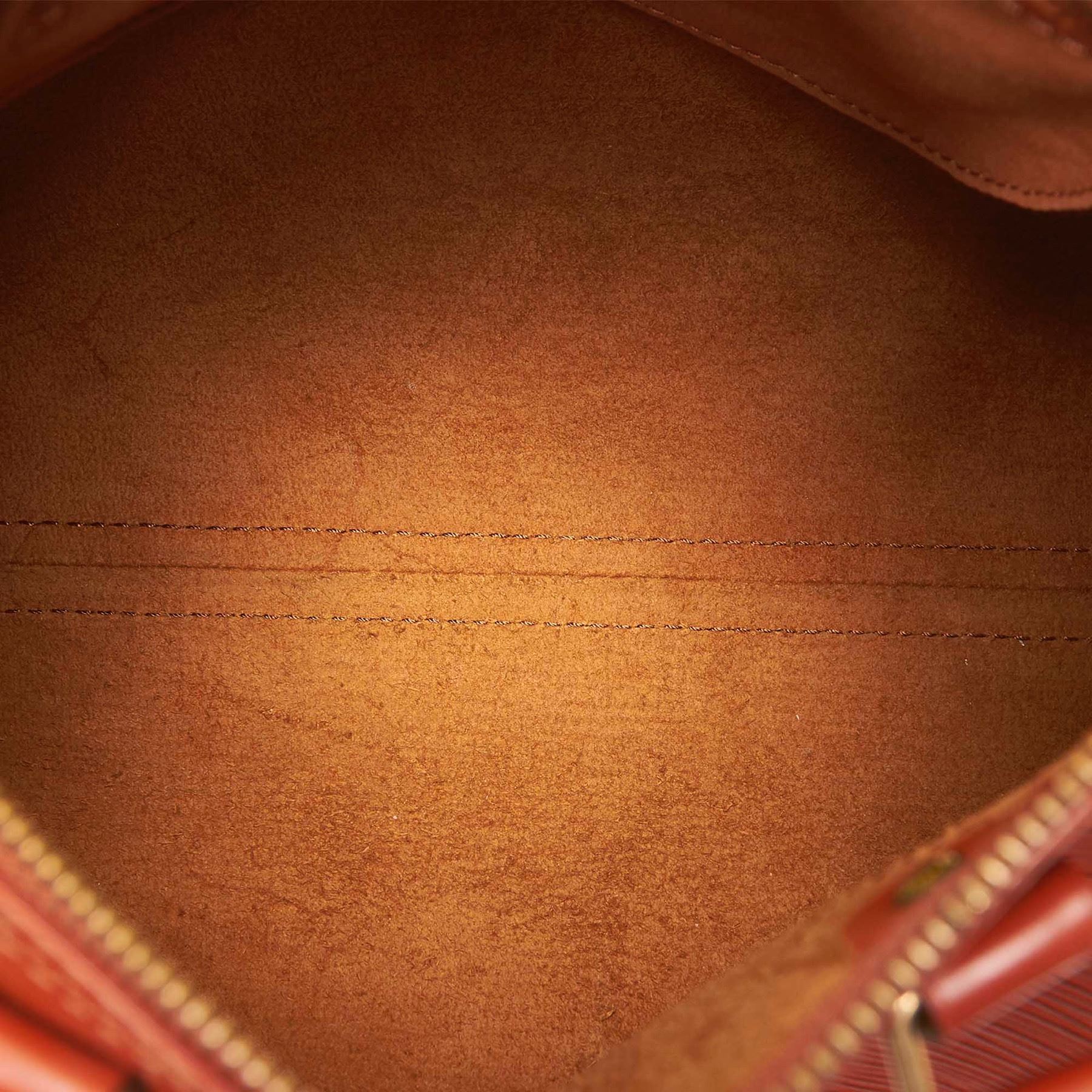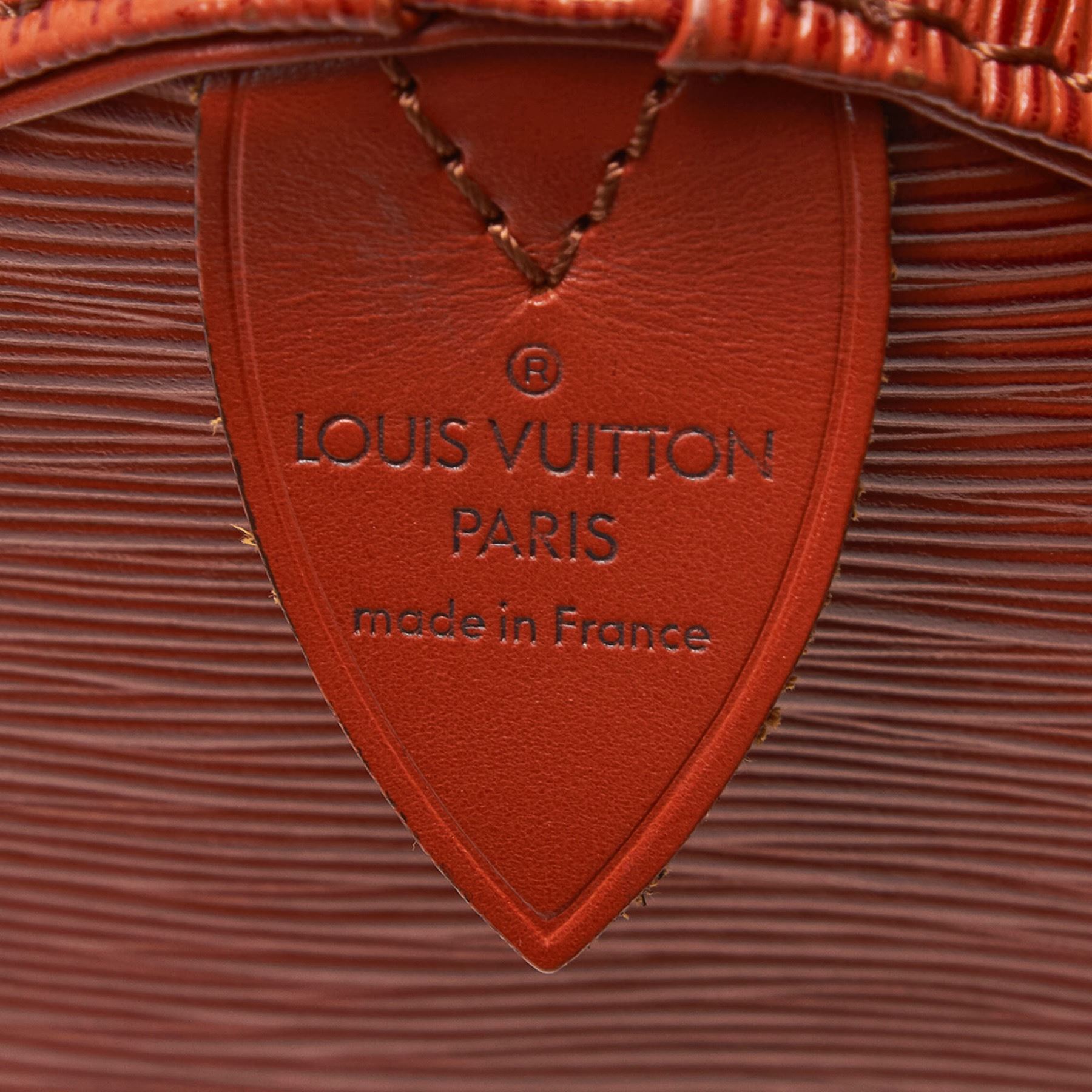 The Speedy 25 features an epi leather body, rolled handles, a top zip closure, and an interior pocket. Leather x Epi Leather Brown Exterior front is scratched. Exterior bottom is scratched. Exterior corners is scratched. Exterior side is stained. Interior lining is stained and scratched. Interior pocket is stained and scratched. Zipper is scratched. Studs is rusty and scratched. Size: 25 x 19 x 15 Card: NO. Louis Vuitton pieces do not come with an authenticity card—please refer to the production date code within the bag for its age and as an authenticity reference. Made in: France