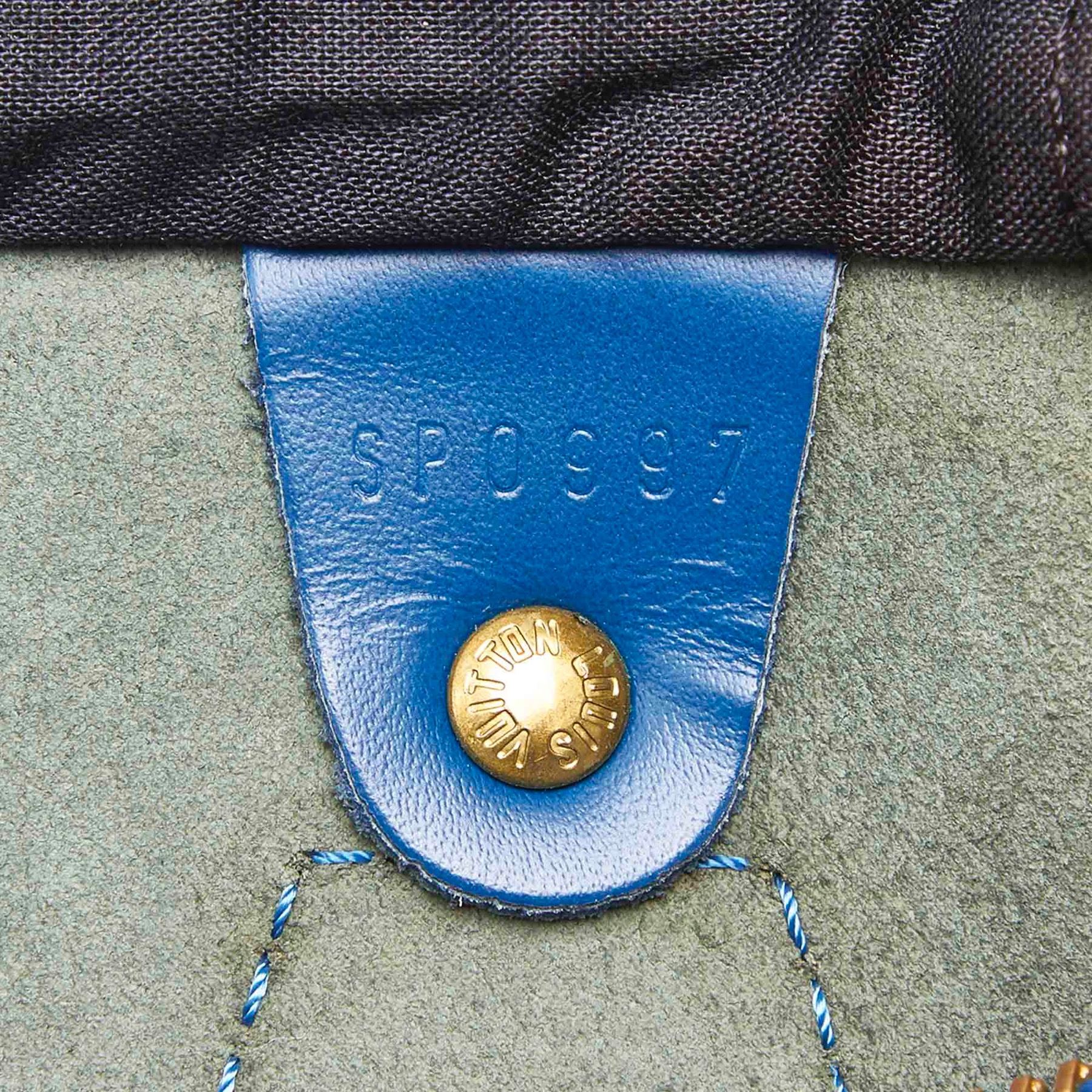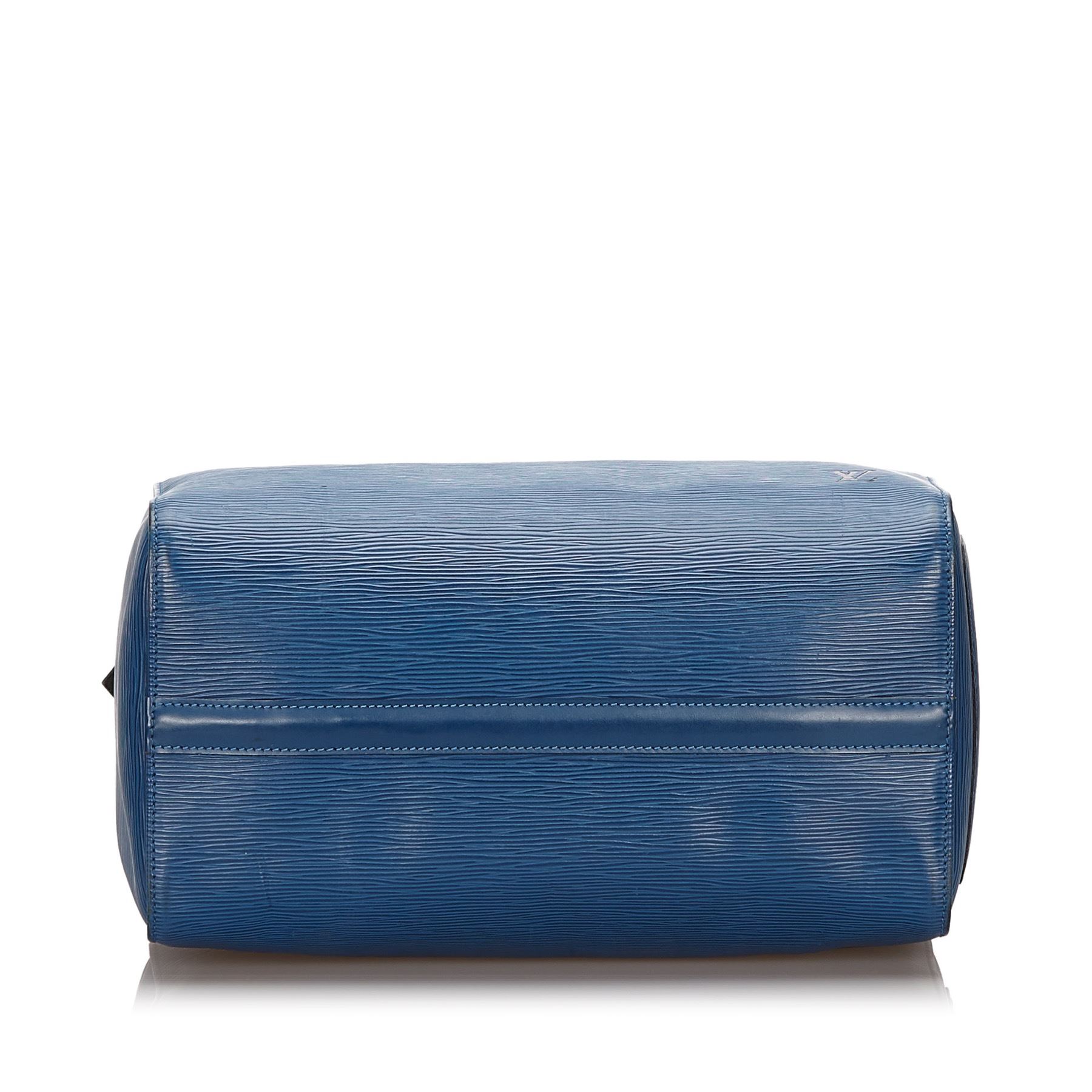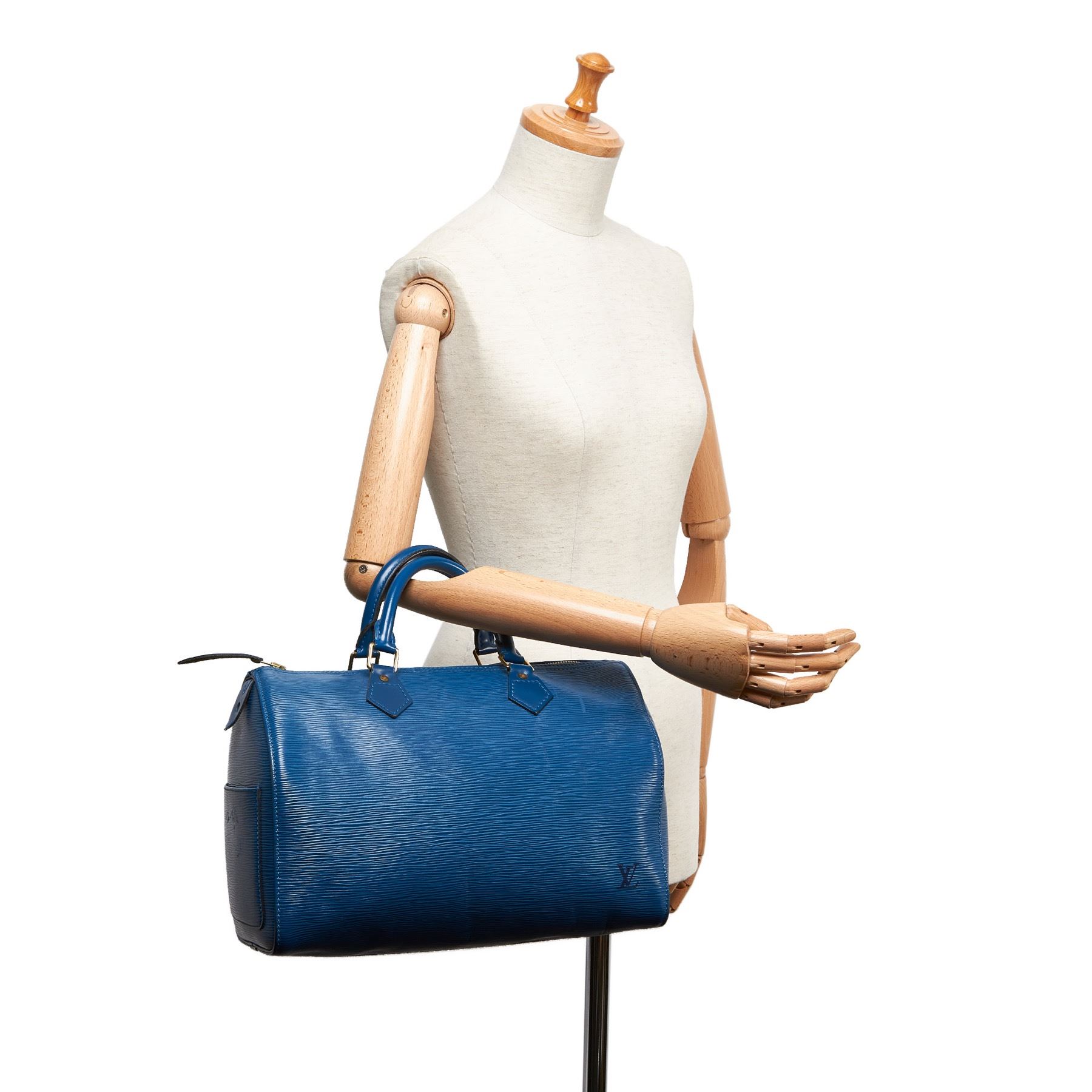 The Speedy 30 features an epi leather body, a side exterior slip pocket, rolled leather handles, a top zip closure, and an interior slip pocket. Leather x Epi Leather Blue Exterior front is scratched. Exterior back is scratched. Exterior corners is stained and scratched. Exterior side is stained and scratched. Interior lining is stained. Interior pocket is sticky and scratched. Zipper is scratched. Studs is rusty and scratched. Size: 21 x 30 x 17 Card: NO. Louis Vuitton pieces do not come with an authenticity card—please refer to the production date code within the bag for its age and as an authenticity reference. Made in: France