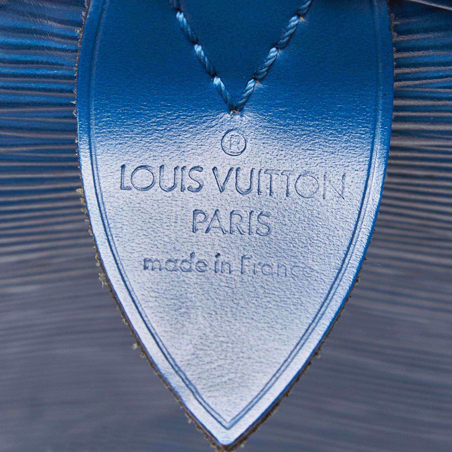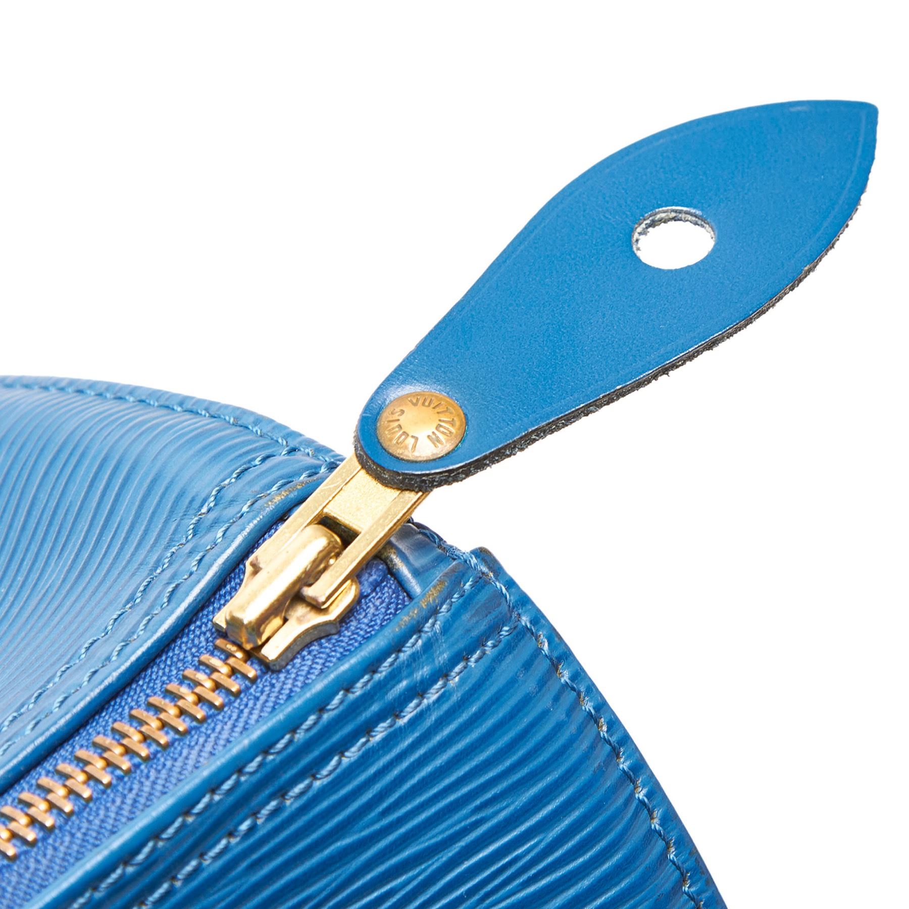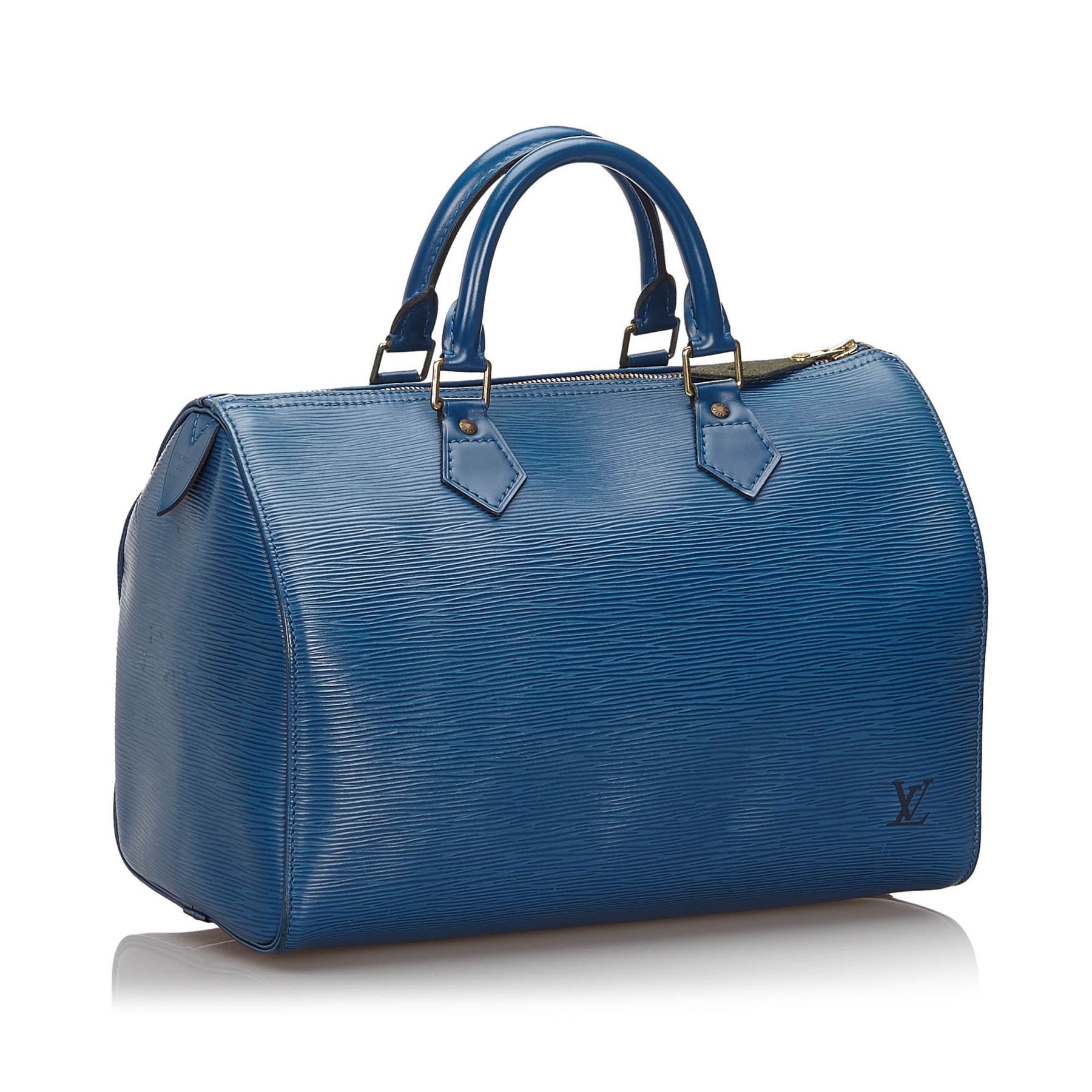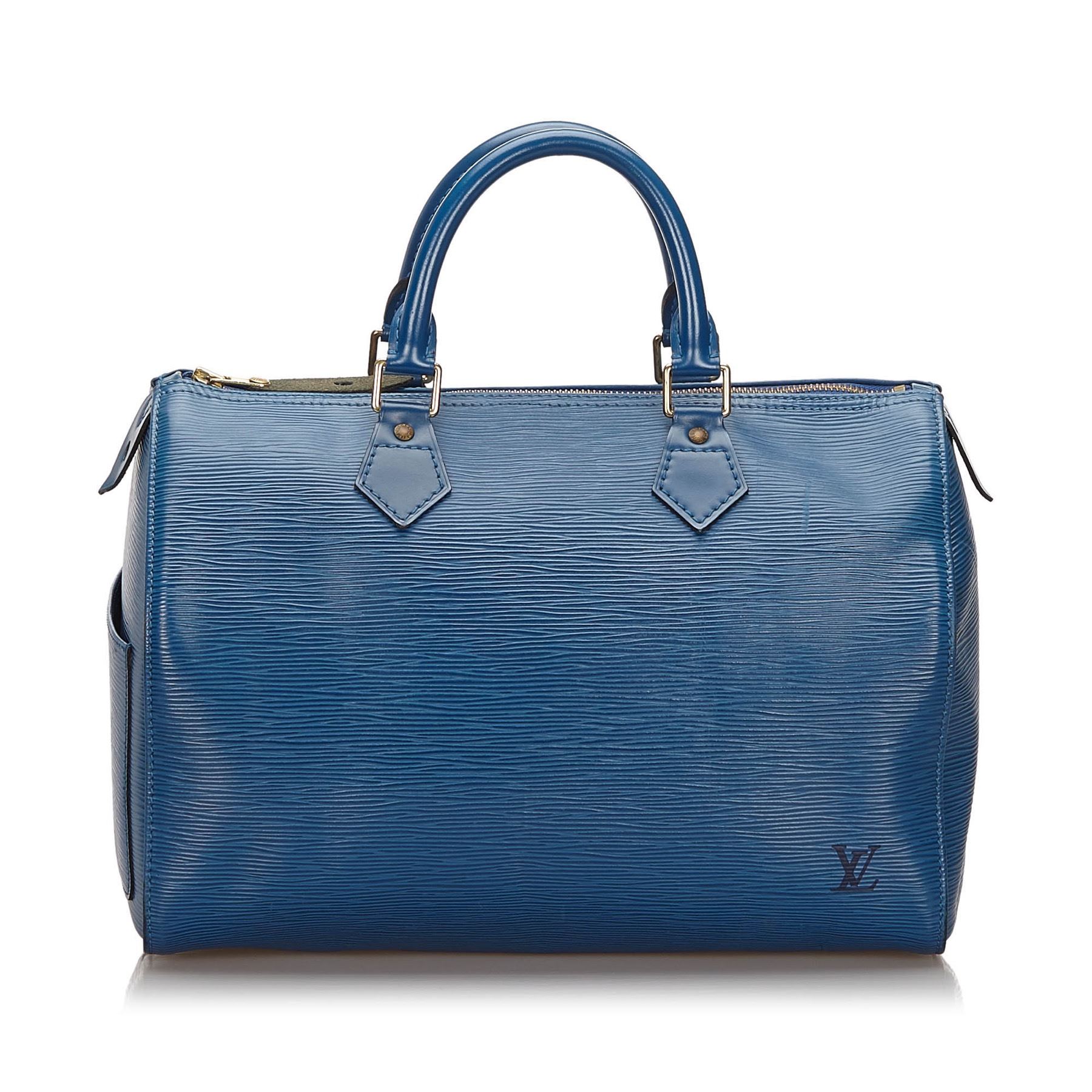 The Speedy 30 features an epi leather body, a side exterior slip pocket, rolled leather handles, a top zip closure, and an interior slip pocket. Leather x Epi Leather Blue Exterior front is scratched. Exterior back is scratched. Exterior corners is stained and scratched. Exterior side is stained and scratched. Interior lining is stained. Interior pocket is sticky and scratched. Zipper is scratched. Studs is rusty and scratched. Size: 21 x 30 x 17 Card: NO. Louis Vuitton pieces do not come with an authenticity card—please refer to the production date code within the bag for its age and as an authenticity reference. Made in: France