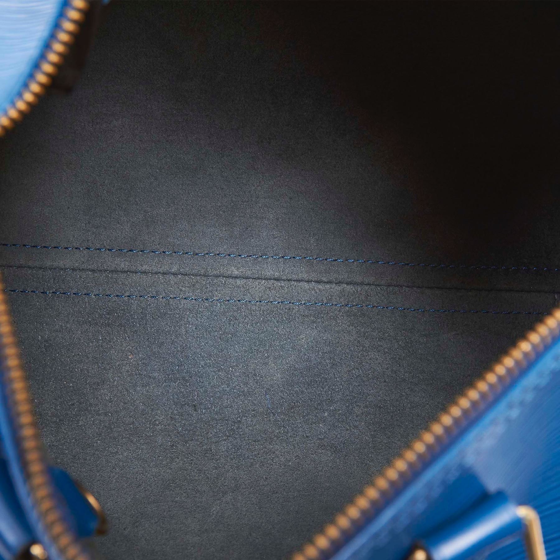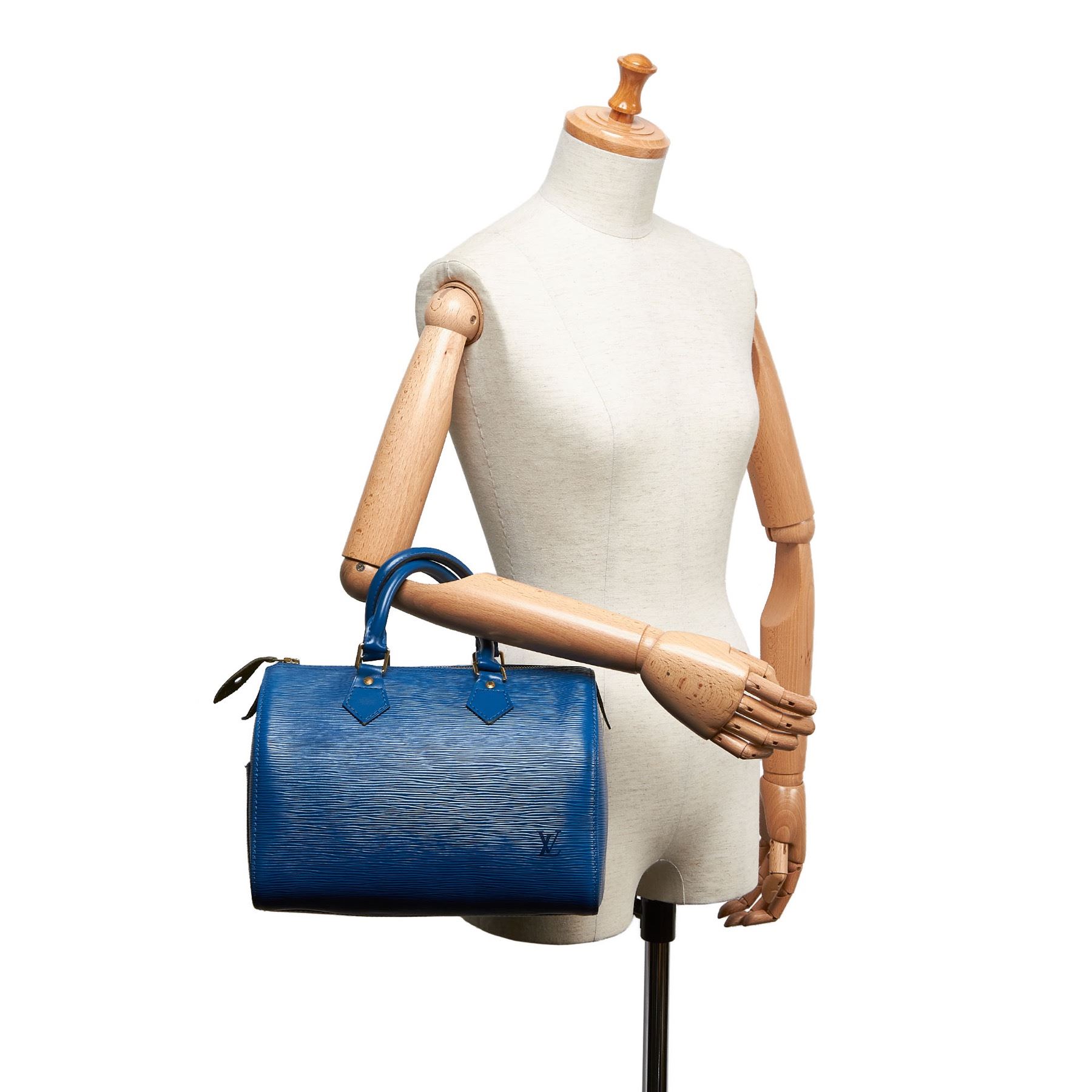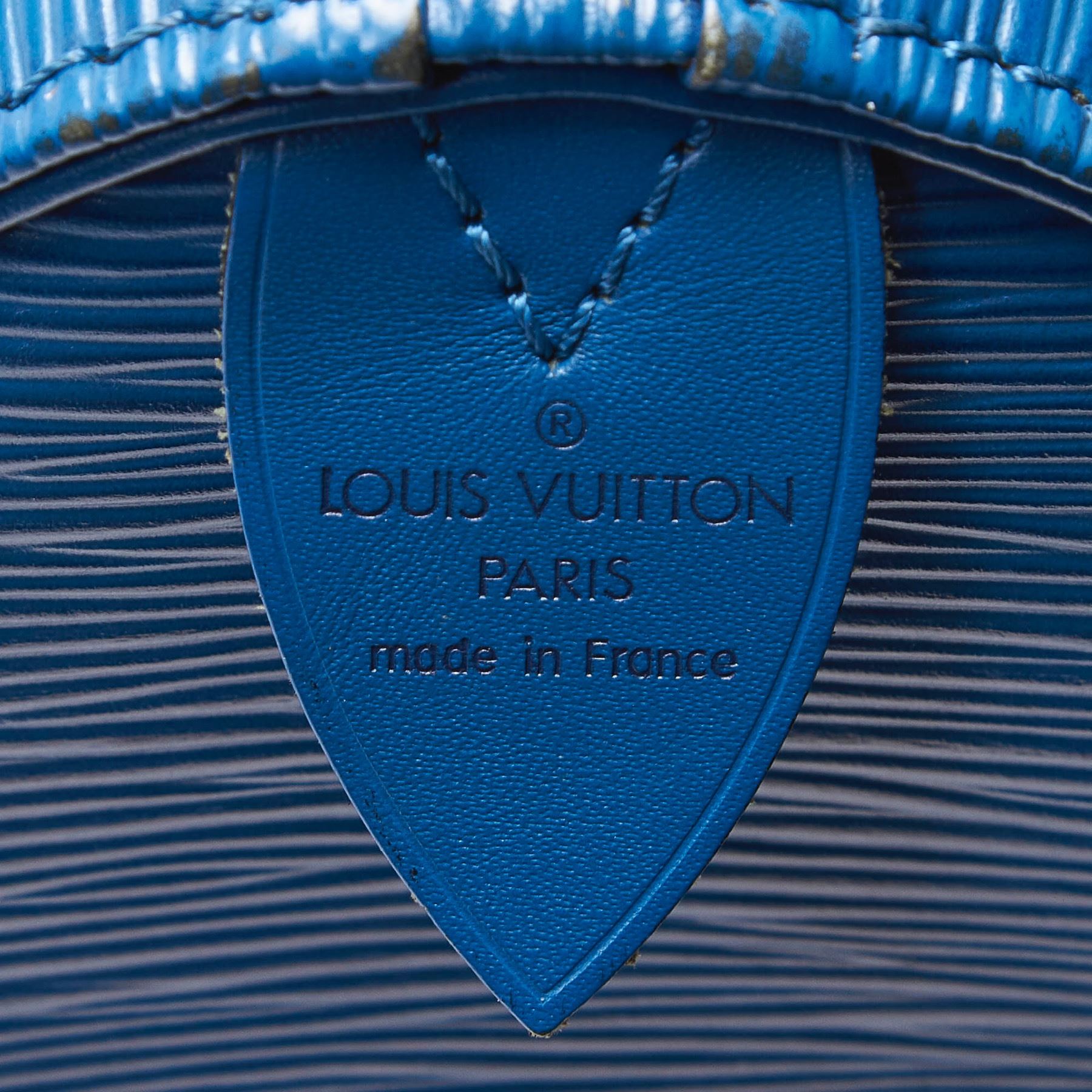 The Speedy 30 features an epi leather body, rolled handles, a top zip closure, and an interior slip pocket. Leather x Epi Leather Blue Exterior front is scratched. Exterior back is scratched. Exterior bottom is stained and scratched. Exterior handle is scratched. Exterior corners is scratched. Interior lining is stained. Zipper is scratched. Studs is rusty and scratched. Size: 21 x 30 x 17 Card: NO. Louis Vuitton pieces do not come with an authenticity card—please refer to the production date code within the bag for its age and as an authenticity reference. Made in: France