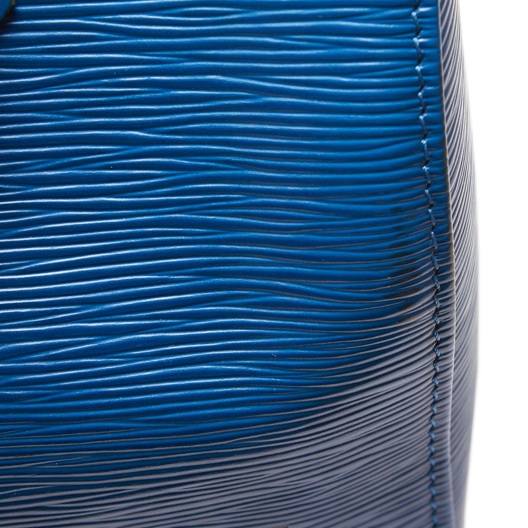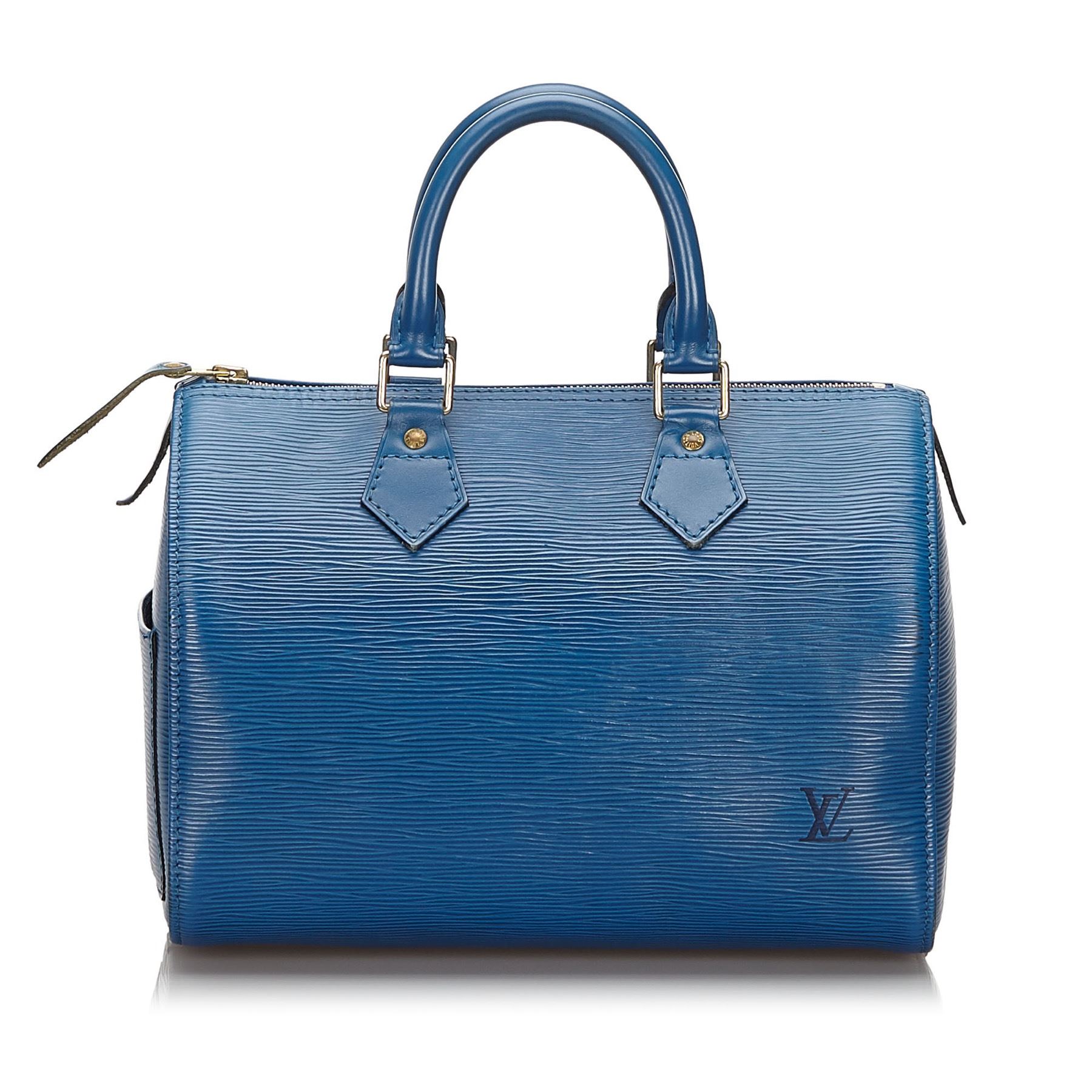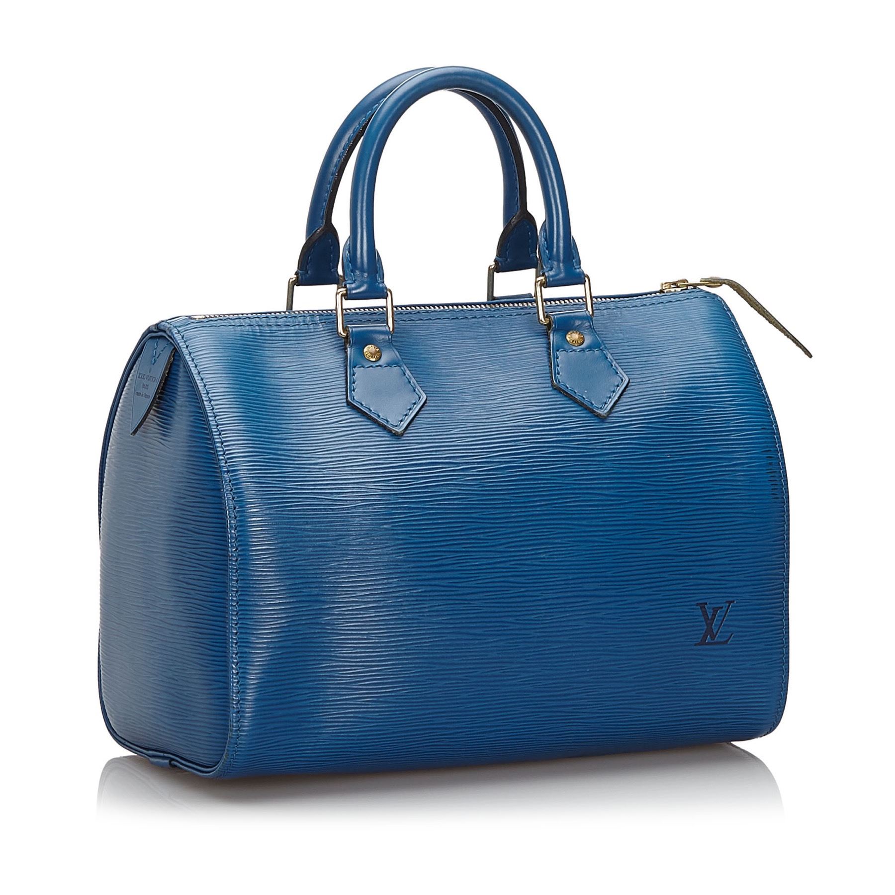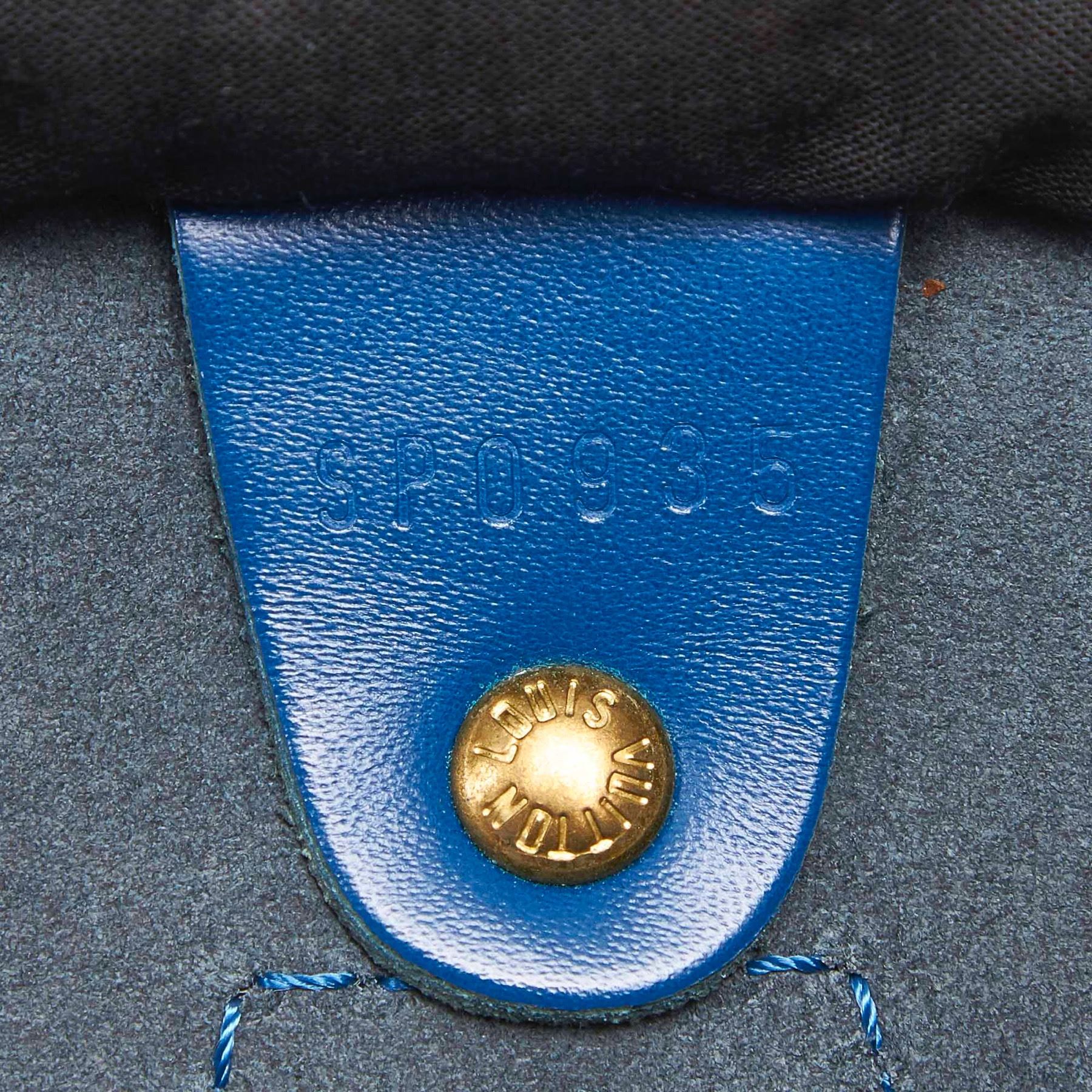 The Speedy 30 features an epi leather body, rolled handles, a top zip closure, and an interior slip pocket. Leather x Epi Leather Blue Exterior front is scratched. Exterior back is scratched. Exterior bottom is stained and scratched. Exterior handle is scratched. Exterior corners is scratched. Interior lining is stained. Zipper is scratched. Studs is rusty and scratched. Size: 21 x 30 x 17 Card: NO. Louis Vuitton pieces do not come with an authenticity card—please refer to the production date code within the bag for its age and as an authenticity reference. Made in: France