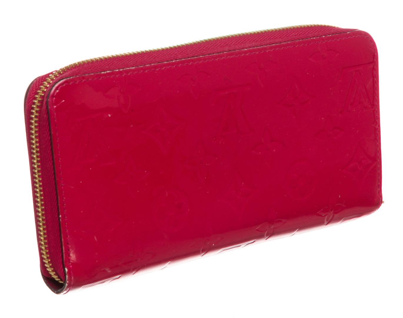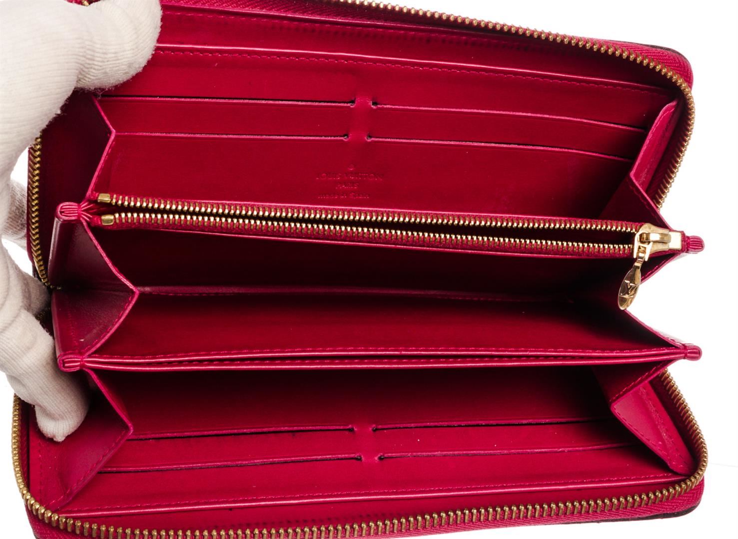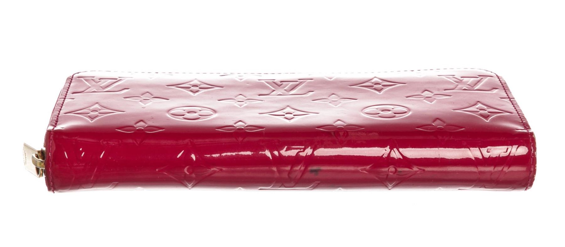 Monogram Vernis leather Louis Vuitton Zippy wallet with brass hardware, tonal leather lining, four interior compartments; one with zip closure, three bill compartments, eight card slots and zip-around closure.