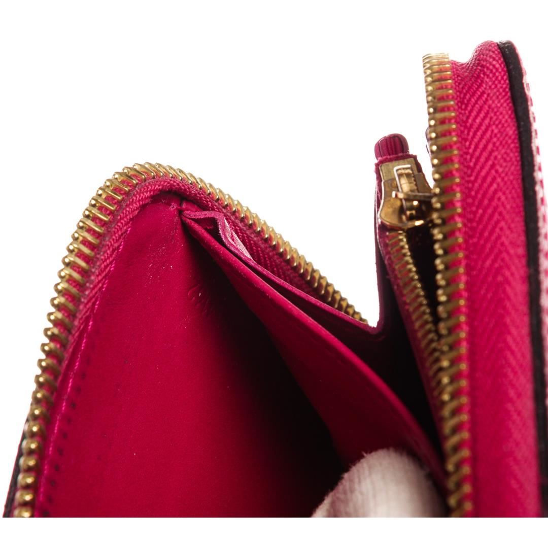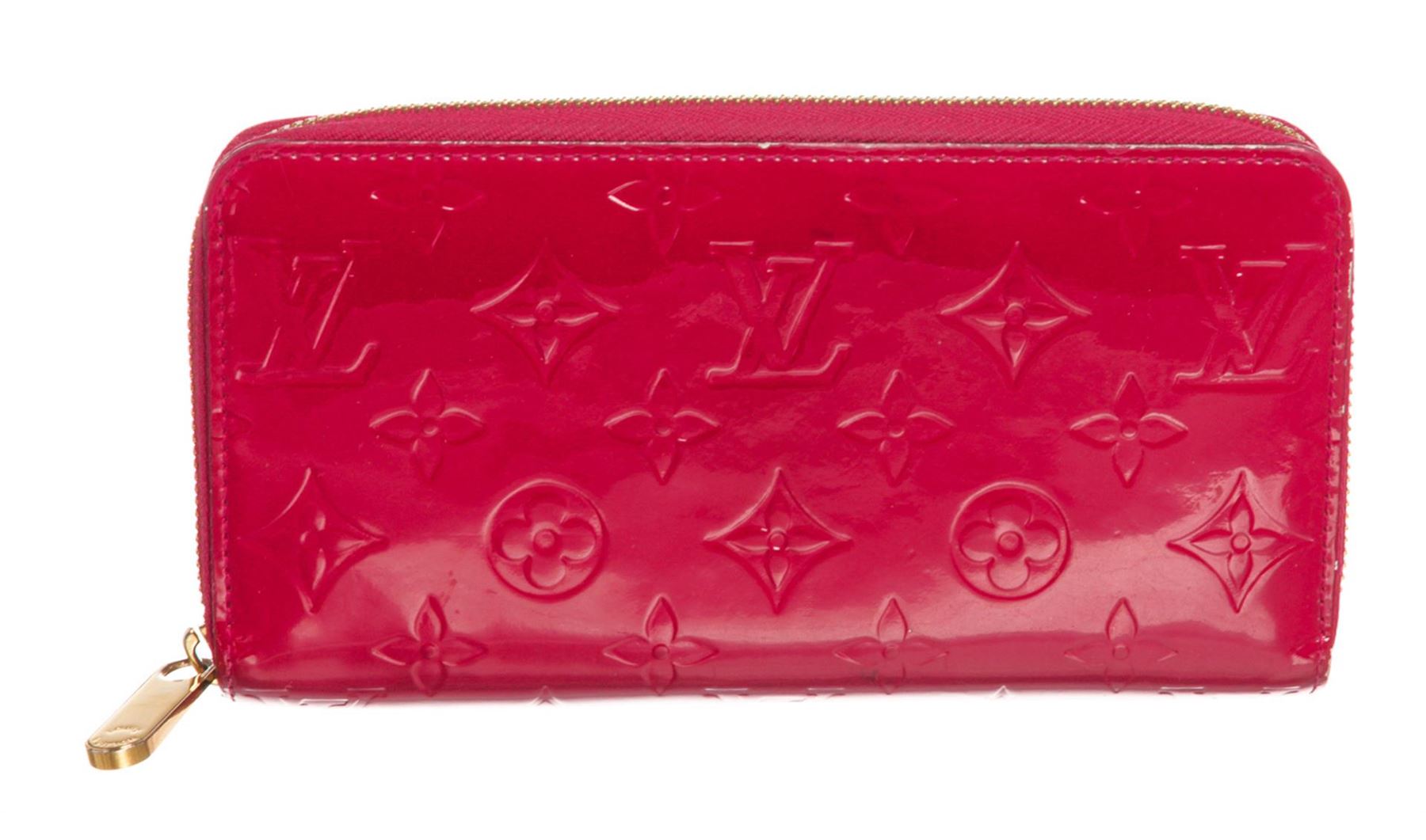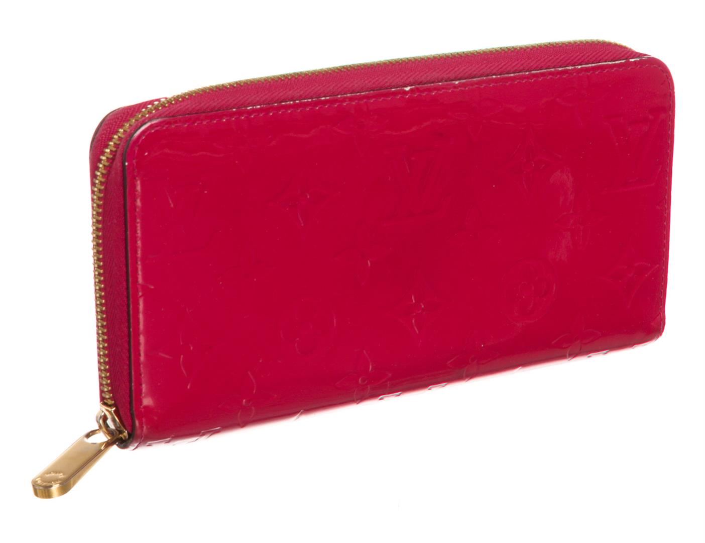 Monogram Vernis leather Louis Vuitton Zippy wallet with brass hardware, tonal leather lining, four interior compartments; one with zip closure, three bill compartments, eight card slots and zip-around closure.