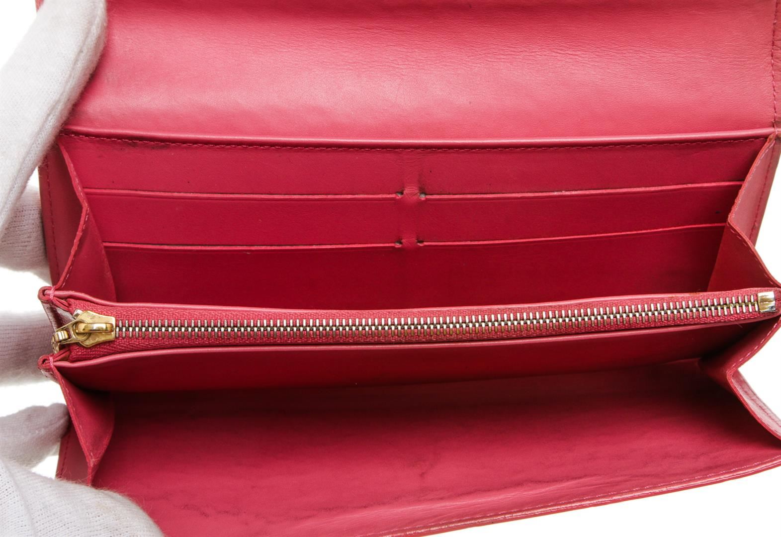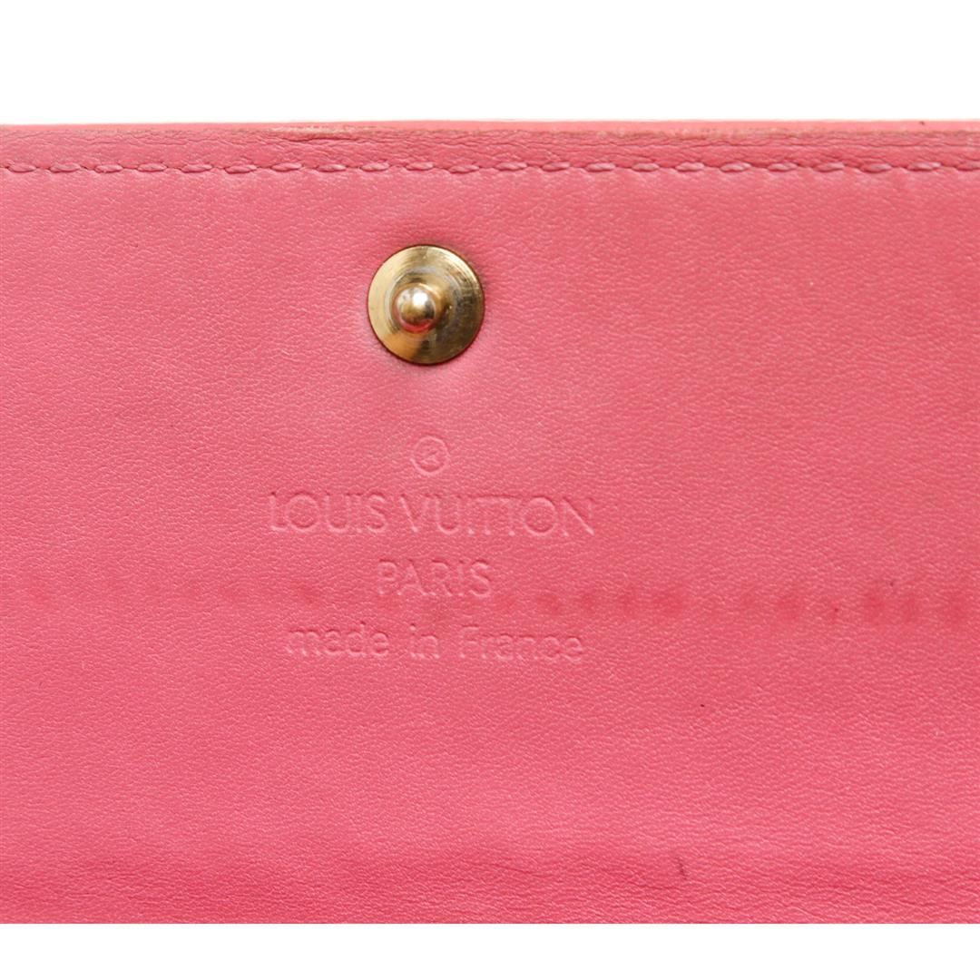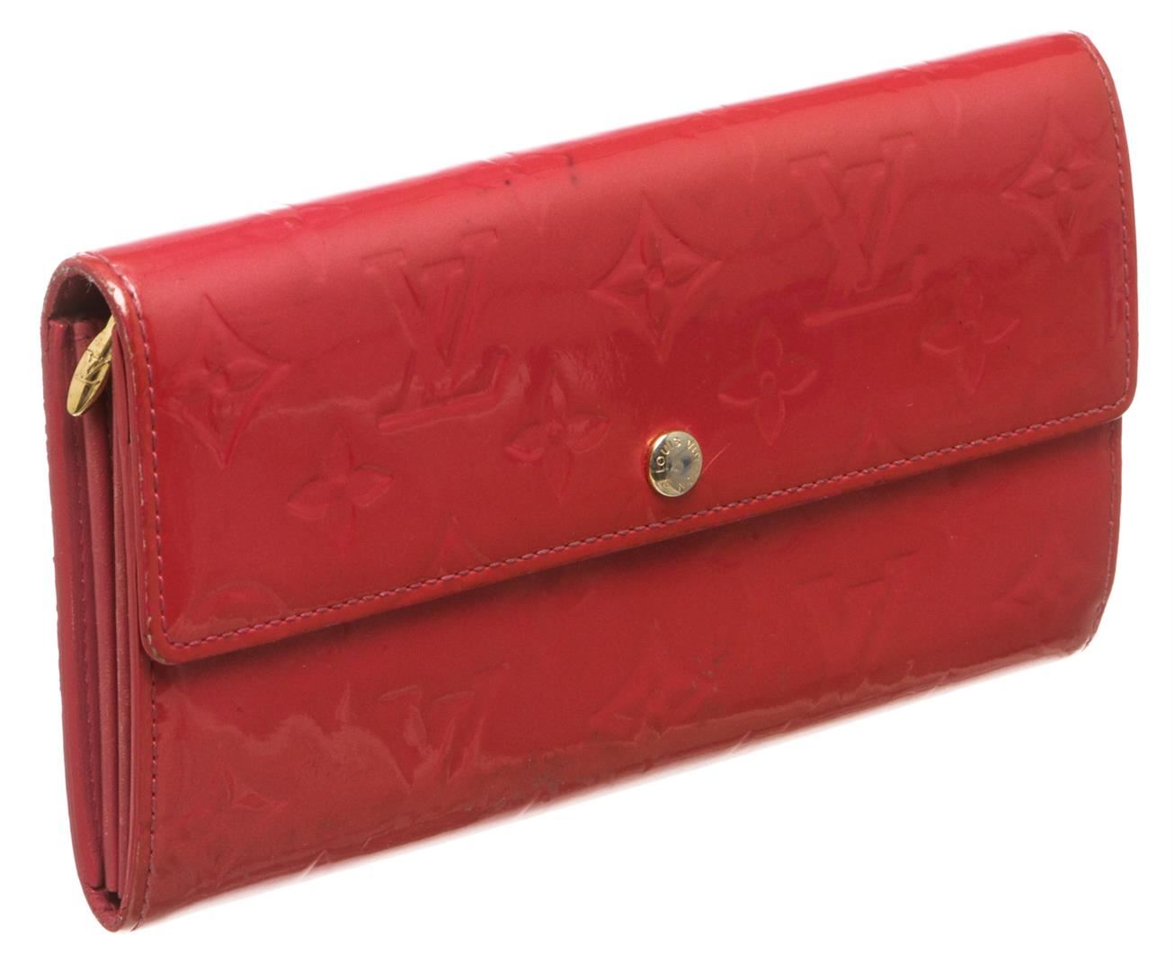 Monogram Vernis leather Louis Vuitton Sarah wallet with brass hardware, dual slip pockets at flap underside, tonal leather lining, dual interior pockets; one with zip closure, six card slots at interior wall and snap closure at front flap. Authentic.