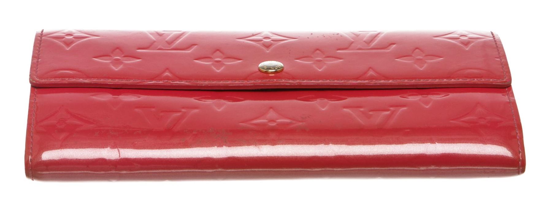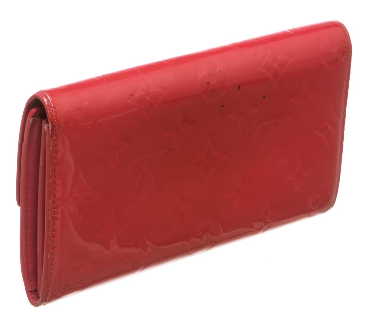 Monogram Vernis leather Louis Vuitton Sarah wallet with brass hardware, dual slip pockets at flap underside, tonal leather lining, dual interior pockets; one with zip closure, six card slots at interior wall and snap closure at front flap. Authentic.