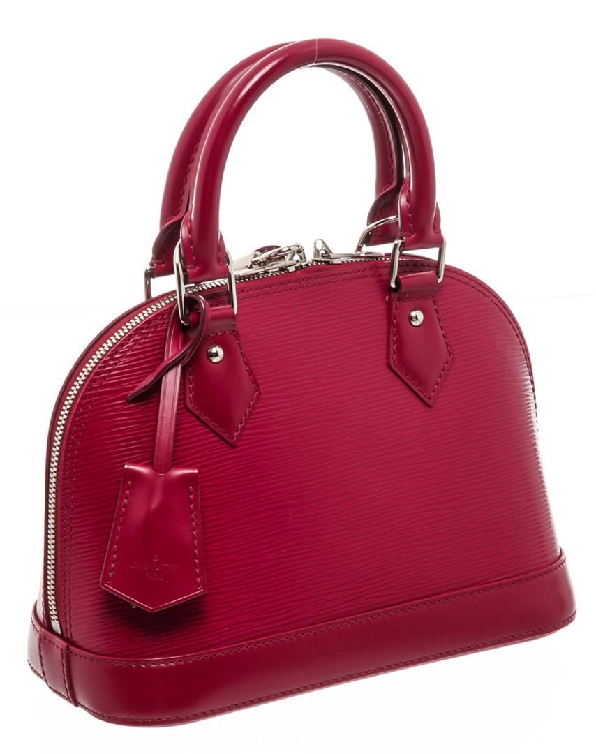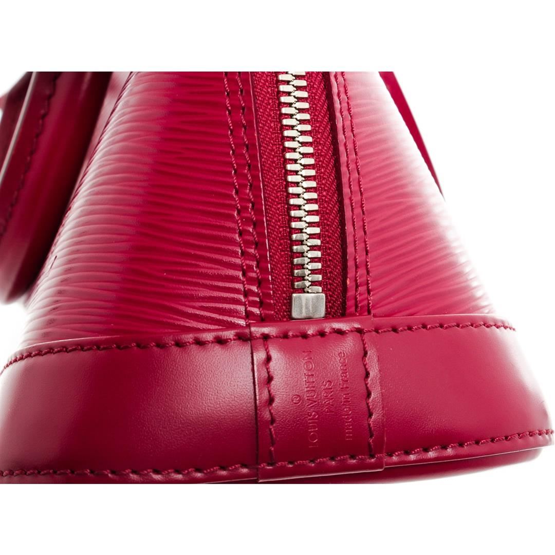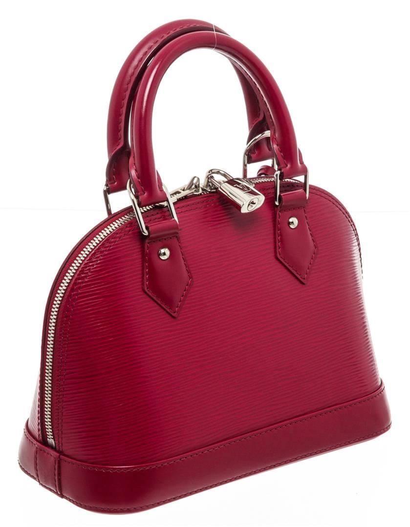 Fuchsia Epi leather Louis Vuitton Alma BB with brass hardware, dual rolled top handles, detachable flap shoulder strap, protective feet at base, tonal Alcantara lining, single slit pocket at interior wall and two-way zip closure at top. Includes clochette, lock and keys. Authentic.