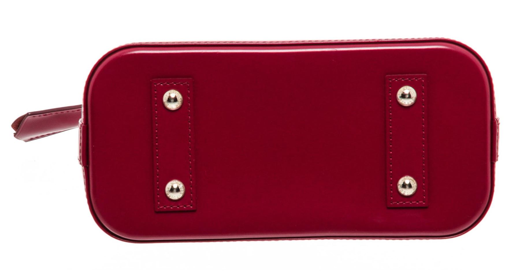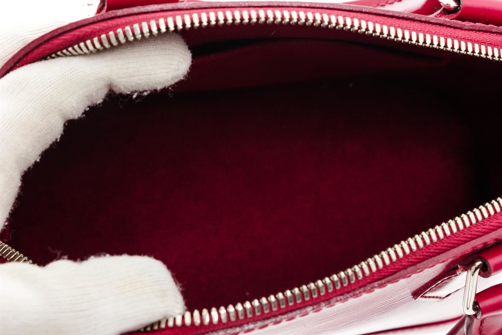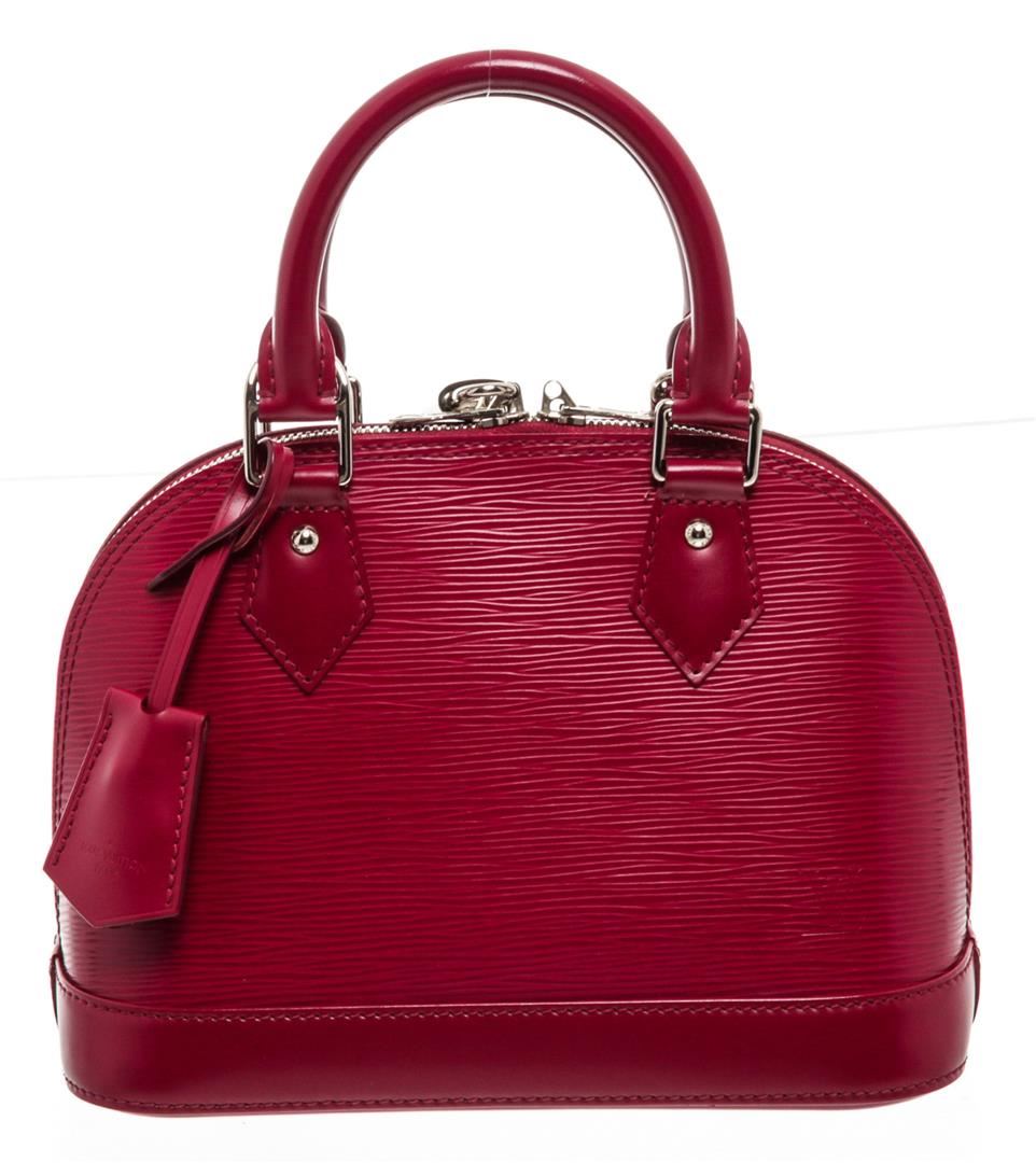 Fuchsia Epi leather Louis Vuitton Alma BB with brass hardware, dual rolled top handles, detachable flap shoulder strap, protective feet at base, tonal Alcantara lining, single slit pocket at interior wall and two-way zip closure at top. Includes clochette, lock and keys. Authentic.