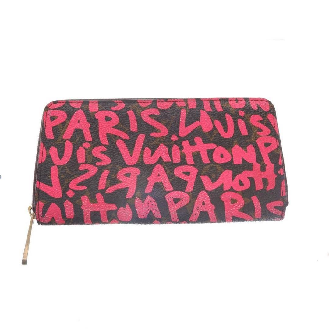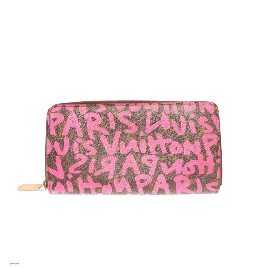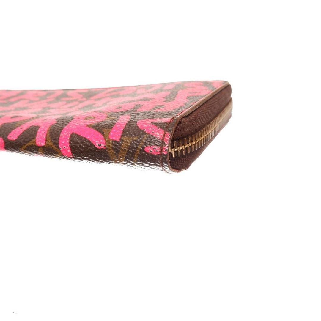 Fuchsia fluorescent graffiti monogram canvas Louis Vuitton zippy wallet with the iconic pattern overlaid, single wrap-around zip closure, pink cross-grained leather interior lining, features eight card slots, one zip coin pocket, three gusseted pockets, t