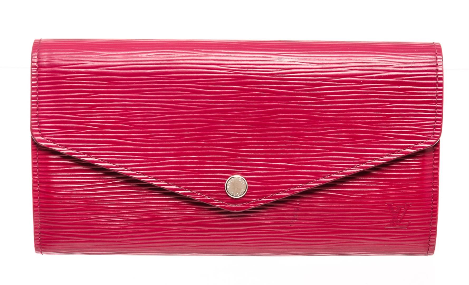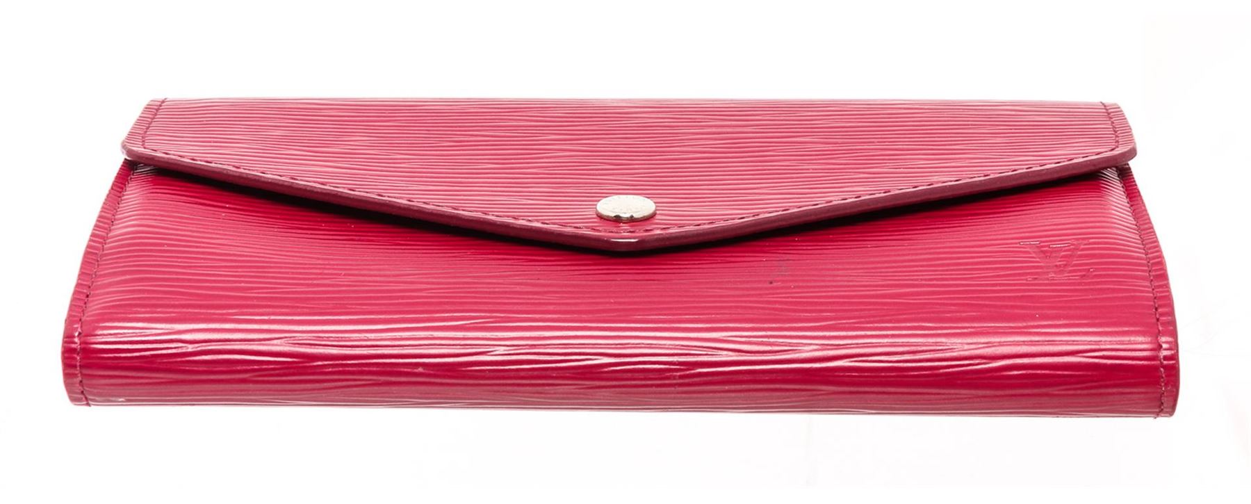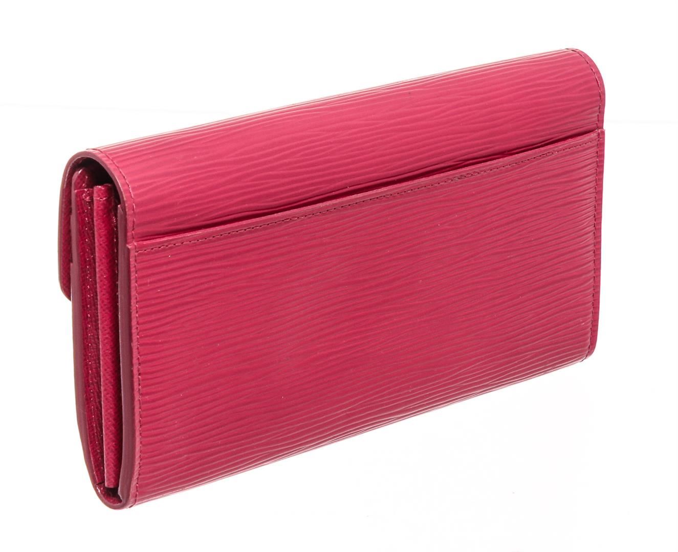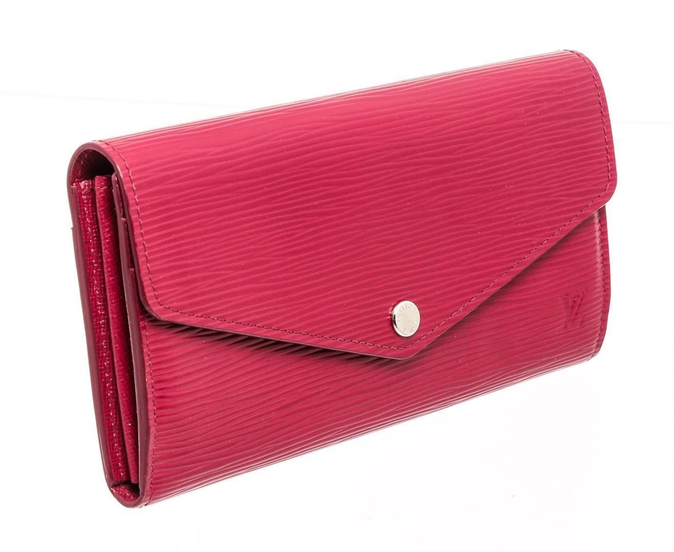 Fuschia Epi leather Louis Vuitton Sarah wallet with silver-tone hardware, embossed logo at front, single exterior slit pocket at back, four card slots under front flap, three interior compartments; one with zip closure, dual slit pockets at interior walls, twelve card slots and snap closure at front flap.