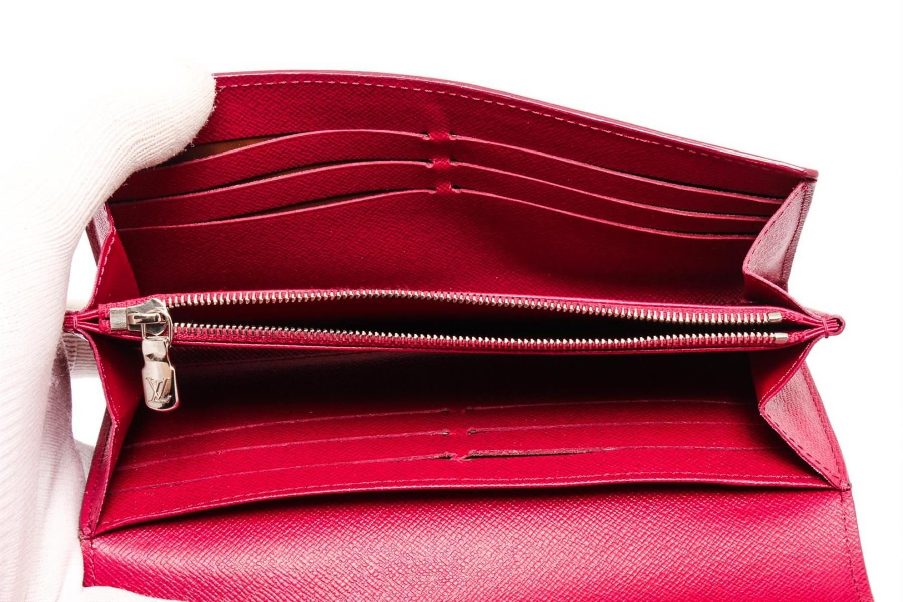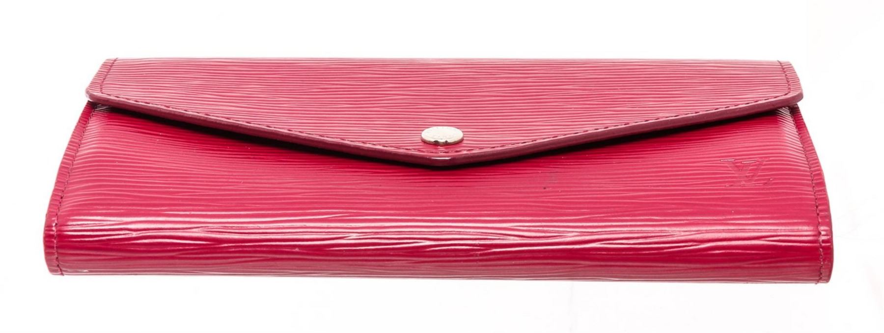 Fuschia Epi leather Louis Vuitton Sarah wallet with silver-tone hardware, embossed logo at front, single exterior slit pocket at back, four card slots under front flap, three interior compartments; one with zip closure, dual slit pockets at interior walls, twelve card slots and snap closure at front flap.