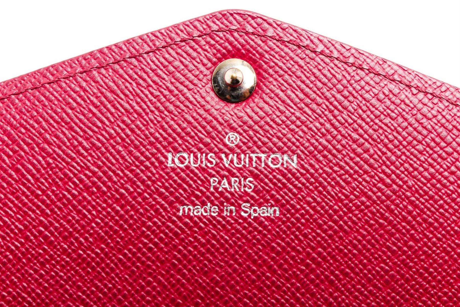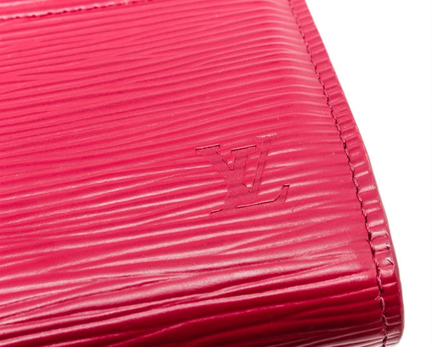 Fuschia Epi leather Louis Vuitton Sarah wallet with silver-tone hardware, embossed logo at front, single exterior slit pocket at back, four card slots under front flap, three interior compartments; one with zip closure, dual slit pockets at interior walls, twelve card slots and snap closure at front flap.