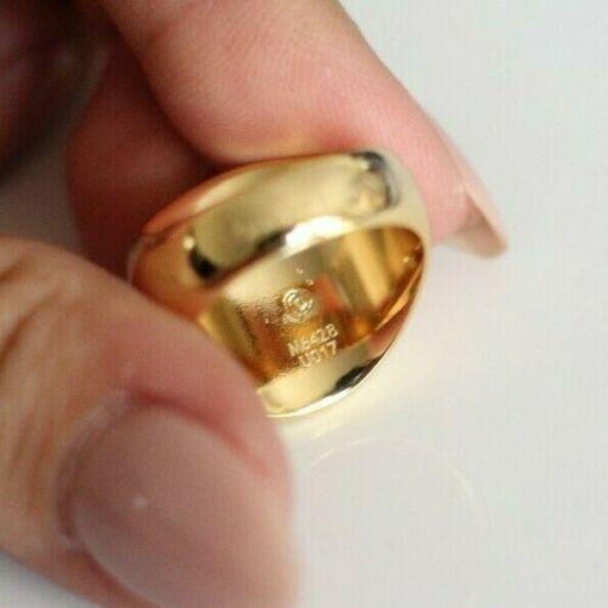 Louis Vuitton 24kt gold plated LV logo ring. Louis Vuitton Paris & logo on back, registration numbers imprinted on inside of ring. Approx size 7.