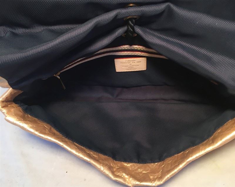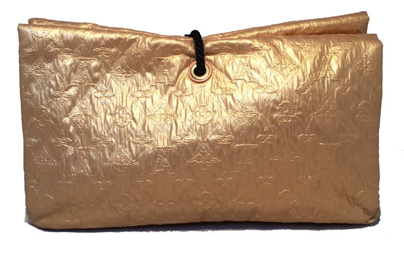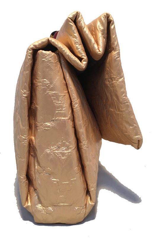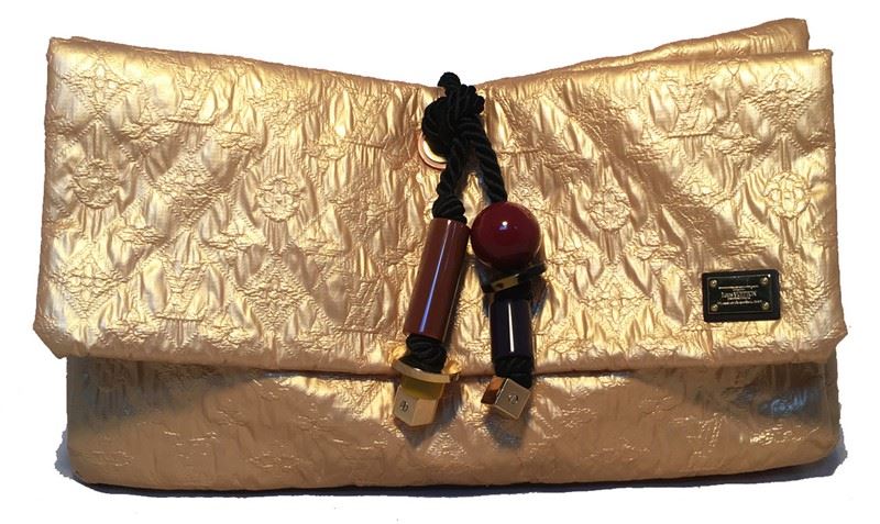 Limited Edition Louis Vuitton African Queen Masai GM Limelight Clutch in excellent condition. Gold monogram embossed leather exterior trimmed with resin beads. Front snap flap closure opens to a dark grey canvas lined interior that holds 1 side zippered pocket and ample storage space. This Masai clutch is from the 2009 runway collection and is a limited edition piece no longer made or sold. Excellent condition, no stains, smells or scuffs. Clean corners, edges, and interior. Fabulous gold leather adds a touch of glamour to any wardrobe. Perfect for collectors and Louis Vuitton lovers alike. Purchase includes a dust cover. Measurements: 13"x7"x2"Â #bags767
