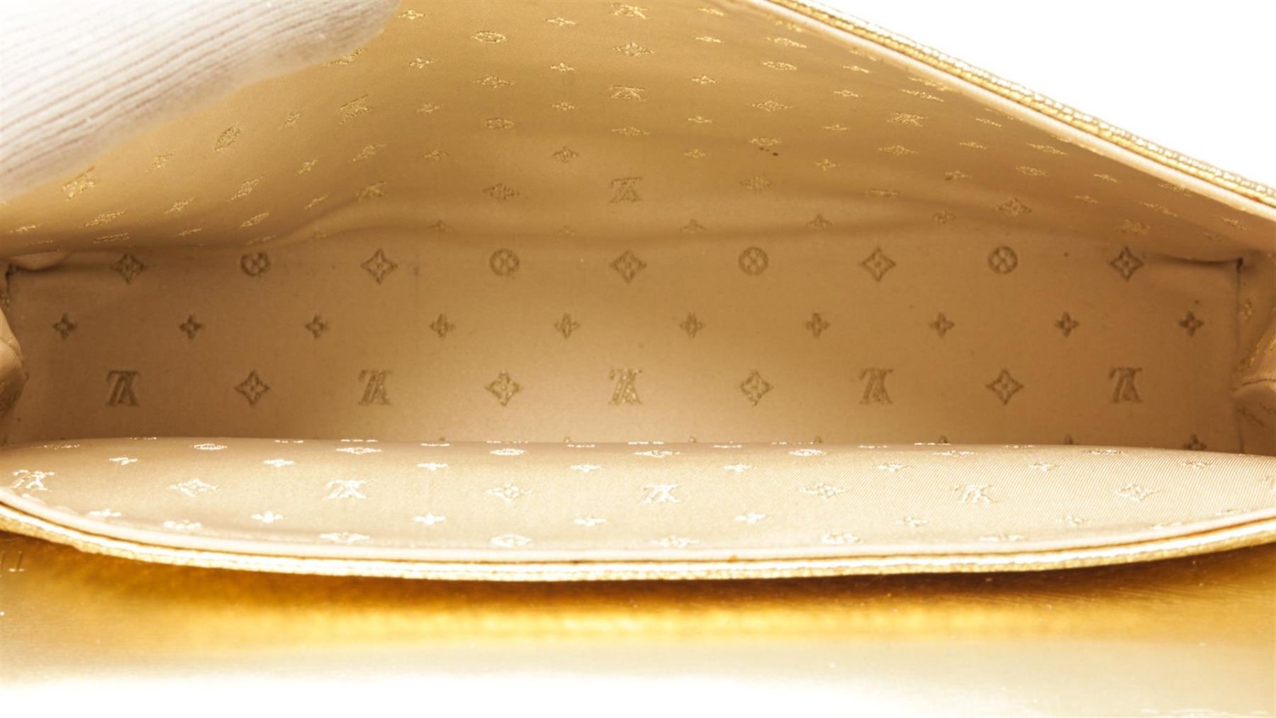 One Louis Vuitton Gold Leather Top Handle Bag. Item is sold AS-IS. All available information is listed in the description and shown in the photo. Louis Vuitton Top Handle Bag with louis vuitton top handle bag with gold leather, gold-tone hardware, flat handle, logo jacquard lining, push-lock closure at front. There are some stains on the exterior leather. Handle Drop: 6", Height: 5.75", Width: 8.75", Depth: 2" / Handle Drop: 15.24, 14.6 x 22.2 x 5.08 CM
