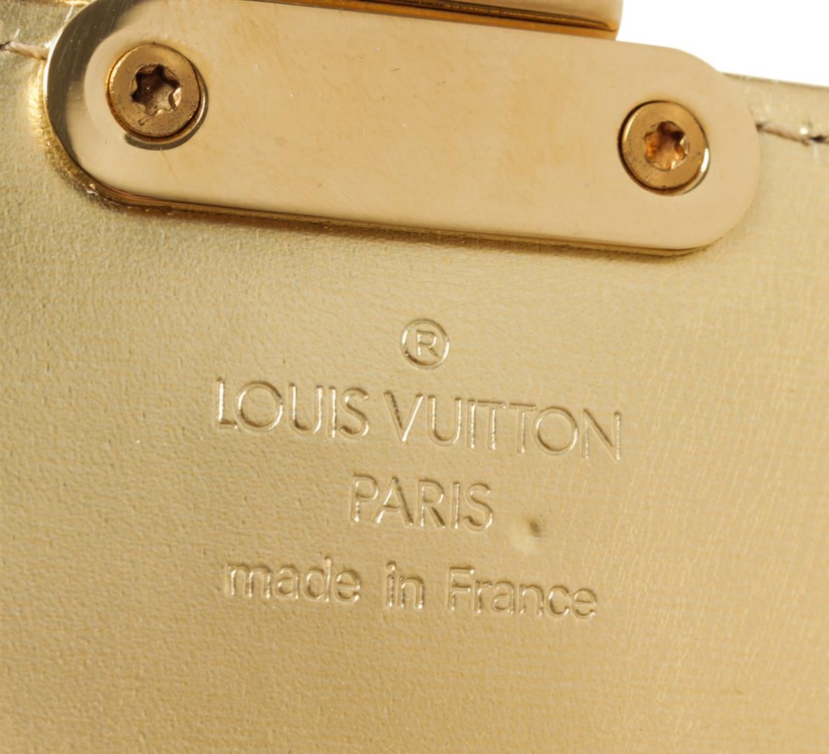 One Louis Vuitton Gold Leather Top Handle Bag. Item is sold AS-IS. All available information is listed in the description and shown in the photo. Louis Vuitton Top Handle Bag with louis vuitton top handle bag with gold leather, gold-tone hardware, flat handle, logo jacquard lining, push-lock closure at front. There are some stains on the exterior leather. Handle Drop: 6", Height: 5.75", Width: 8.75", Depth: 2" / Handle Drop: 15.24, 14.6 x 22.2 x 5.08 CM