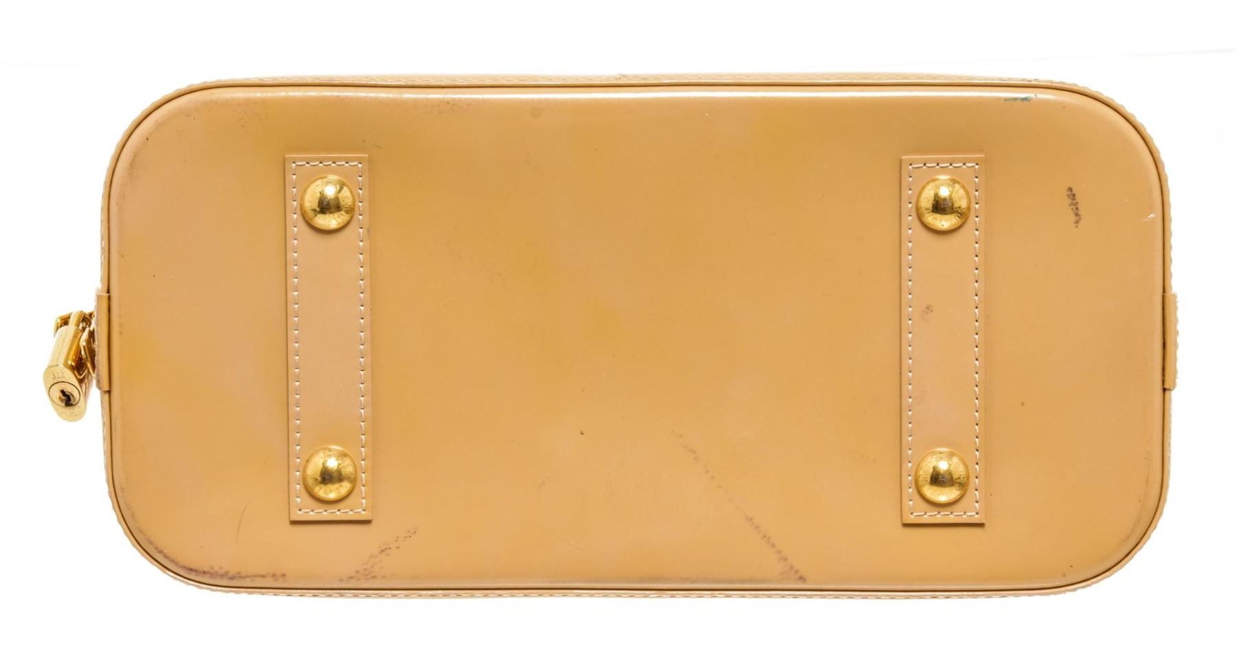 One Louis Vuitton Gold Monogram Vernis Alma PM Handbag. Item is sold AS-IS. All available information is listed in the description and shown in the photo. Louis Vuitton Gold Monogram Vernis Alma PM Handbag with monogram vernis, brass hardware, rolled handles, canvas lining & dual interior pockets,zip closure at top, protective feet at base, includes dust bag, lock & keys Height: 9.25" Width: 12.25" Depth: 6", Handle Drop: 3.5" / 23.49 x 31.1 x 15.24 Cm