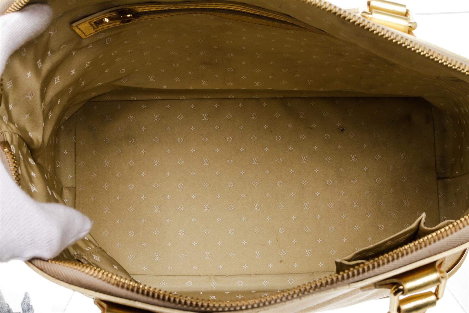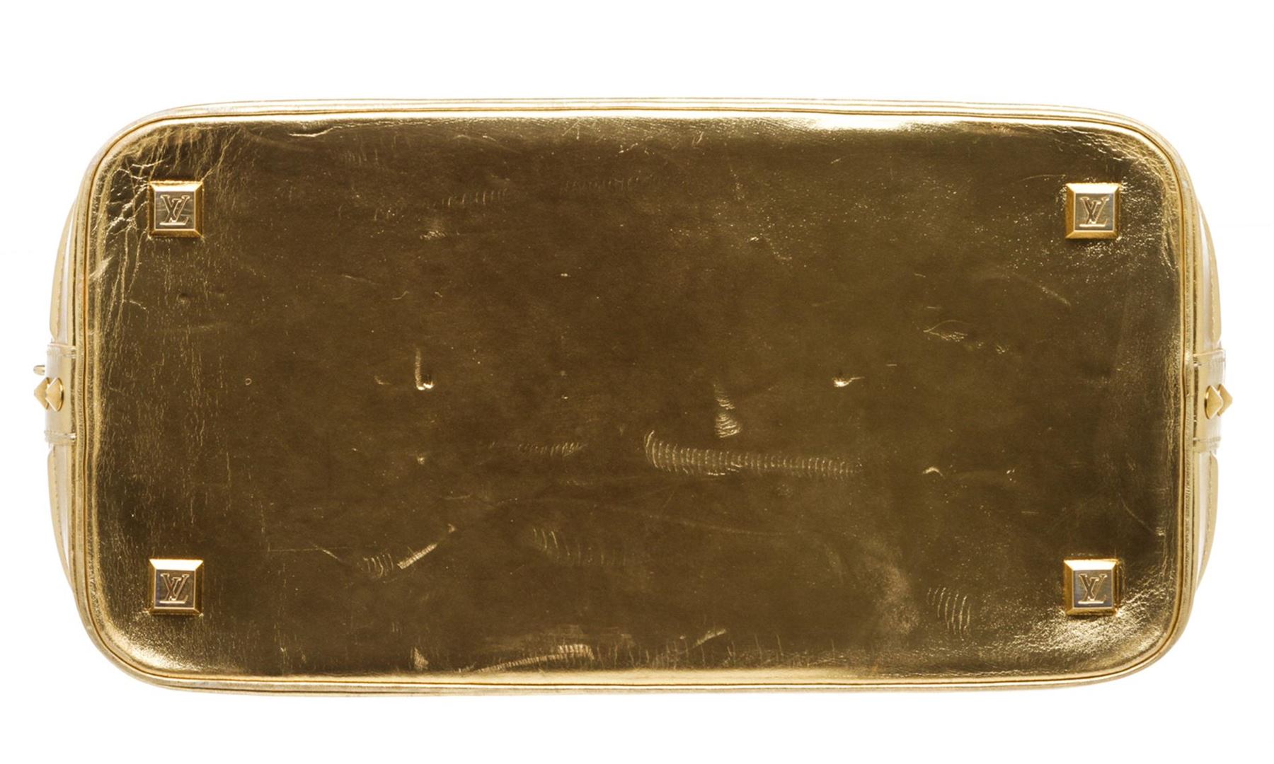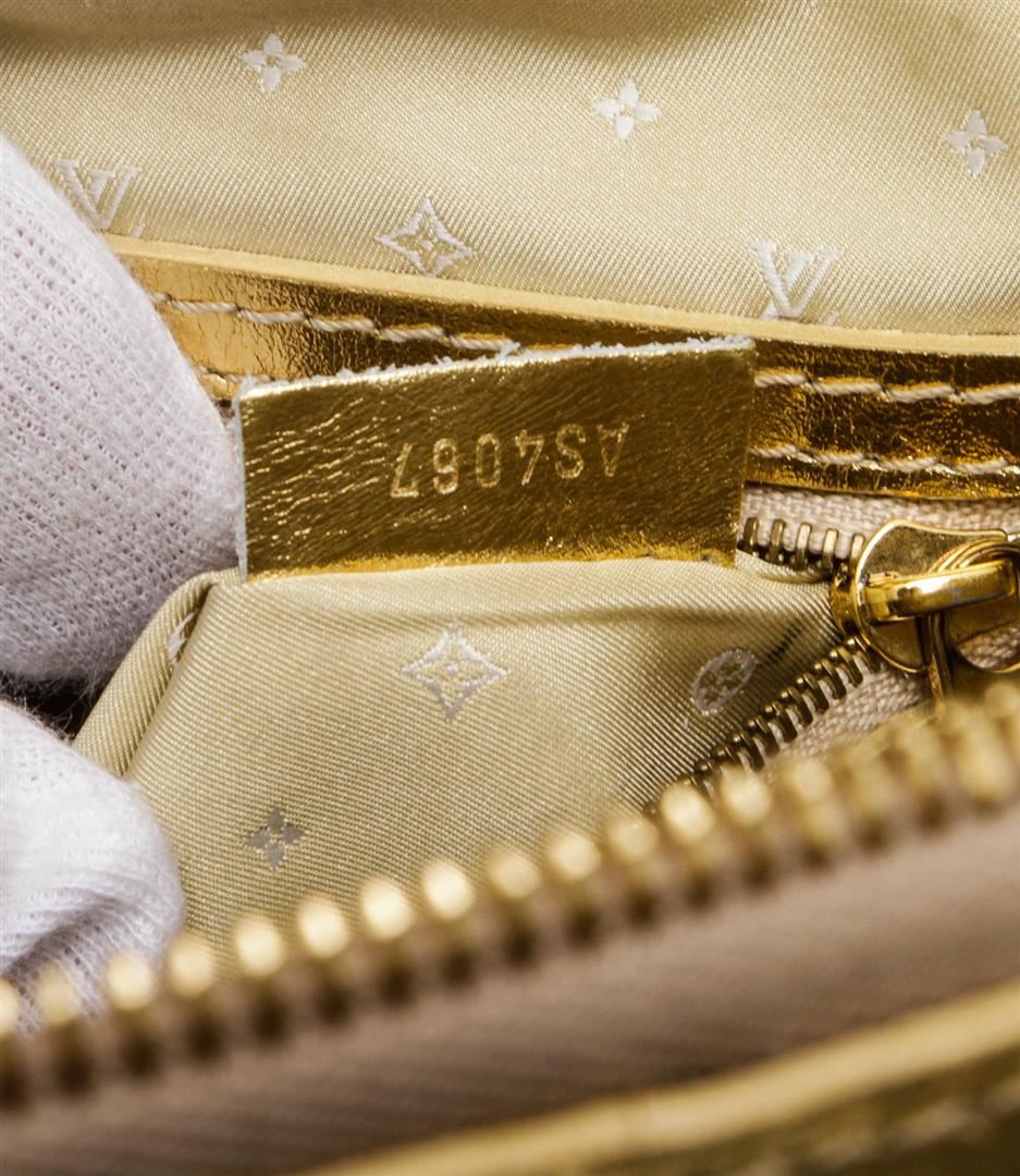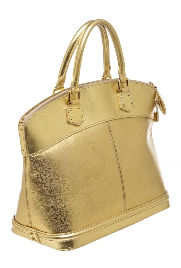 One Louis Vuitton Gold Suhali Leather Lockit MM Tote Handbag. Metallic Gold Suhali leather Louis Vuitton Lockit MM with brass hardware, dual rolled top handles, embossed logo at front, protective feet at base, tonal monogram jacquard lining, two interior pockets; one with zip closure, cell phone pocket and zip closure at top of bag. MKR