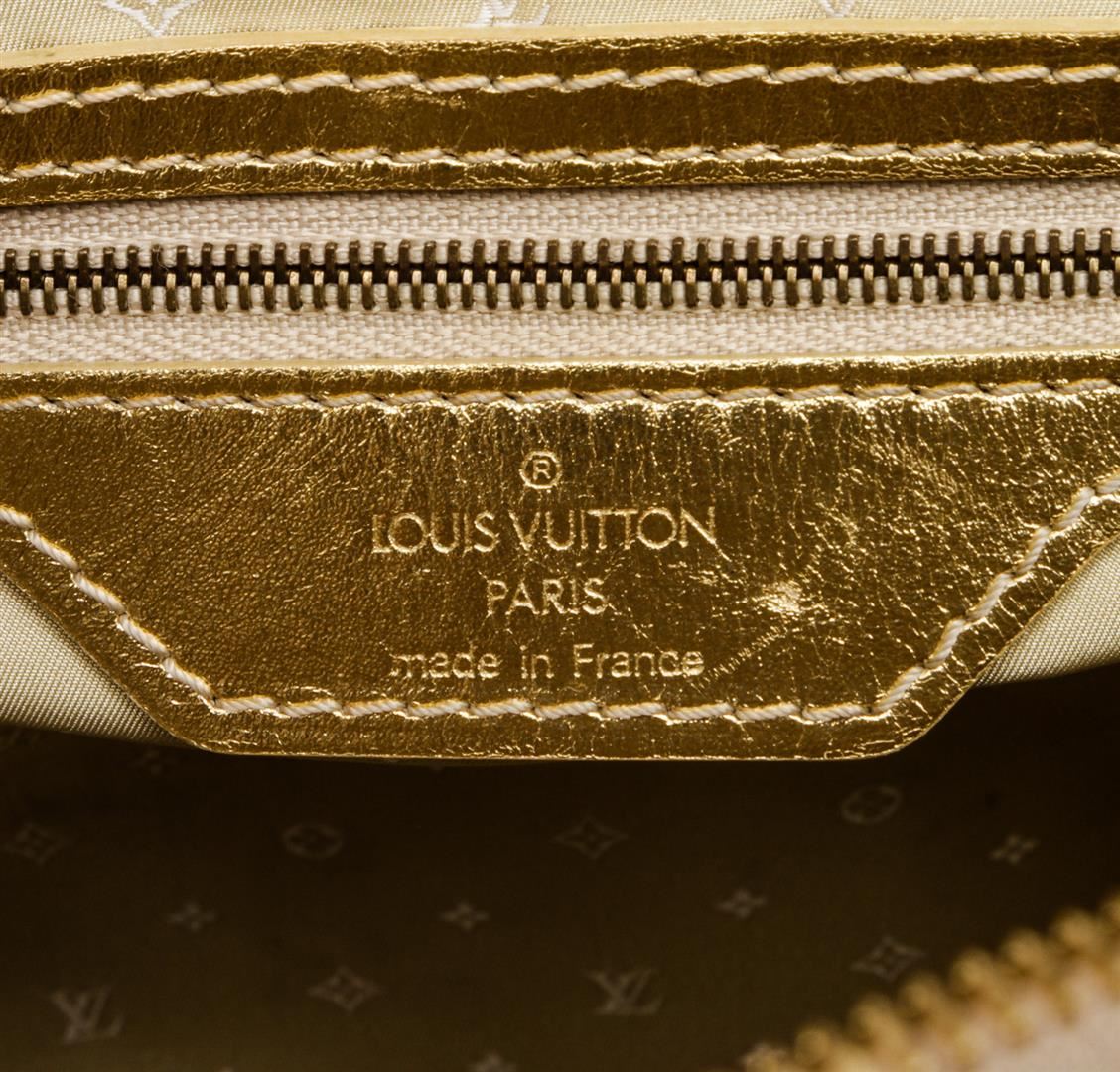One Louis Vuitton Gold Suhali Leather Lockit MM Tote Handbag. Metallic Gold Suhali leather Louis Vuitton Lockit MM with brass hardware, dual rolled top handles, embossed logo at front, protective feet at base, tonal monogram jacquard lining, two interior pockets; one with zip closure, cell phone pocket and zip closure at top of bag. MKR