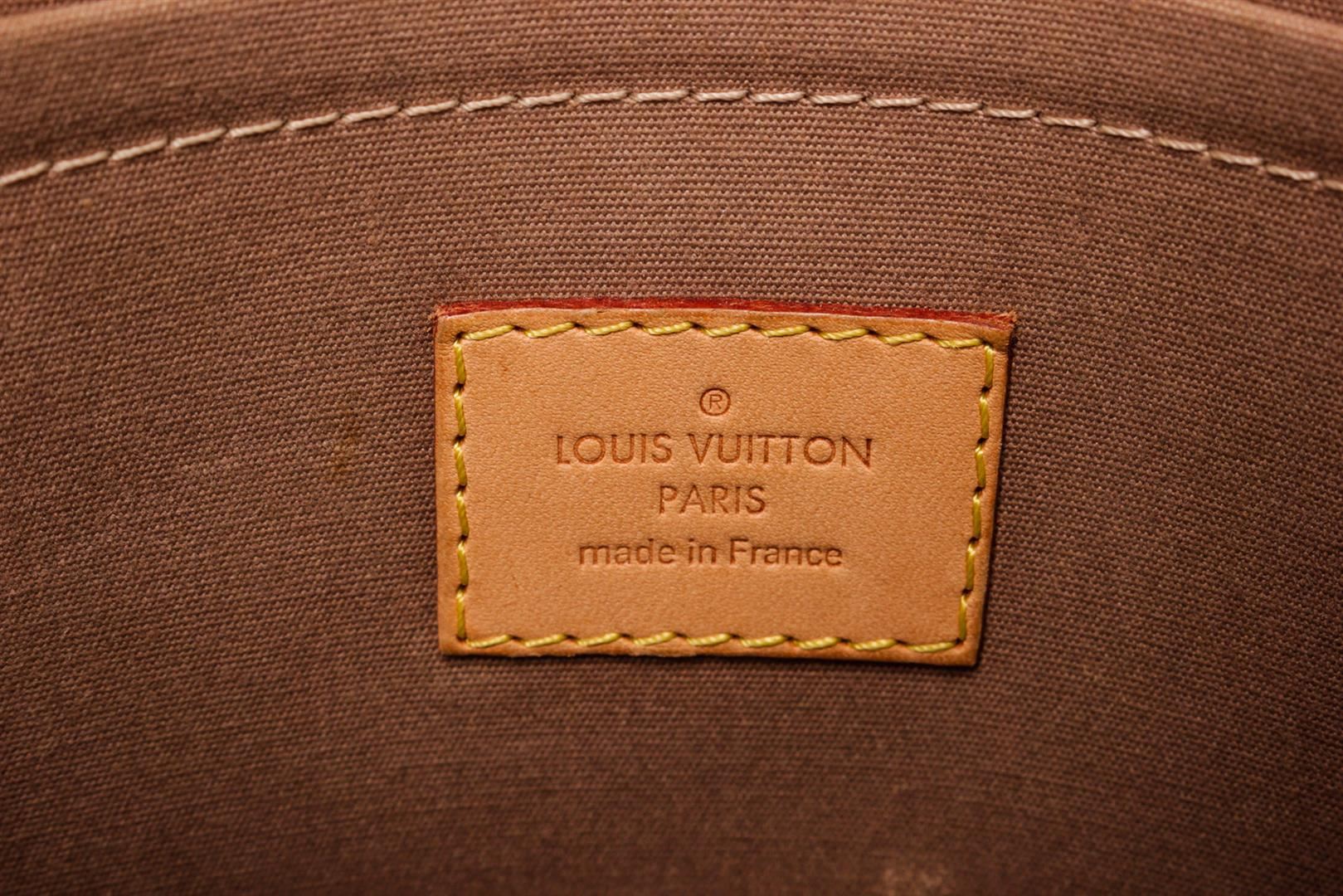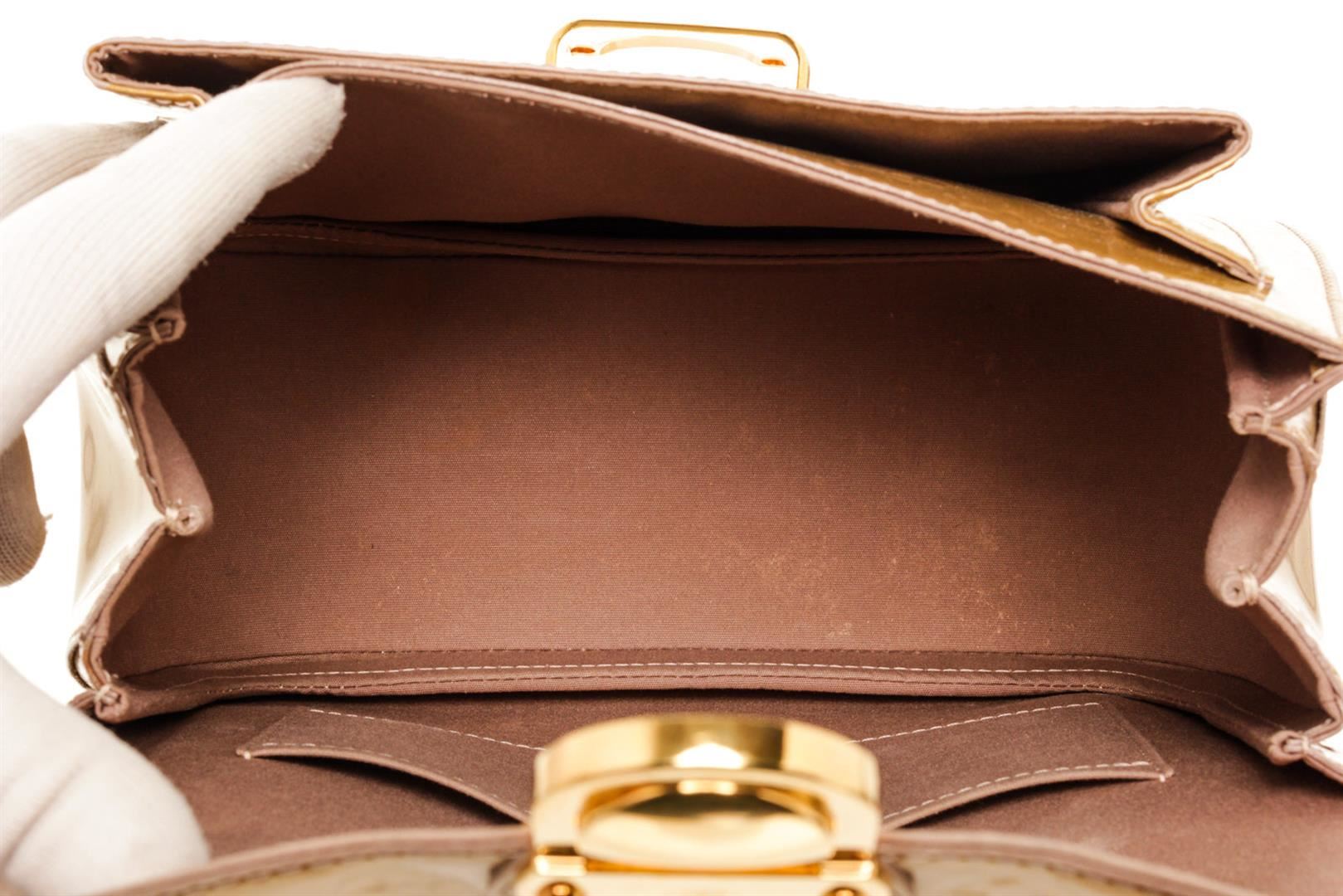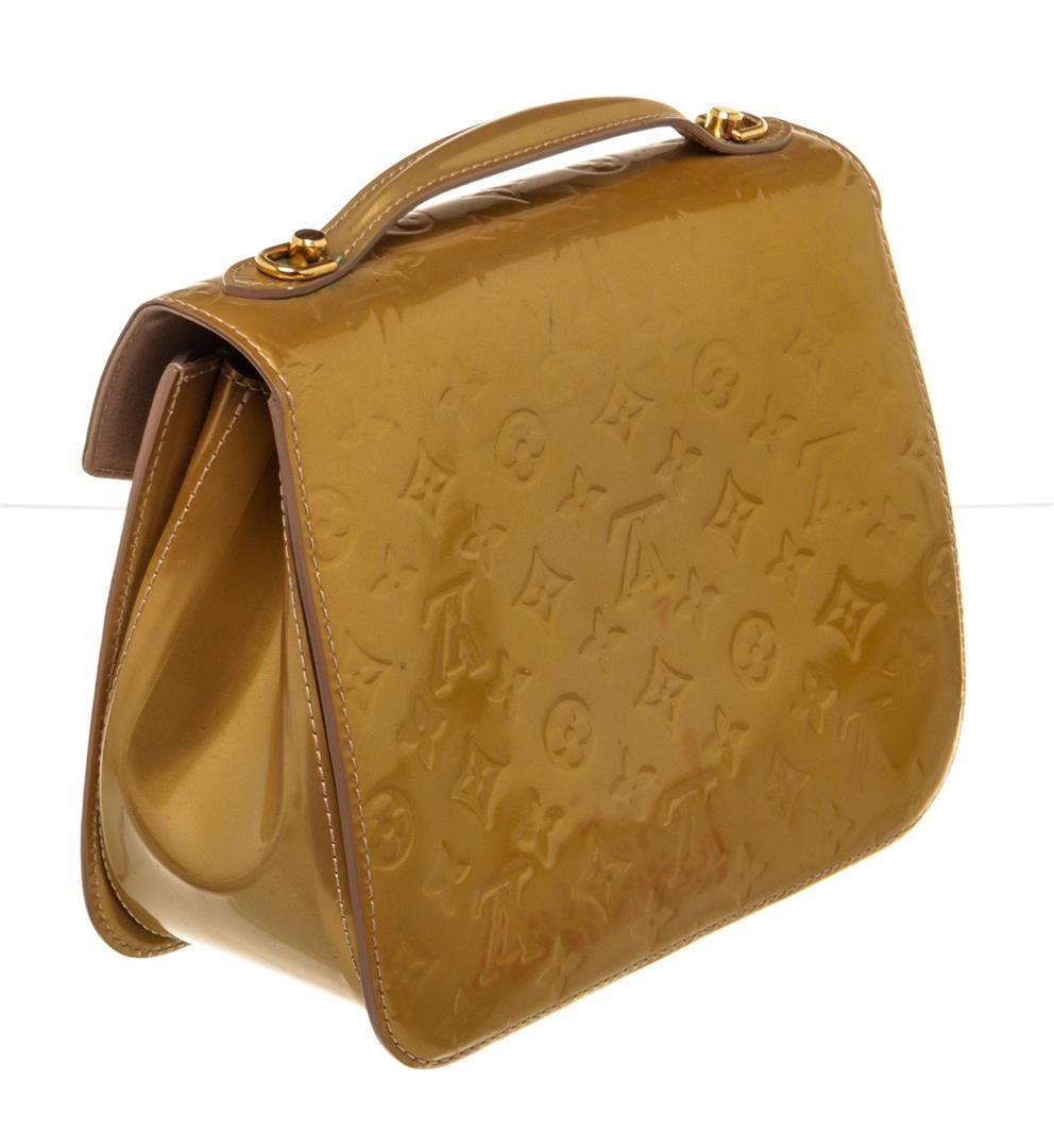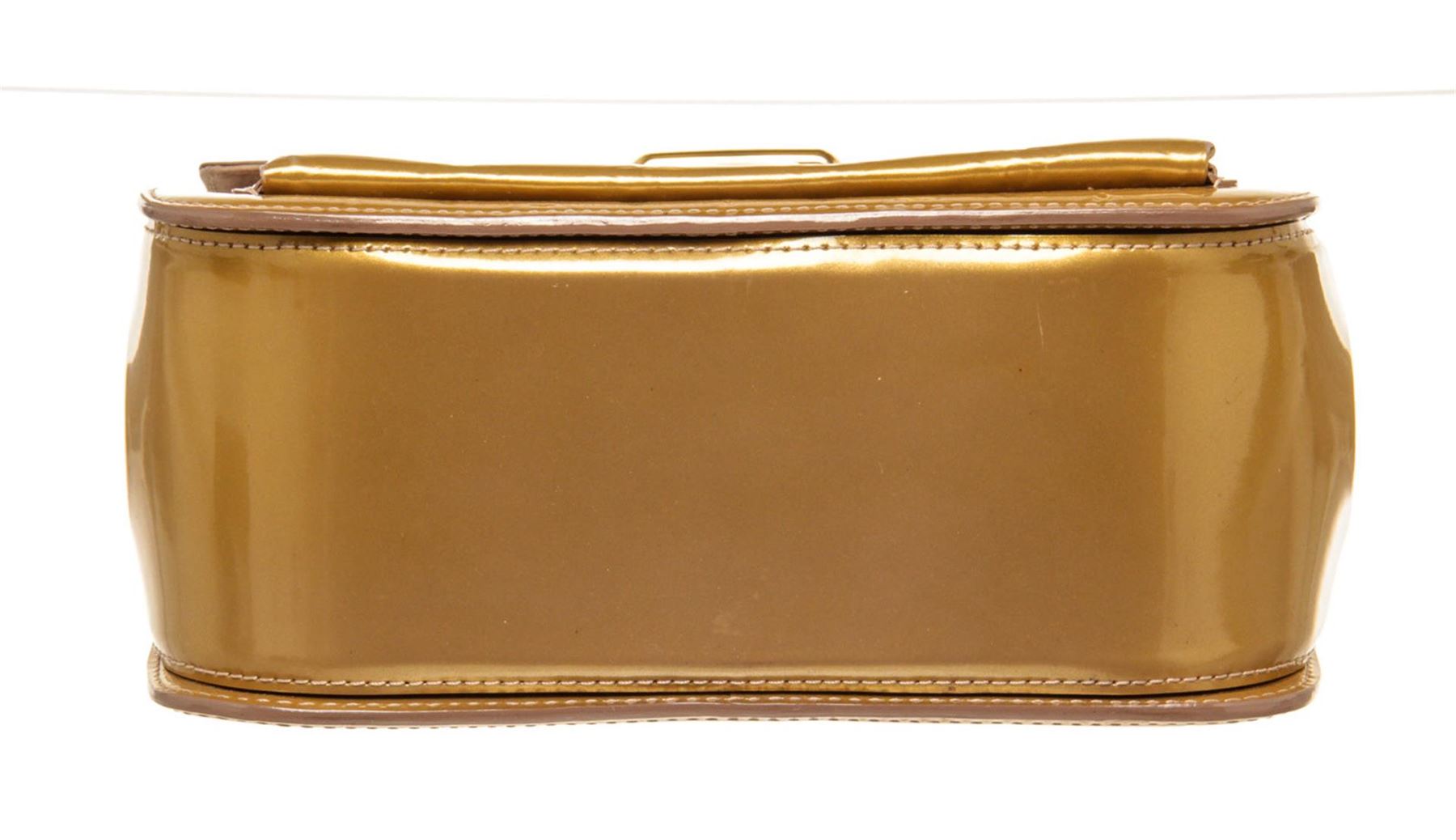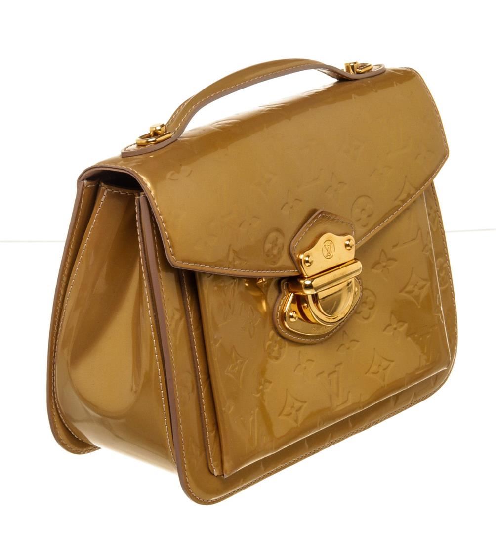 Louis Vuitton Gold Vernis Miranda Satchel Bag with material vernis leather, gold-tone hardware, trim tan vachetta leather, interior slip pockets, top handle and push lock closure.