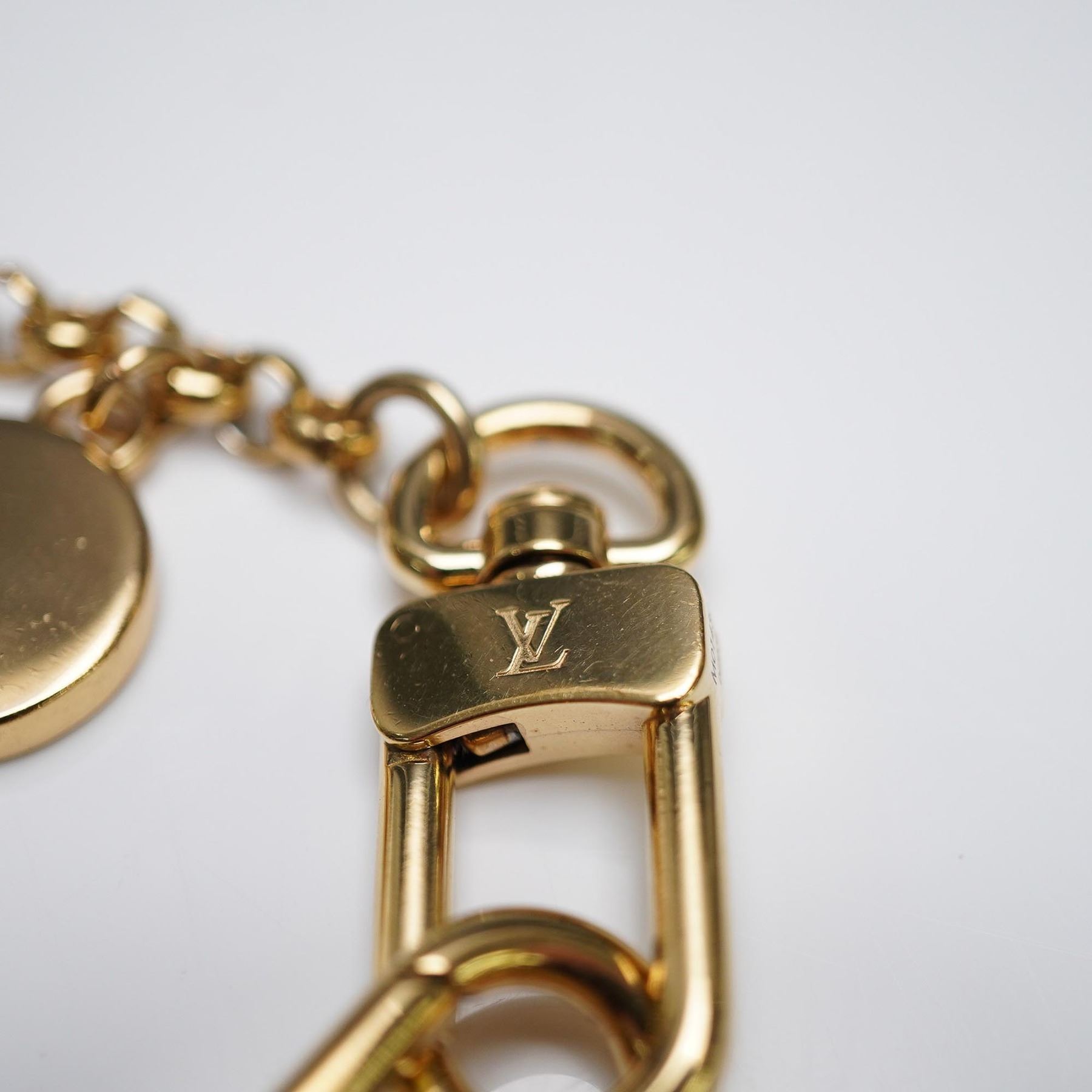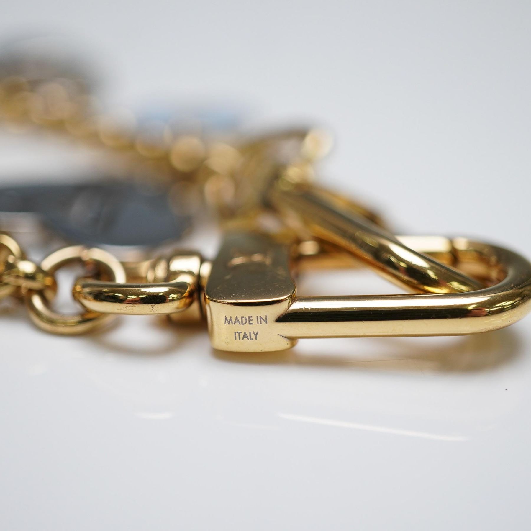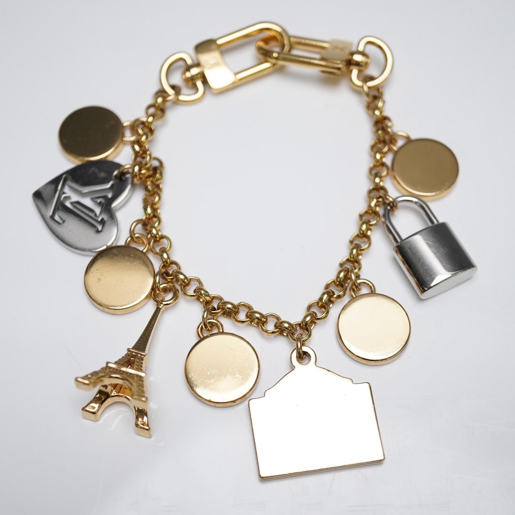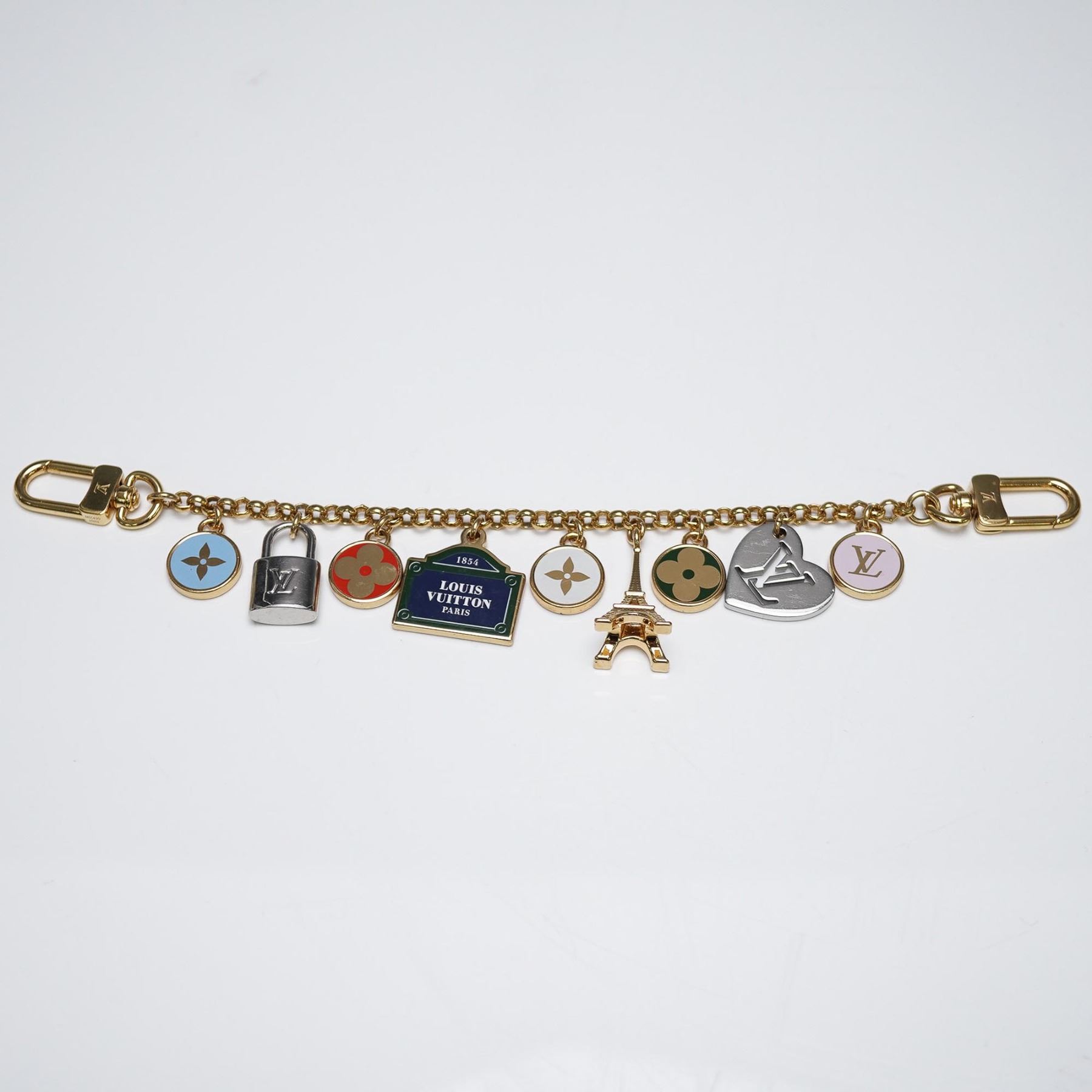 This design features nine attached charms, including four LV Flower motifs in blue, red, white, and green enamel; a silver-tone lock with LV engraving; a gold-tone Eiffel Tower; a silvery heart-shaped charm with the LV monogram; and a gold-framed sign in blue and green enamel reading "1854 Louis Vuitton Paris." The charms are suspended from a gold-finish chain fitted with two lobster claw clasps, each engraved with the LV logo. The piece is marked "Made in Italy" on the hardware. Designed for use as a decorative bag charm or a key holder. M01430.