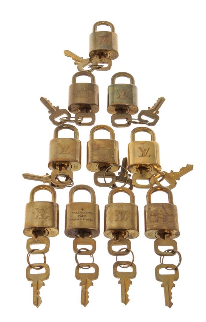 Louis Vuitton Lock Key Set consists of 10 padlocks with gold-tone hardware.
