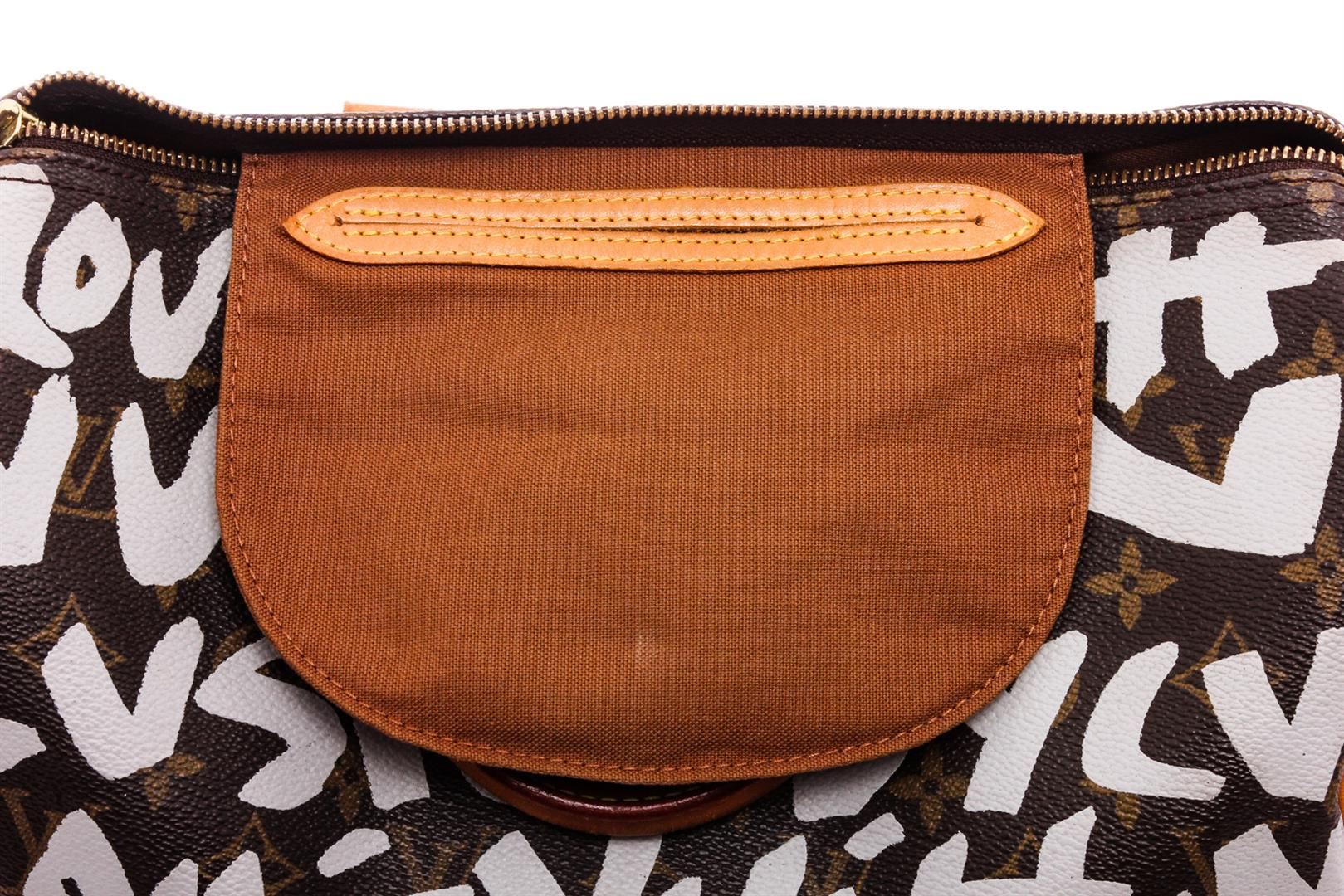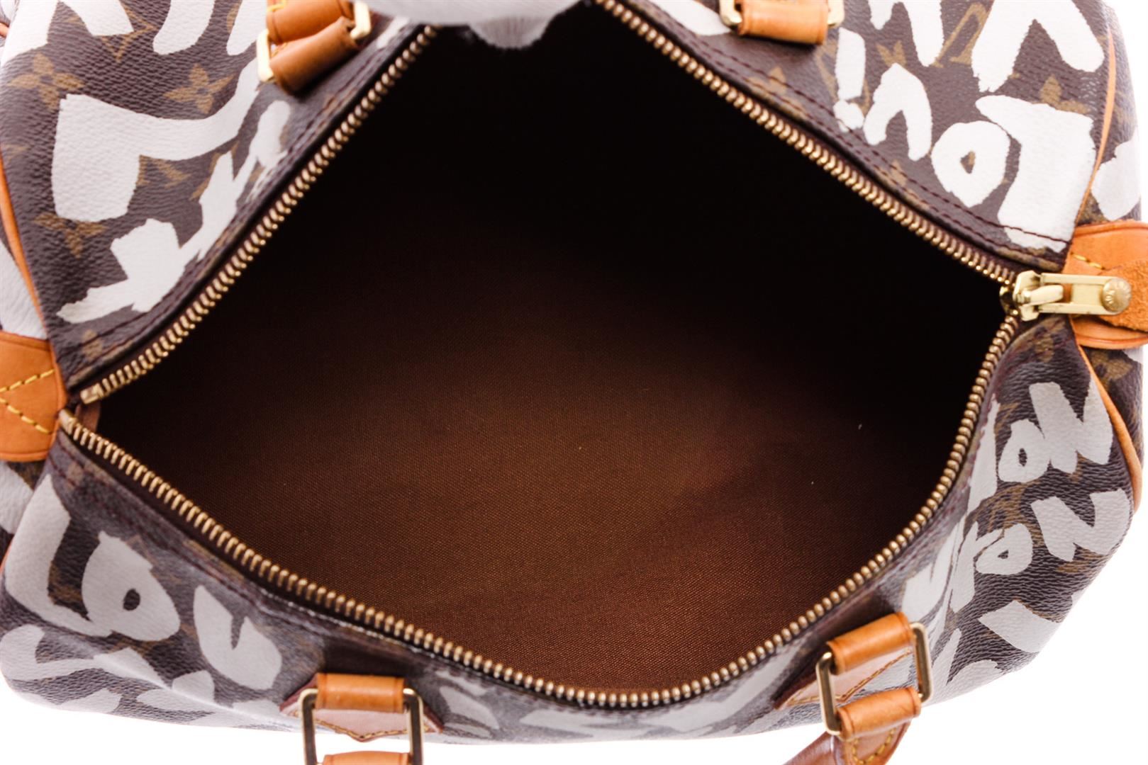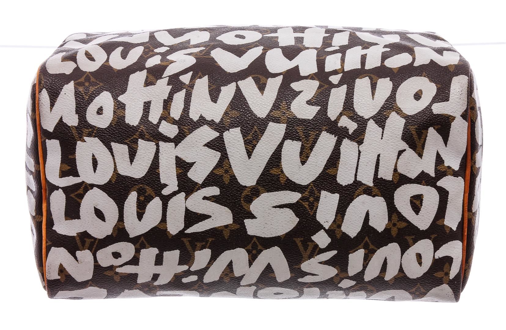 One Louis Vuitton Gray Graffiti Monogram Canvas Leather Stephen Sprouse Speedy 30 cm Bag. From the Stephen Sprouse collection. Gray graffiti and brown monogram coated canvas Louis Vuitton speedy with brass hardware, tan vachetta leather trim, dual rolled top handles, brown canvas lining, single slit pocket at interior wall and zip closure at top.