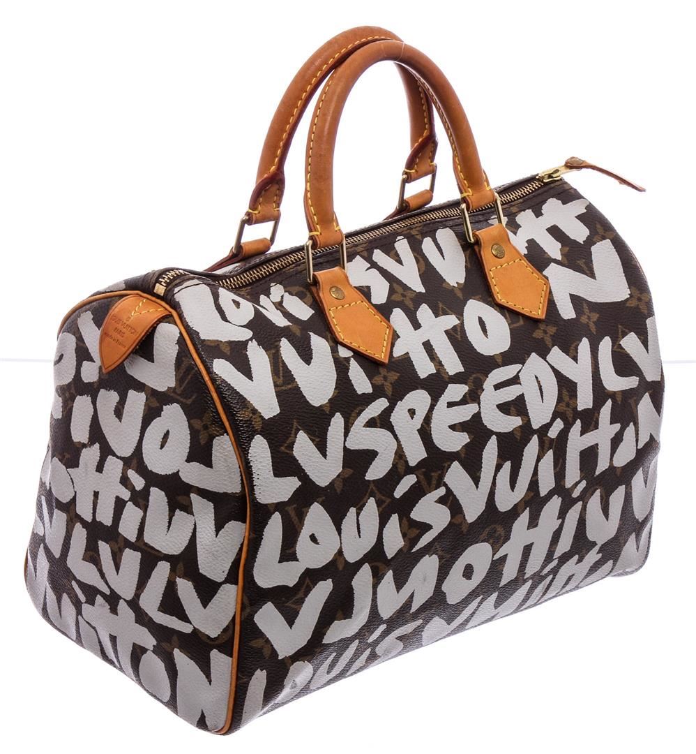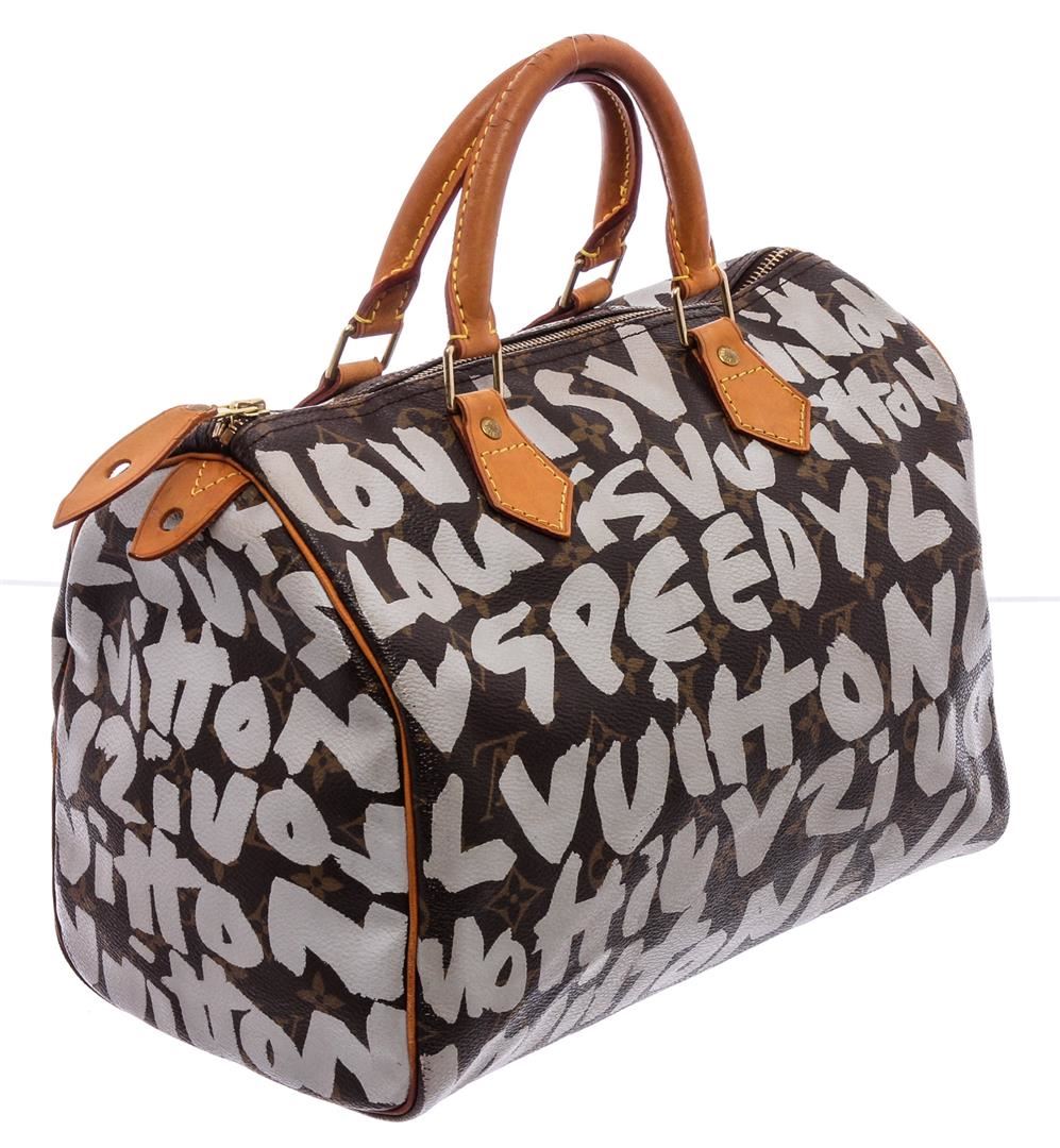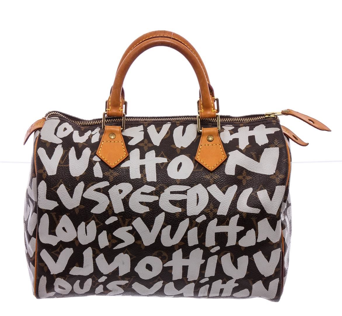 One Louis Vuitton Gray Graffiti Monogram Canvas Leather Stephen Sprouse Speedy 30 cm Bag. From the Stephen Sprouse collection. Gray graffiti and brown monogram coated canvas Louis Vuitton speedy with brass hardware, tan vachetta leather trim, dual rolled top handles, brown canvas lining, single slit pocket at interior wall and zip closure at top.