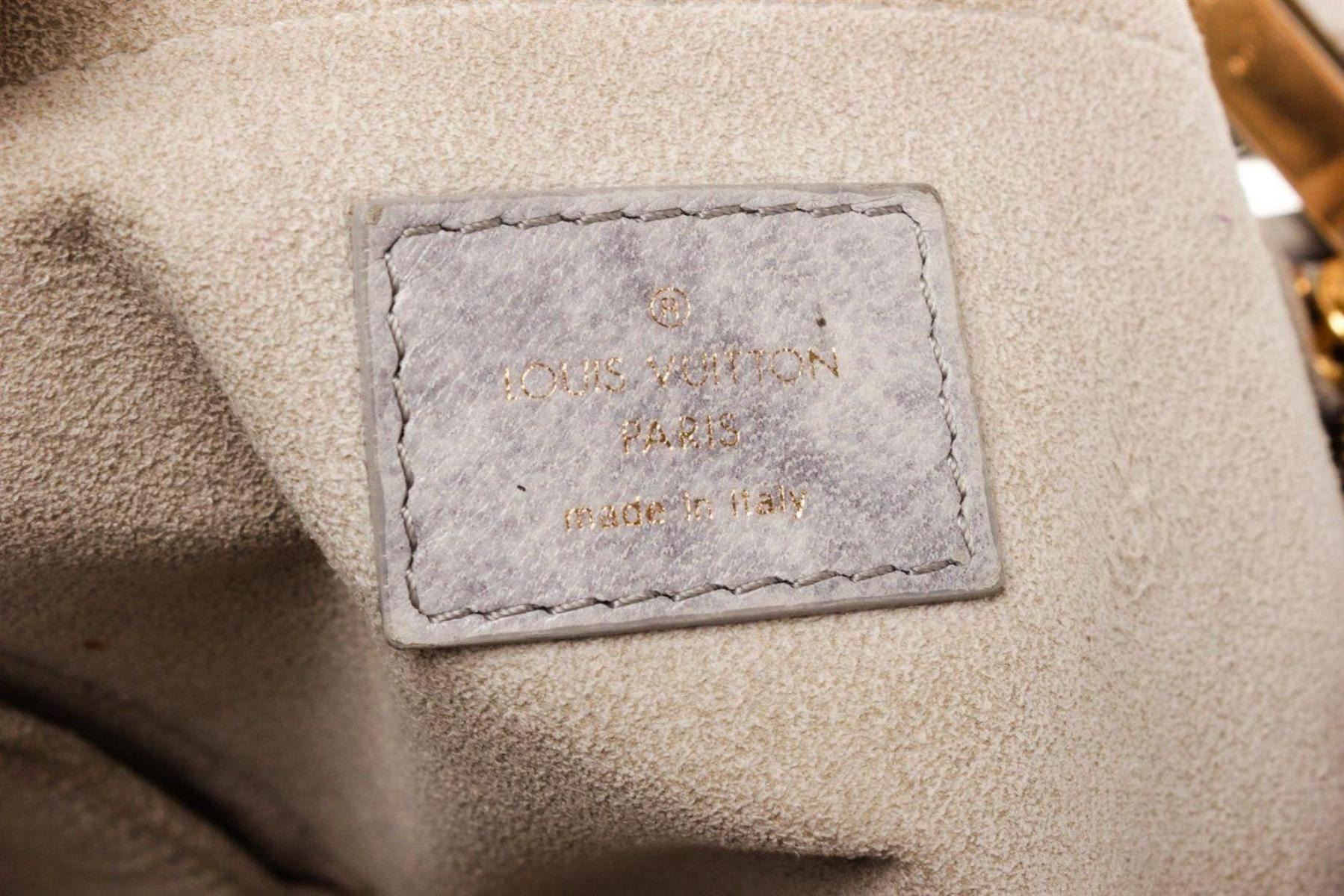 Louis Vuitton Gray Olympe Nimbus PM Hobo Bag with material monogram, gold-tone hardware, trim tan vachetta leather, interior slip pocket, dual top handle, shoulder strap and zipper closure.