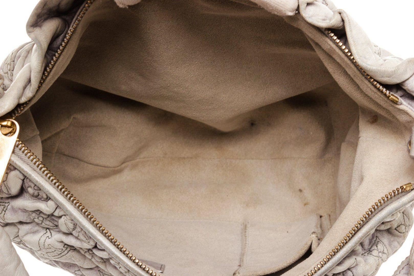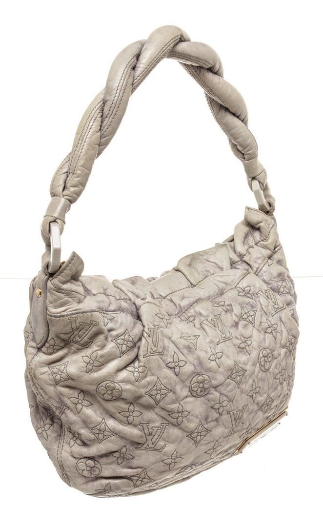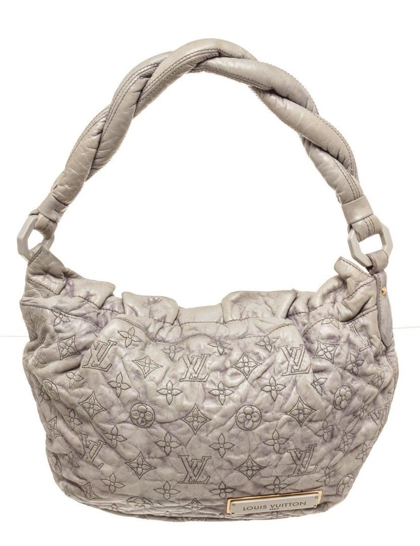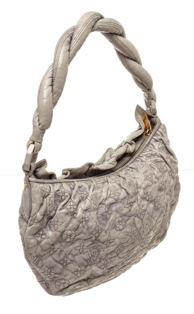 Louis Vuitton Gray Olympe Nimbus PM Hobo Bag with material monogram, gold-tone hardware, trim tan vachetta leather, interior slip pocket, dual top handle, shoulder strap and zipper closure.