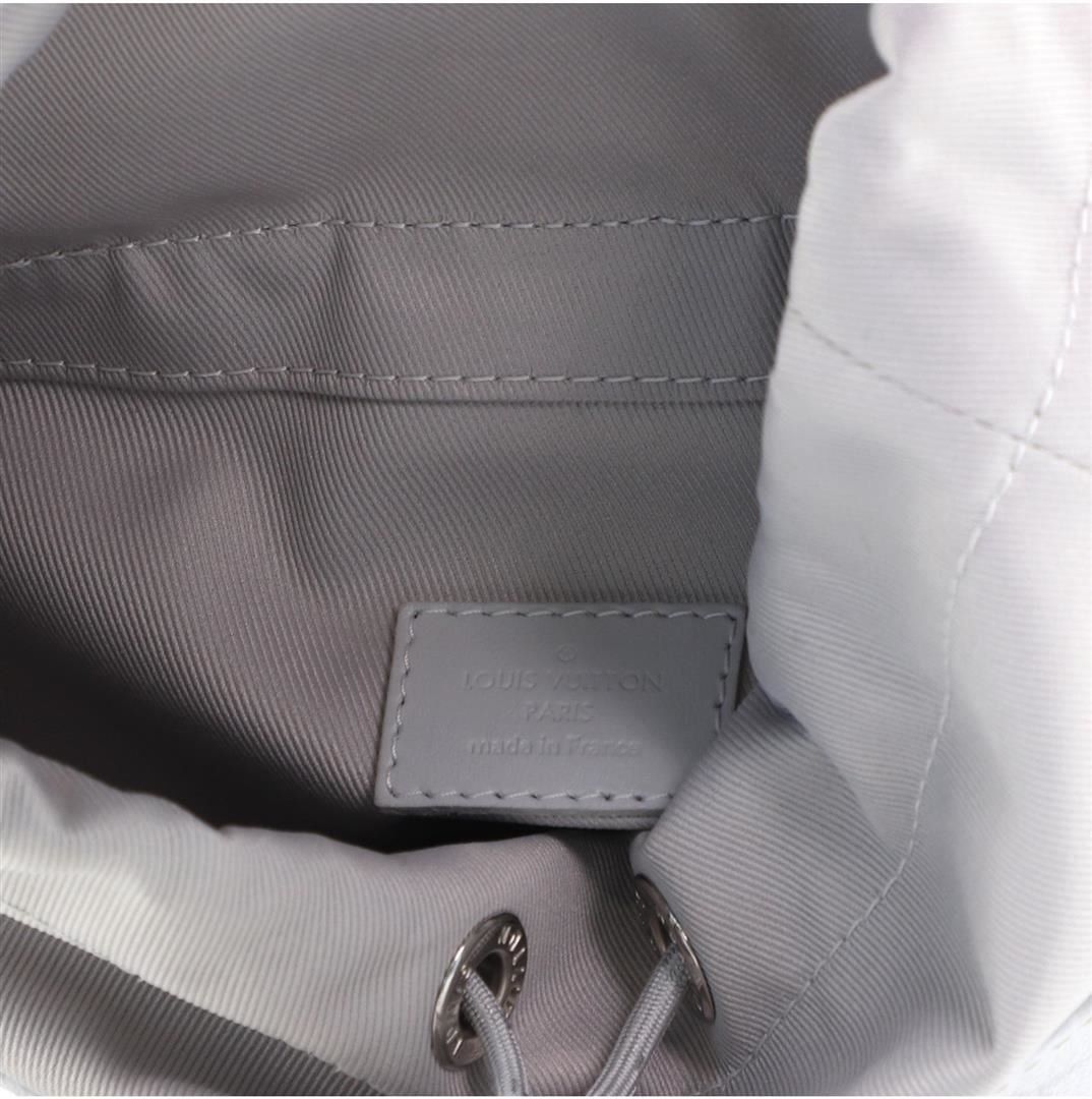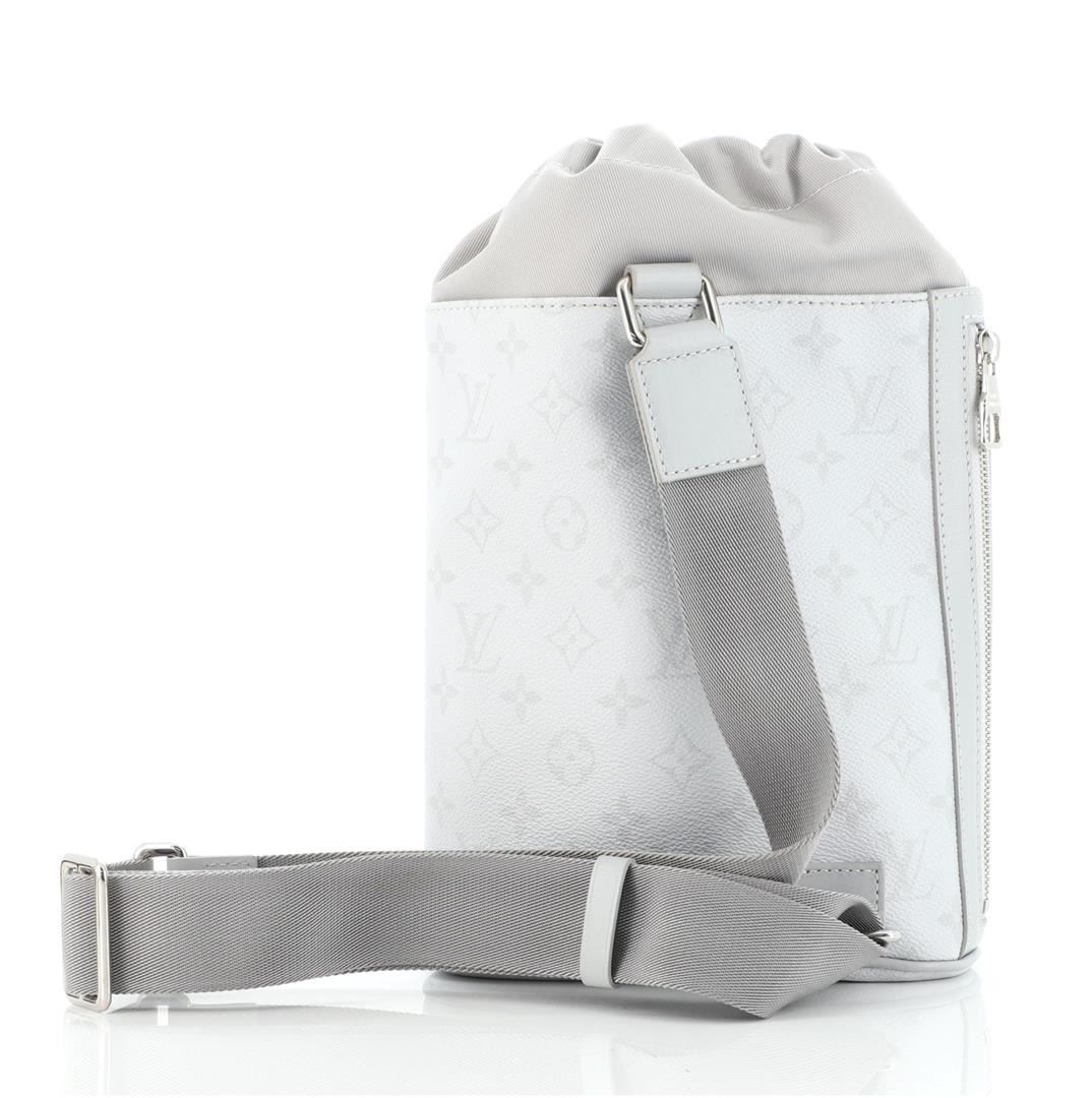 Louis Vuitton White Grey Leather Chalk Sling Bag features gray Monogram coated canvas and multicolor print, gray fabric interior, drawstring closure on top, adjustable strap, external side pocket with zipper and silver-tone hardware.