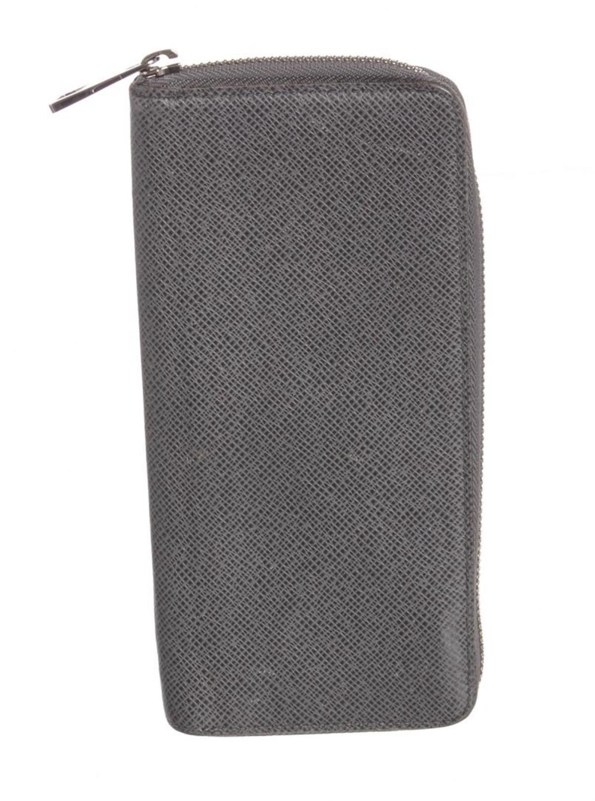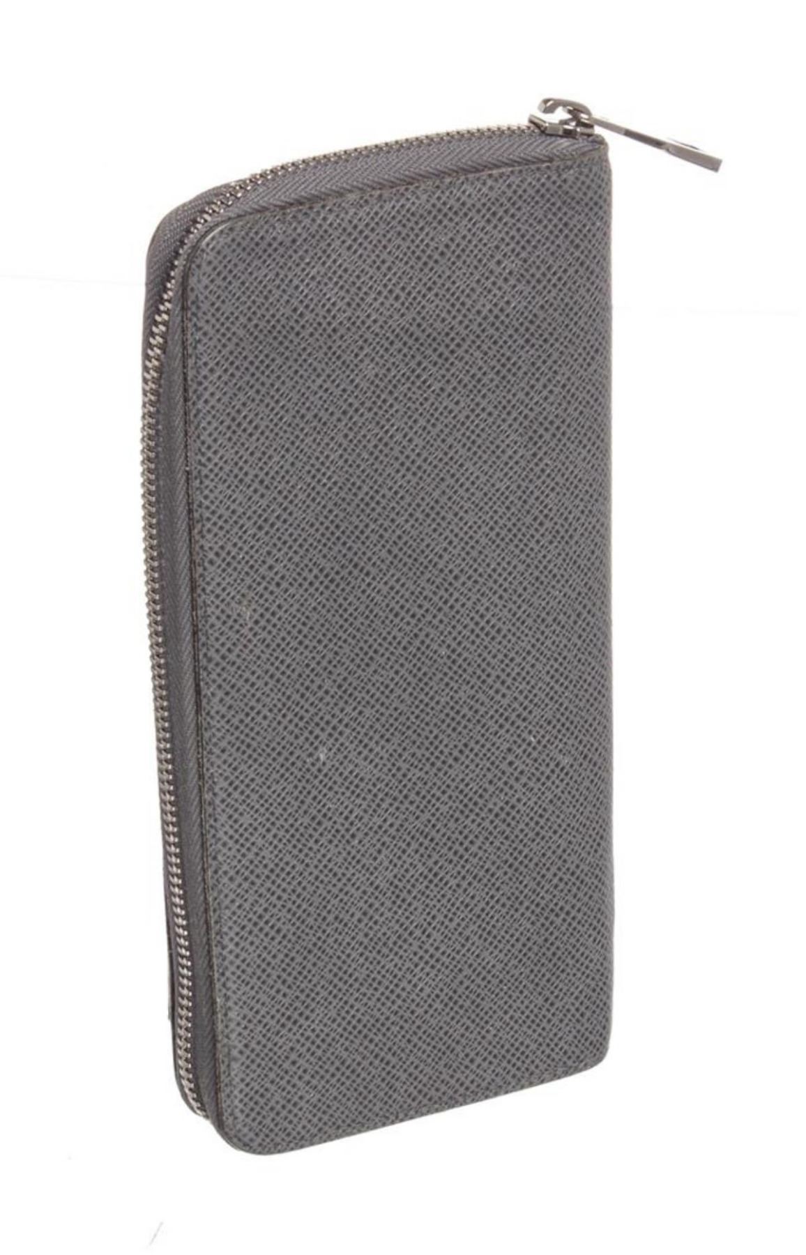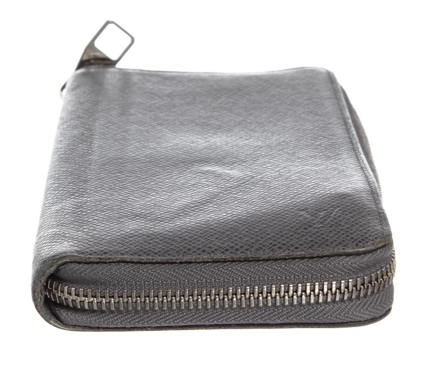 Louis Vuitton gray Taiga leather Vertical Zippy wallet with silver-tone hardware, four interior vertical pockets, one with zipper, ten card slots, zip around closure.