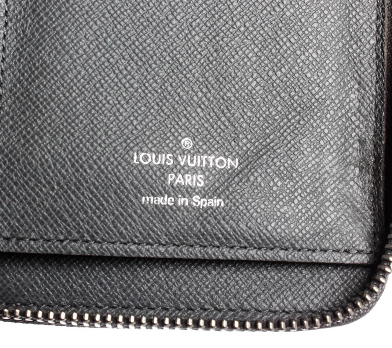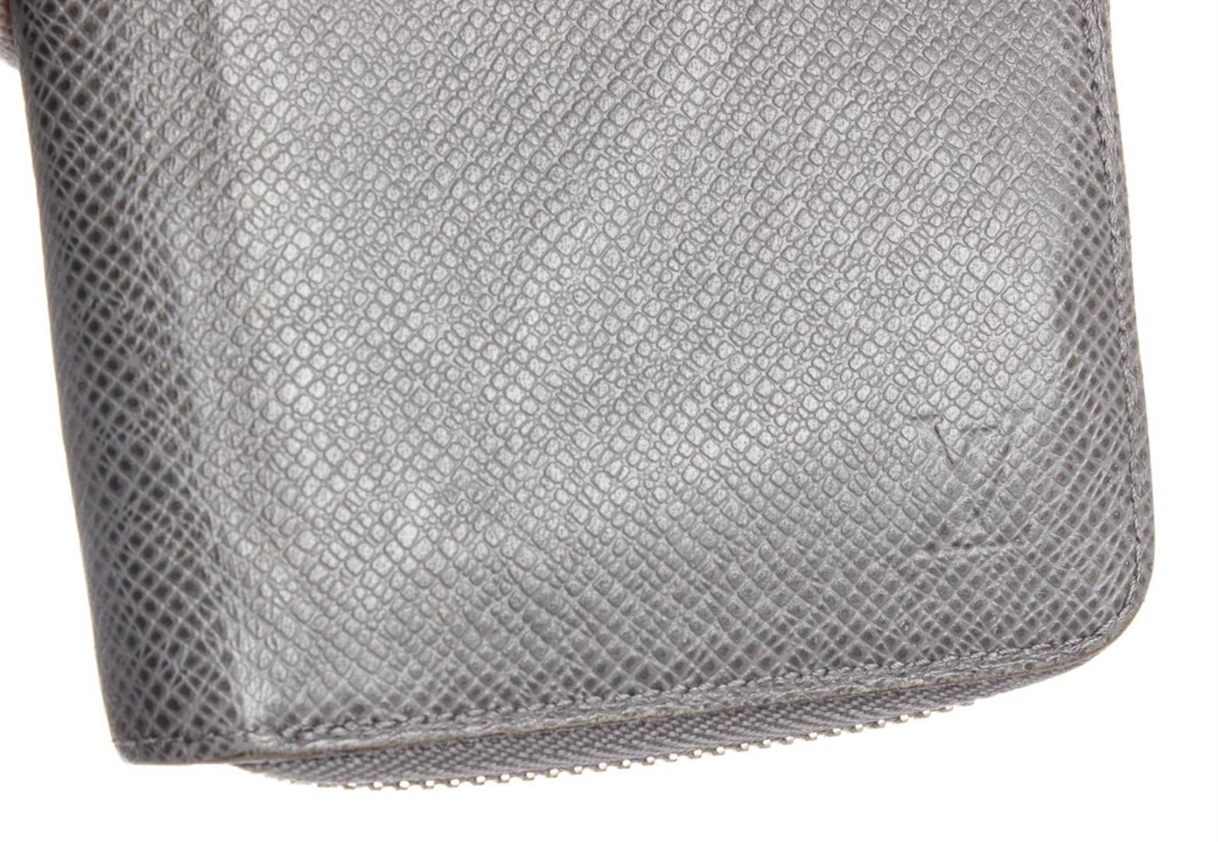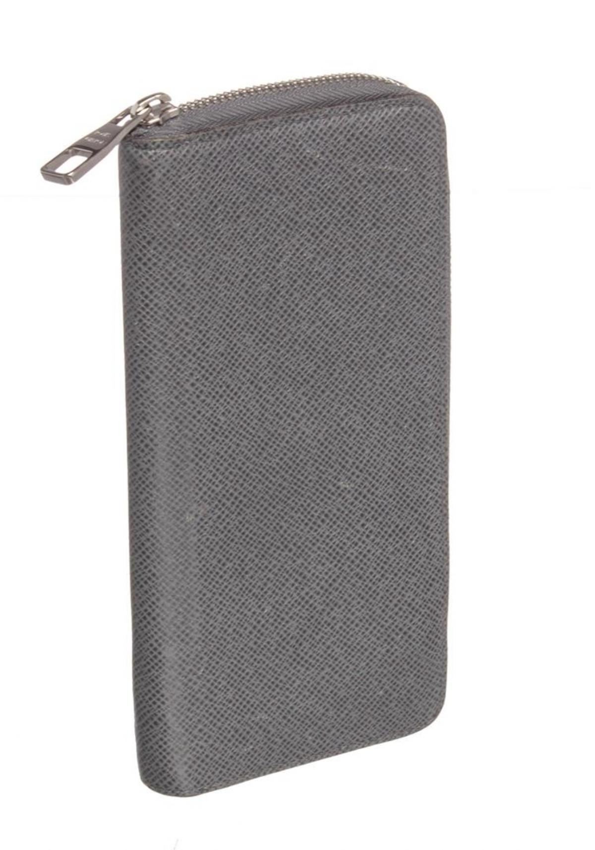 Louis Vuitton gray Taiga leather Vertical Zippy wallet with silver-tone hardware, four interior vertical pockets, one with zipper, ten card slots, zip around closure.