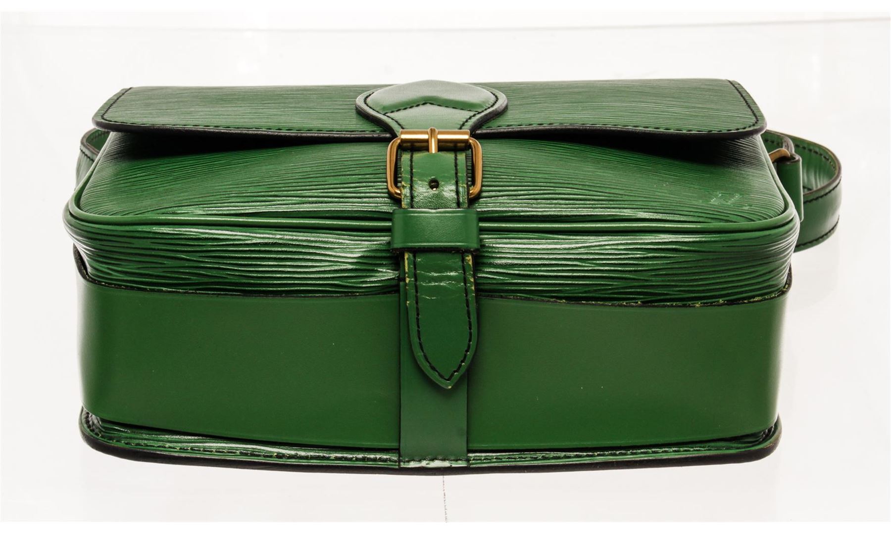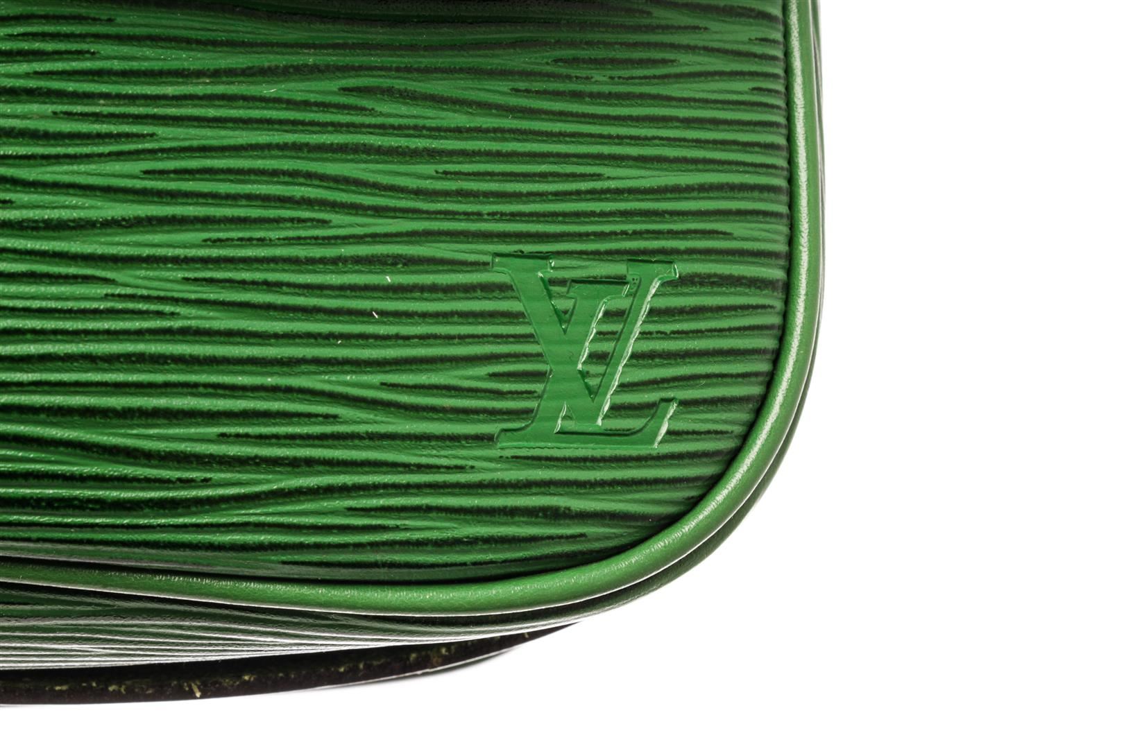 Louis Vuitton Green Epi Leather Cartouchiere Messenger Bag. All available information is listed in the description and shown in the photos. Louis Vuitton Green Epi Leather Cartouchiere Messenger Bag with green epi leather, brass hardware, single adjustable shoulder strap, canvas lining & single interior pocket, buckle closure at front. Height: 7" Width: 8" Depth: 2.5", Shoulder Strap Drop: 16-20" / 17.78 x 20.32 x 6.35 Cm
