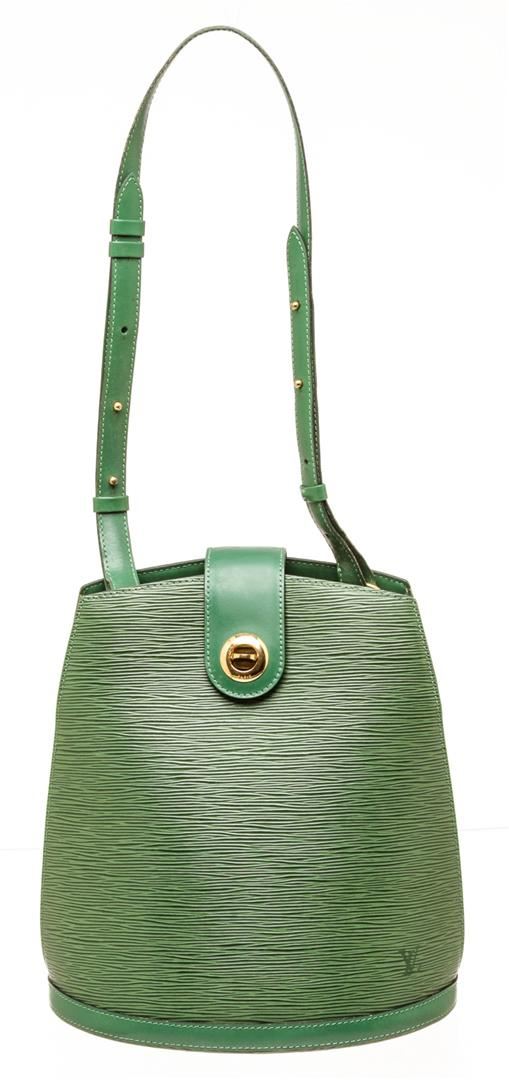 One Louis Vuitton Green Epi Leather Cluny Shoulder Bag. Green Epi leather Louis Vuitton Cluny shoulder bag with brass hardware, single flat shoulder strap with peg-in-hole adjustment, embossed logo at front corner, tonal Alcantara lining, single pocket at interior wall and turn-lock closure at front flap.