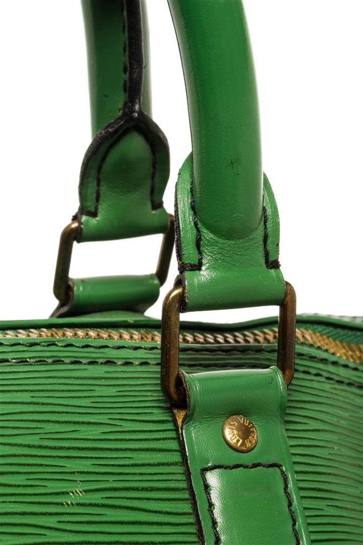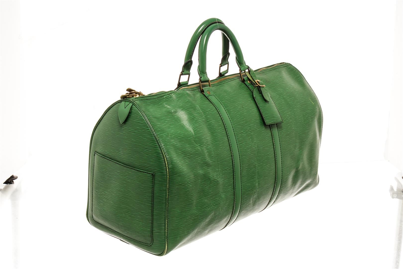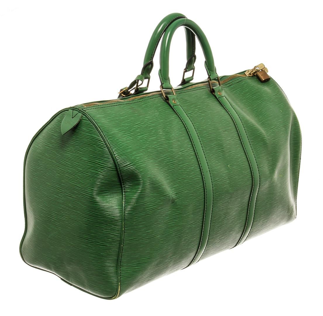 Louis Vuitton Green Epi Leather Keepall 50. All available information is listed in the description and shown in the photos. Louis Vuitton Green Epi Leather Keepall 50 with top handle, lock, suede lining, gold tone hardware and zipper closure