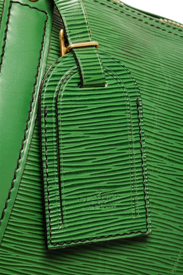 Louis Vuitton Green Epi Leather Keepall 50. All available information is listed in the description and shown in the photos. Louis Vuitton Green Epi Leather Keepall 50 with top handle, lock, suede lining, gold tone hardware and zipper closure