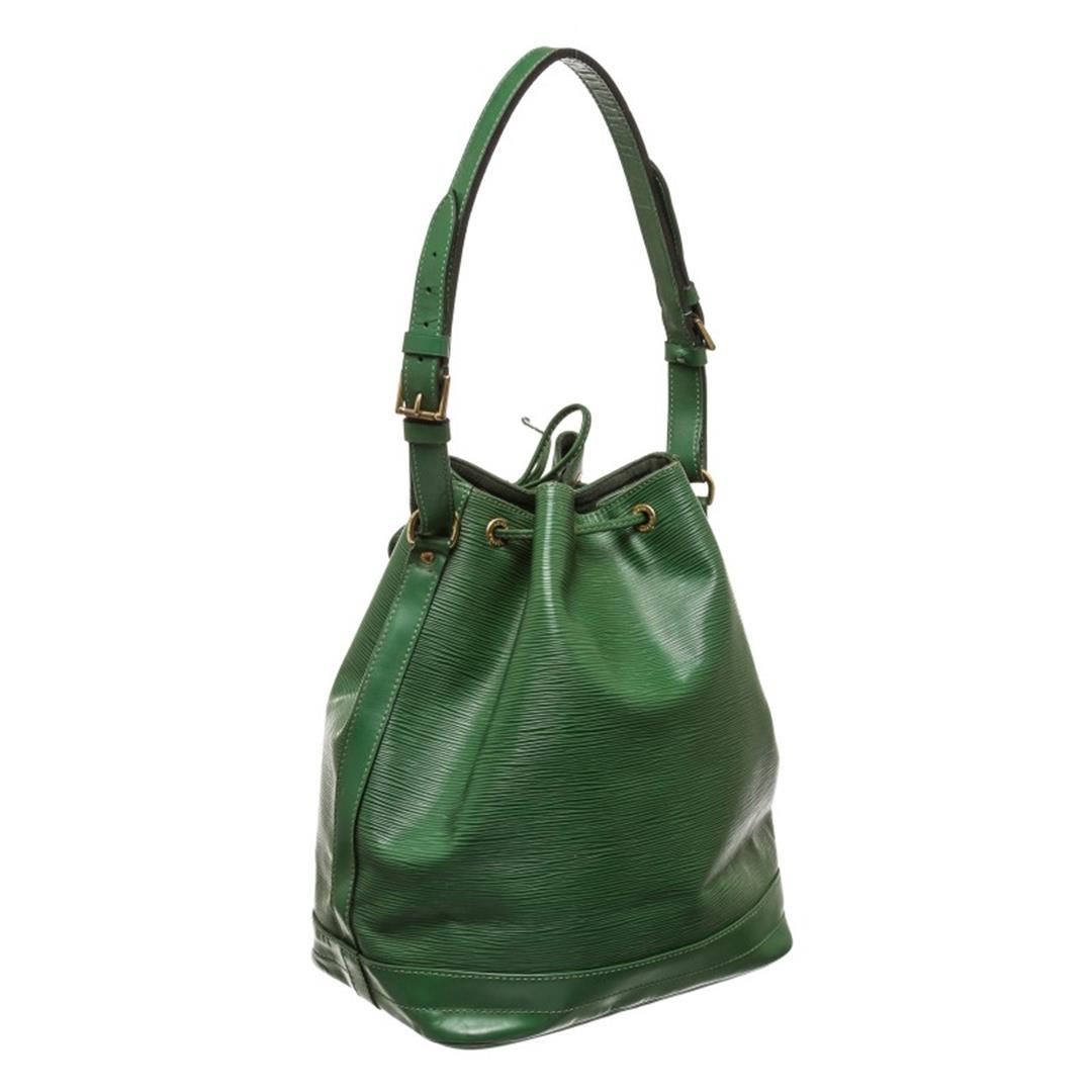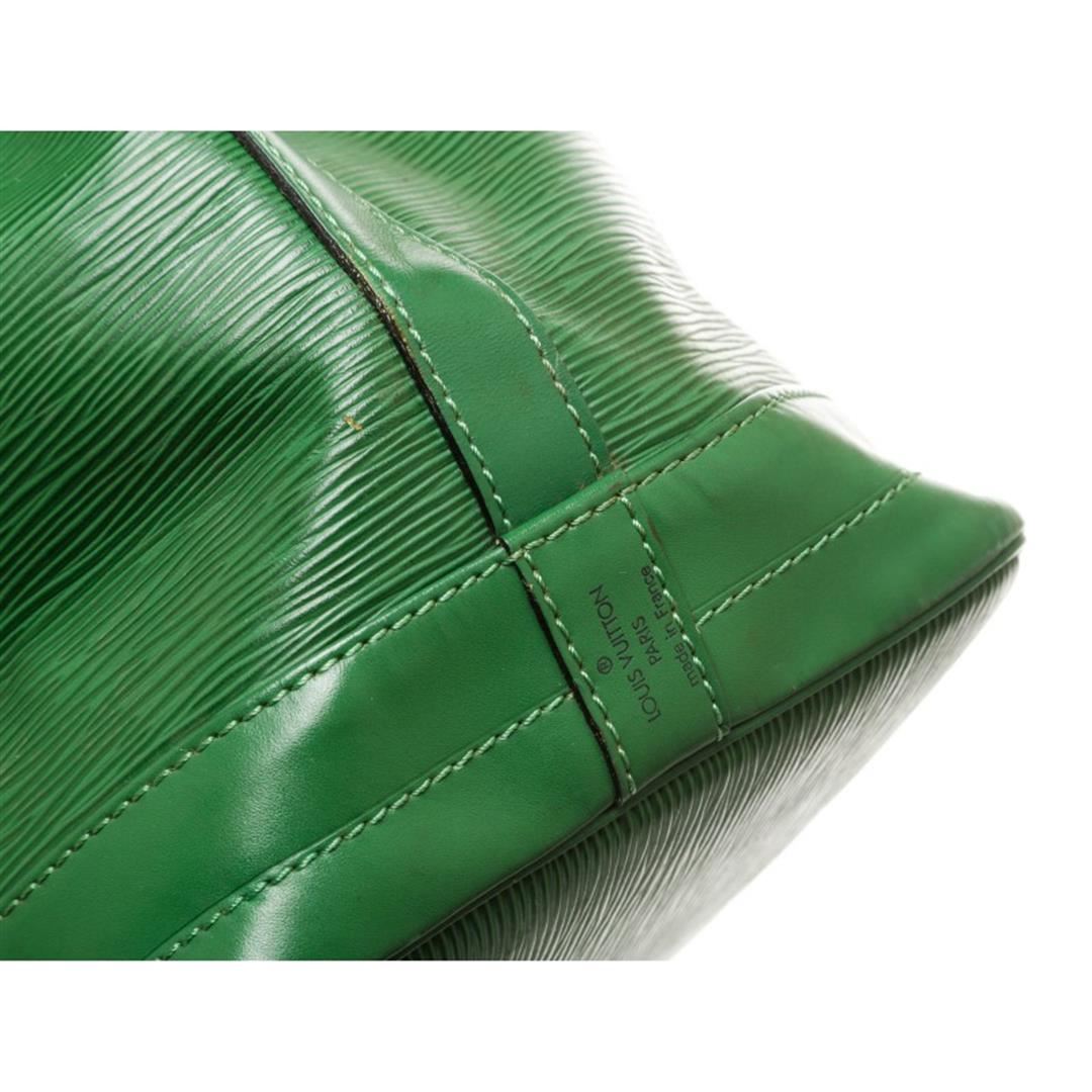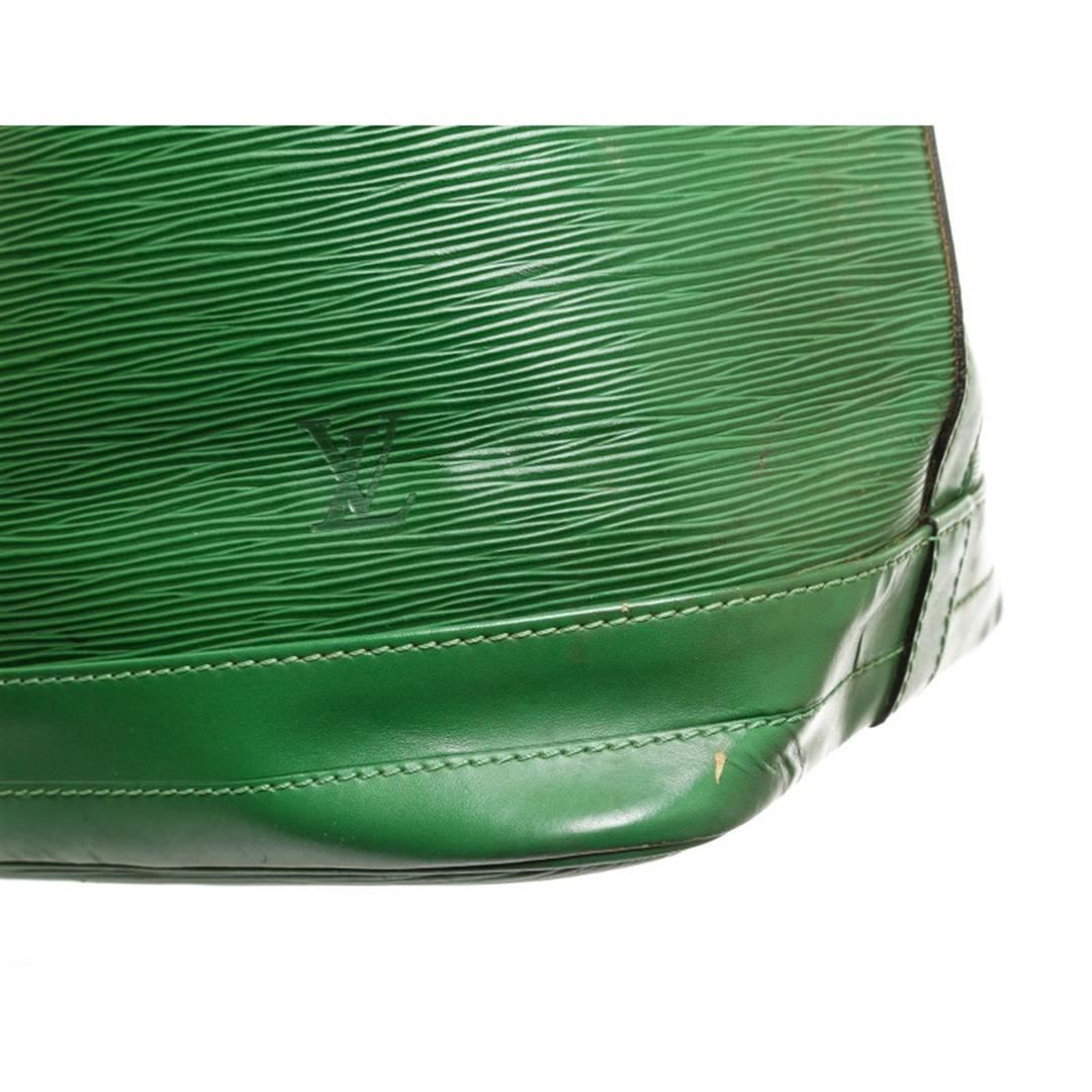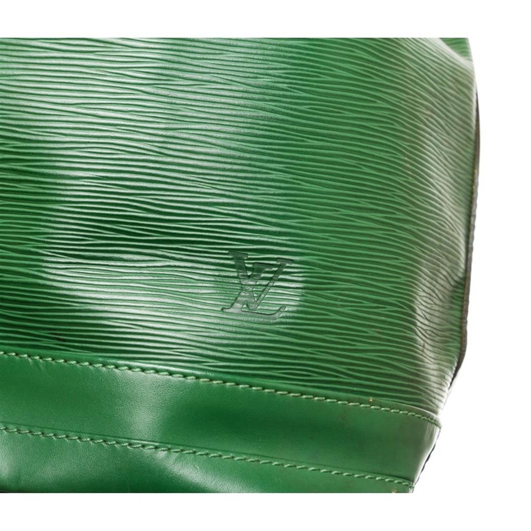 Green Epi leather Louis Vuitton Noe GM with brass hardware, single adjustable shoulder strap, tonal leather trim, embossed logo at exterior side, Alcantara lining and drawstring closure at top. Item is pre-owned.