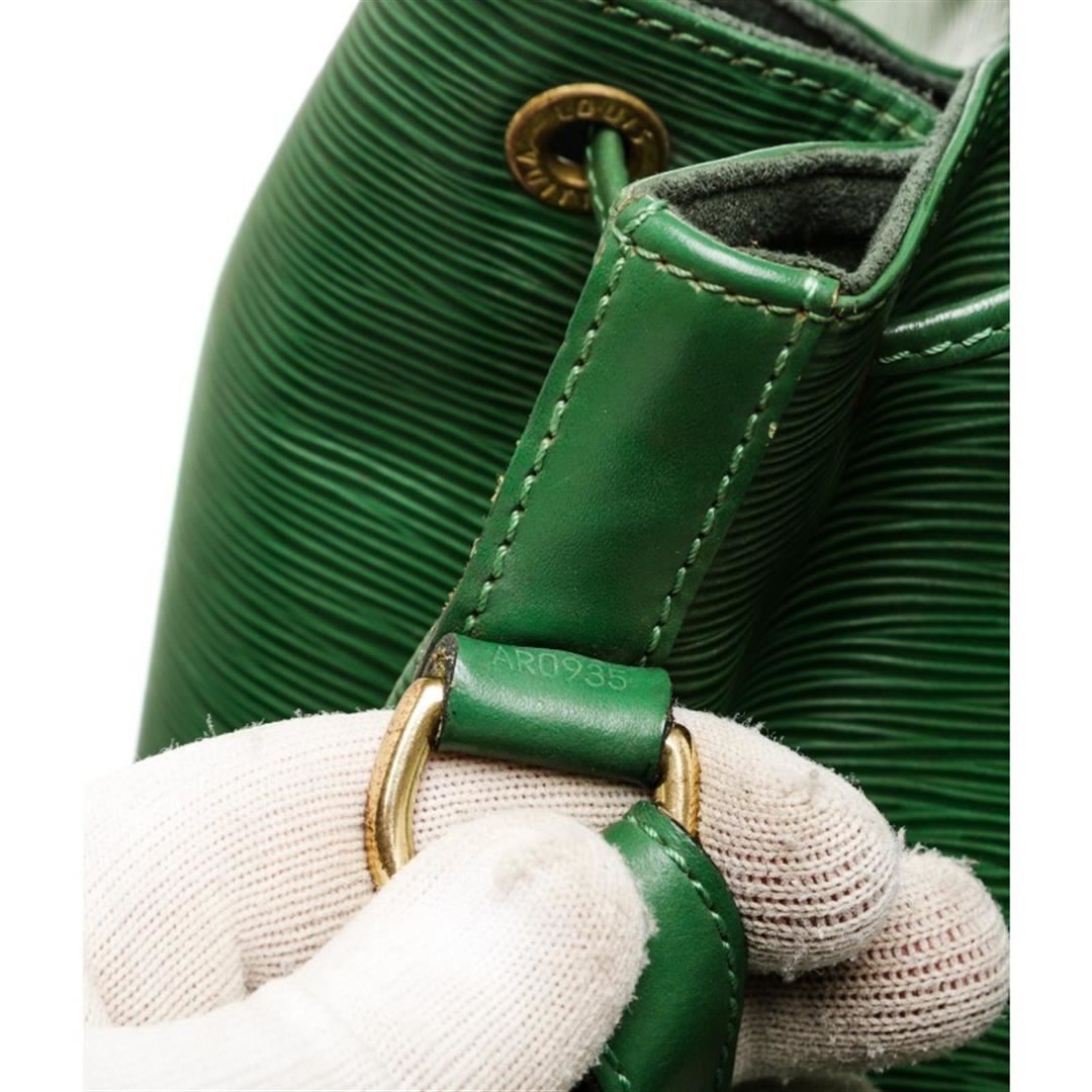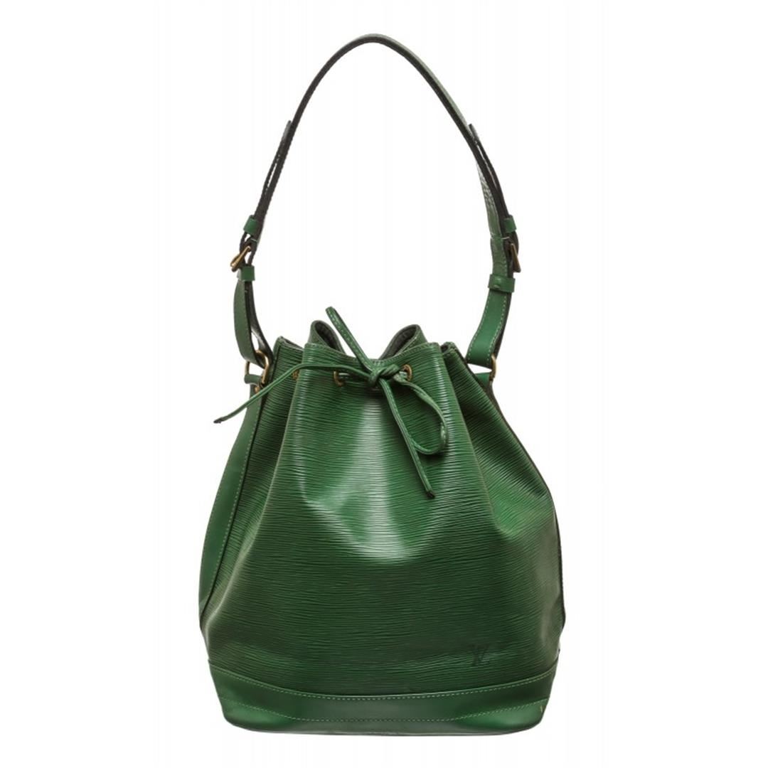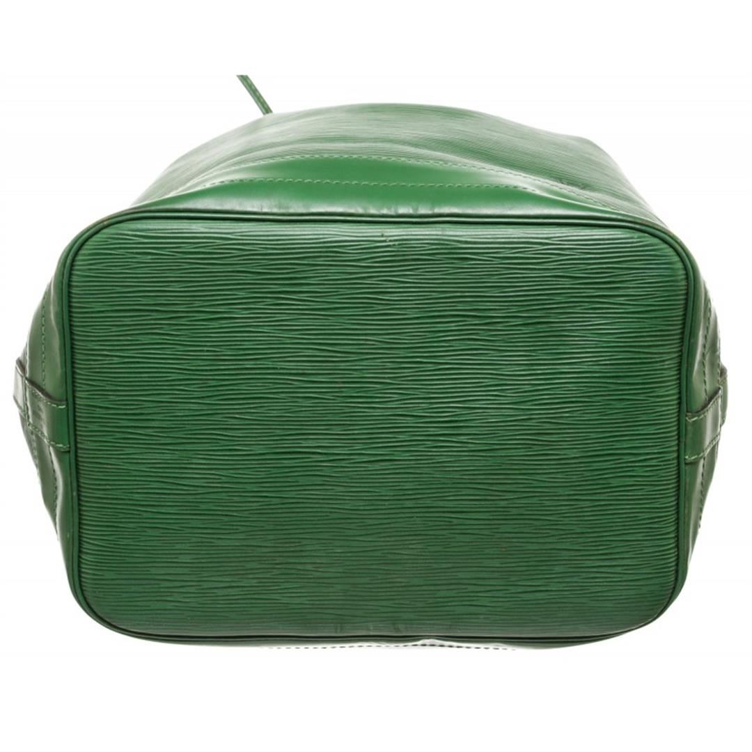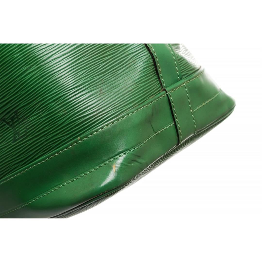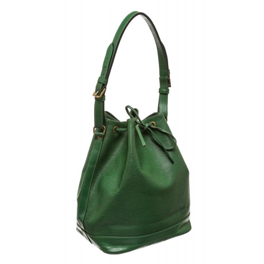 Green Epi leather Louis Vuitton Noe GM with brass hardware, single adjustable shoulder strap, tonal leather trim, embossed logo at exterior side, Alcantara lining and drawstring closure at top. Item is pre-owned.