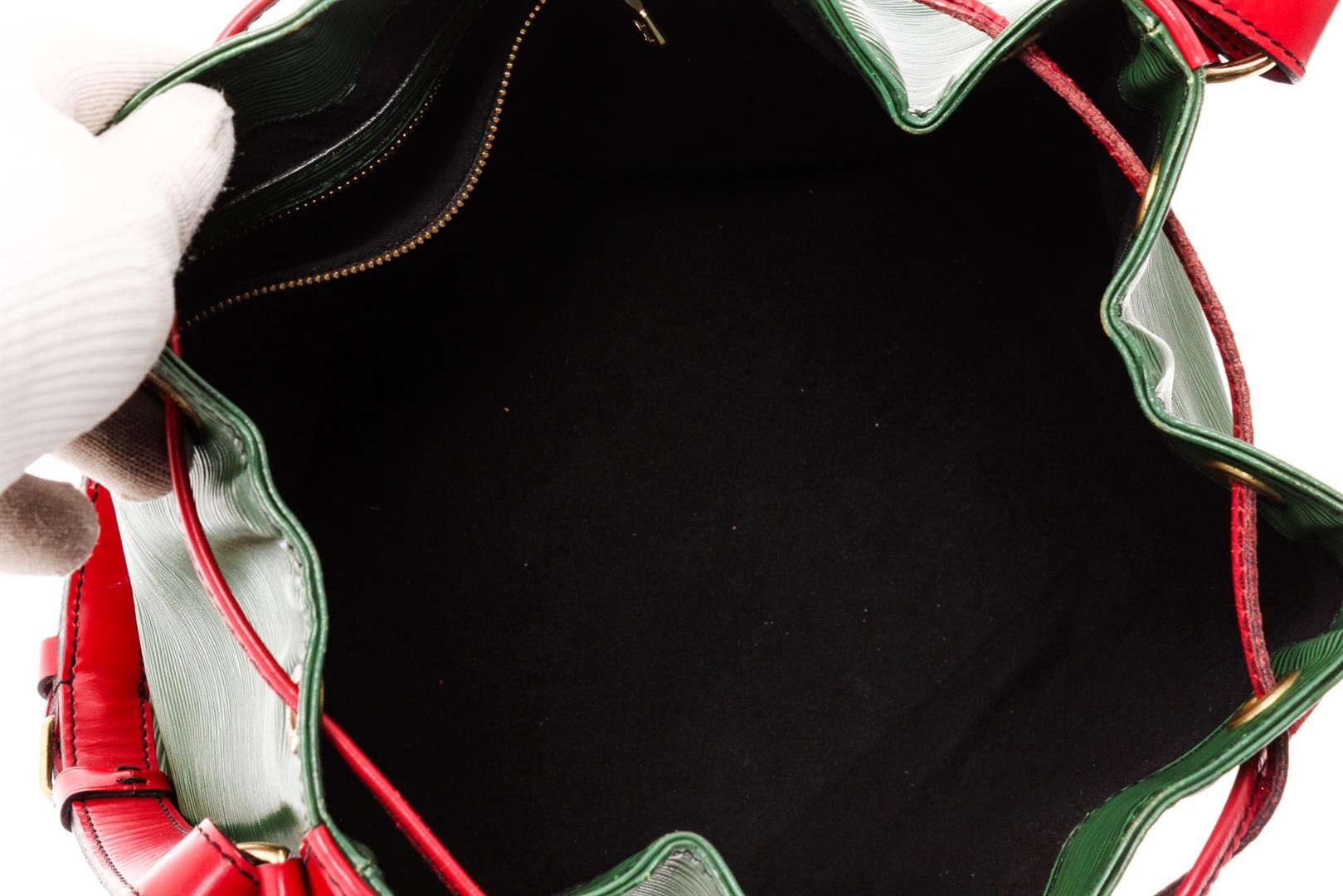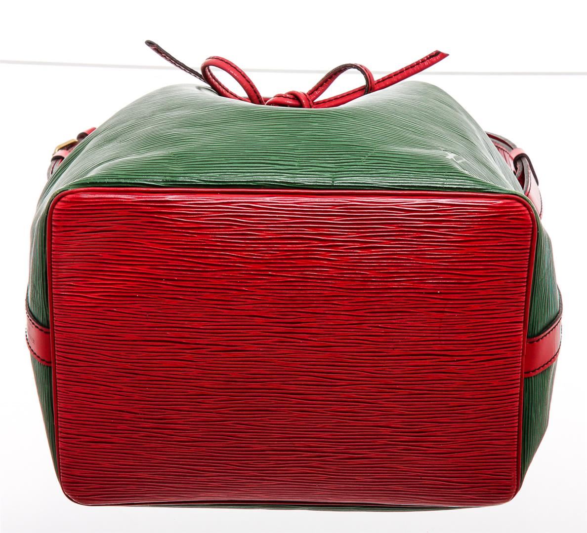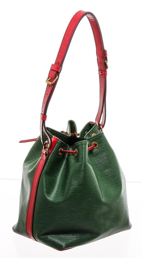 One Louis Vuitton Green Epi Leather Noe PM Drawstring Shoulder Bag. Epi leather Louis Vuitton Noe PM with brass hardware, adjustable flat shoulder strap, tonal Alcantara lining and drawstring closure at top.