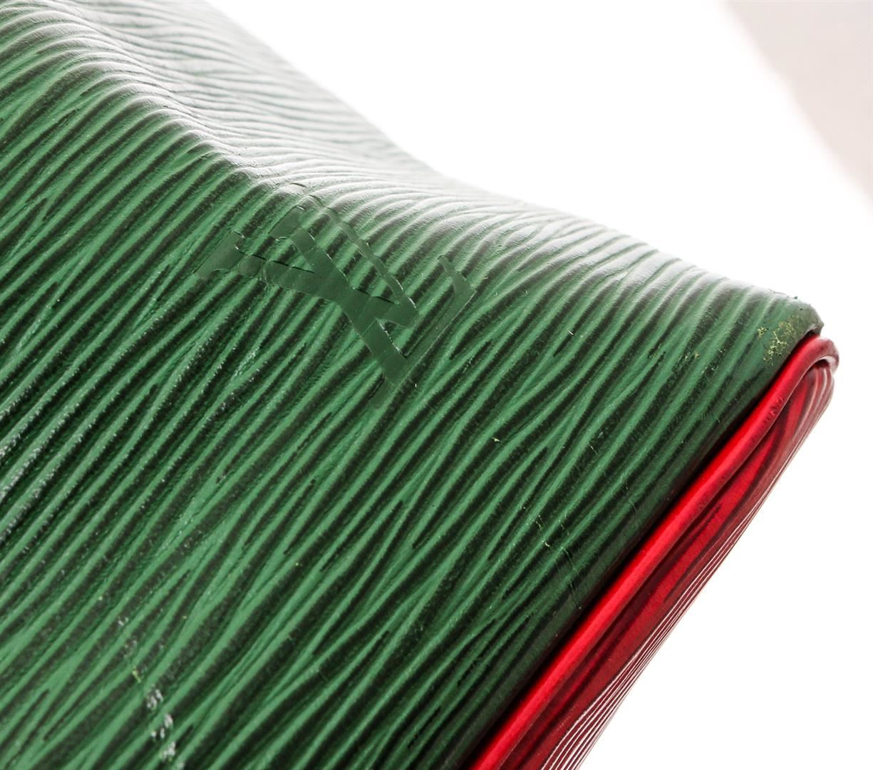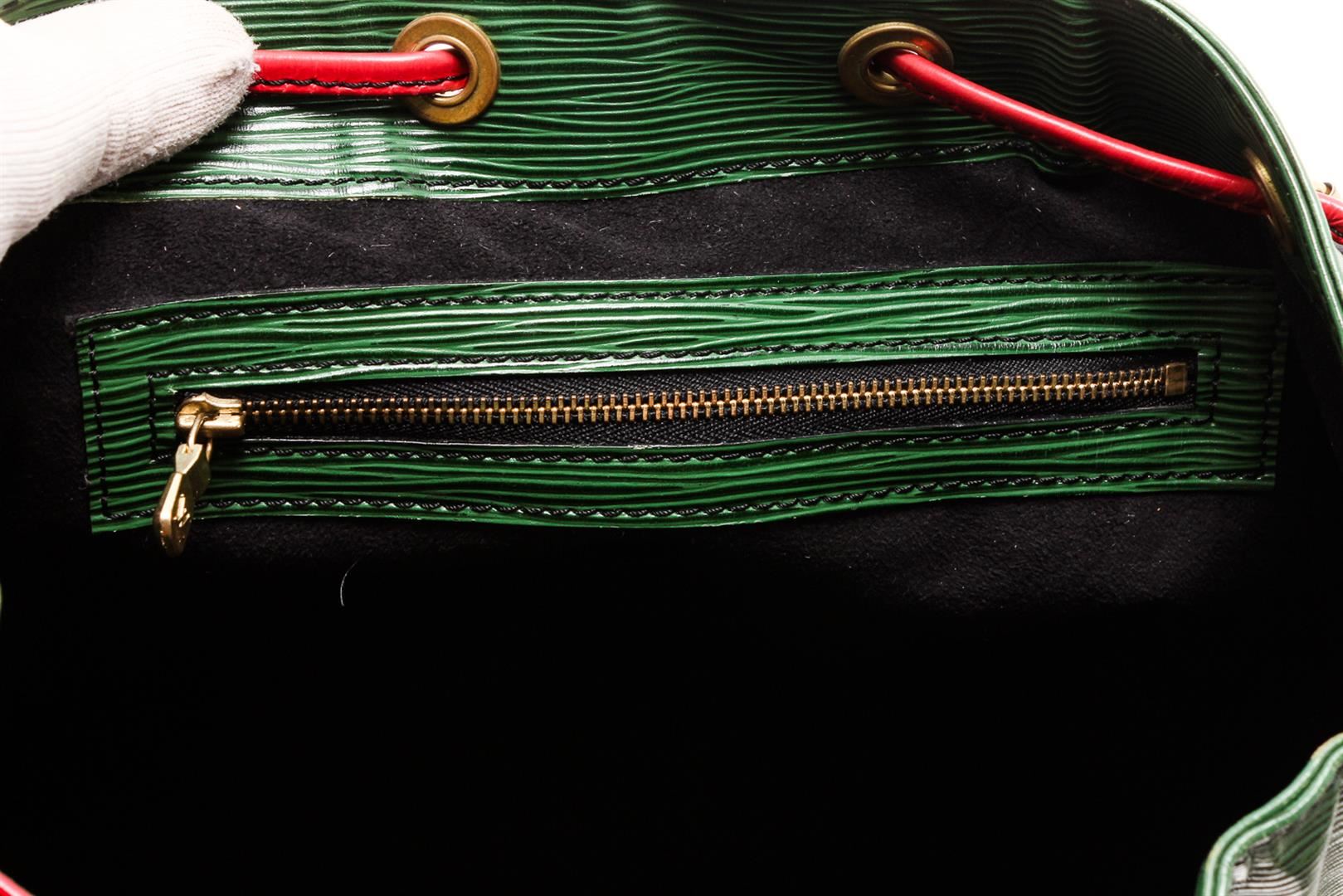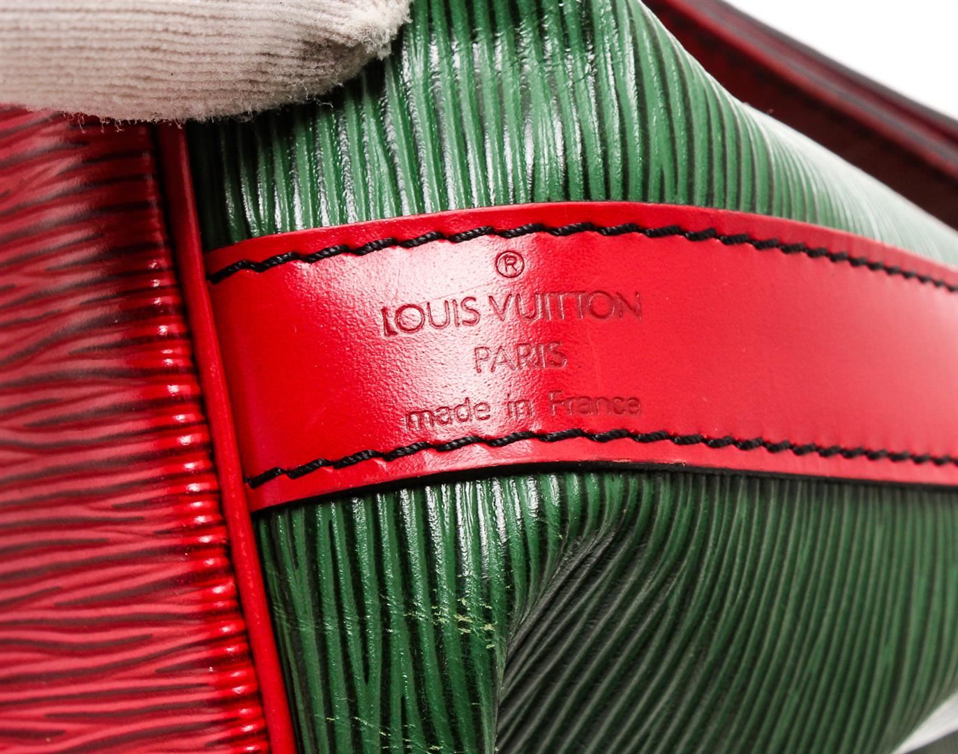One Louis Vuitton Green Epi Leather Noe PM Drawstring Shoulder Bag. Epi leather Louis Vuitton Noe PM with brass hardware, adjustable flat shoulder strap, tonal Alcantara lining and drawstring closure at top.