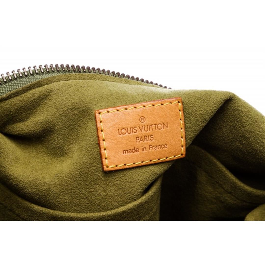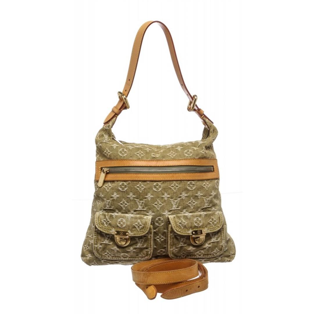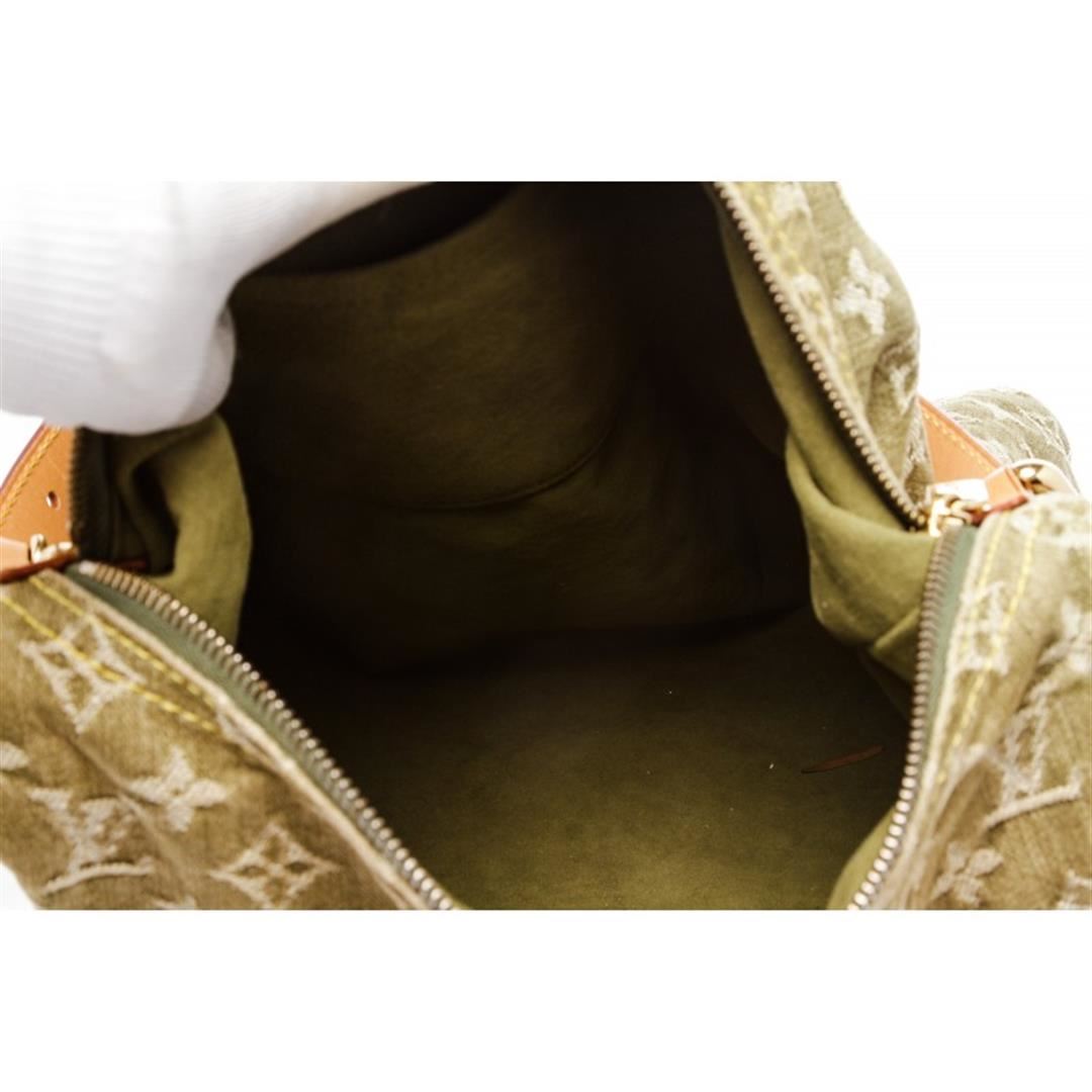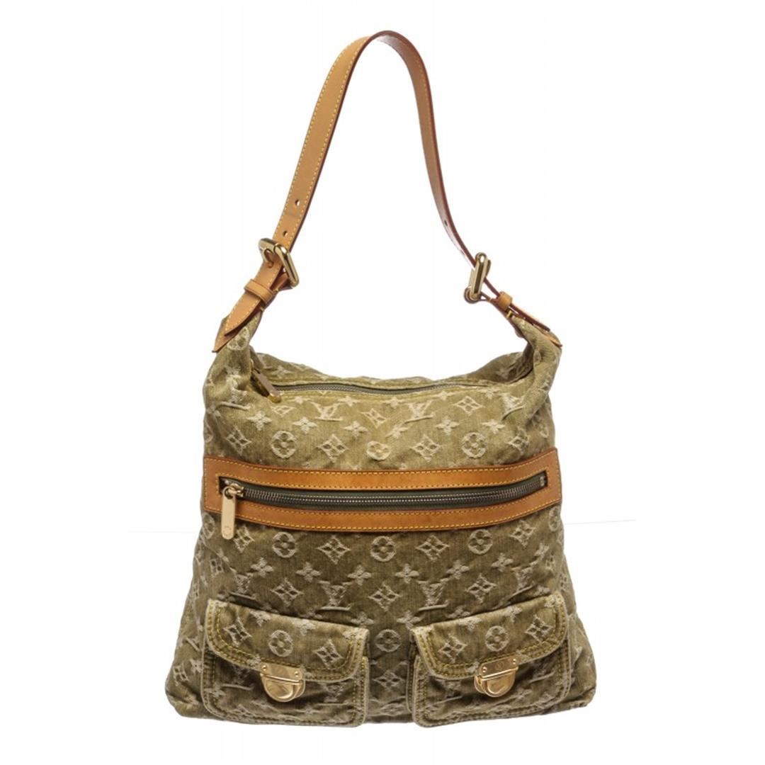 Green monogram denim Louis Vuitton Baggy GM with brass hardware, tan vachetta leather trim, flat shoulder strap, three exterior pockets; two with push-lock closures and one with zip closure, marigold Alcantara lining, single open pocket at interior wall and zip closure at top. Item is Pre-Owned.