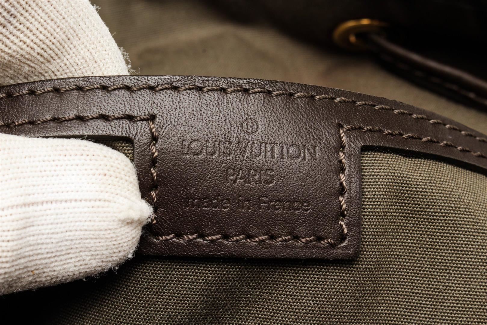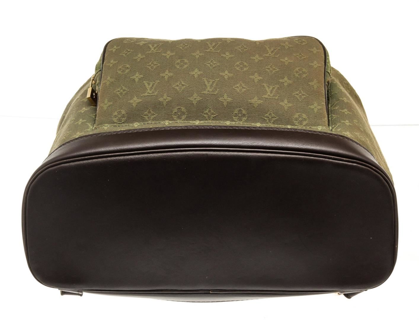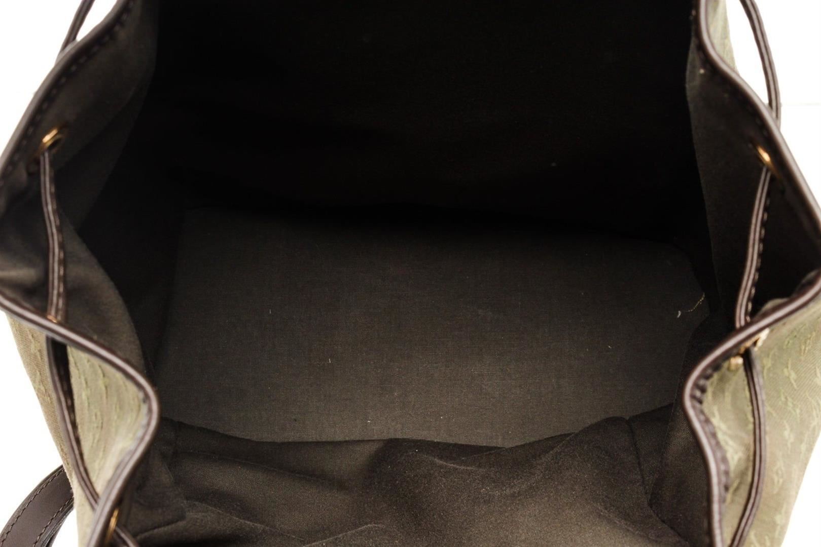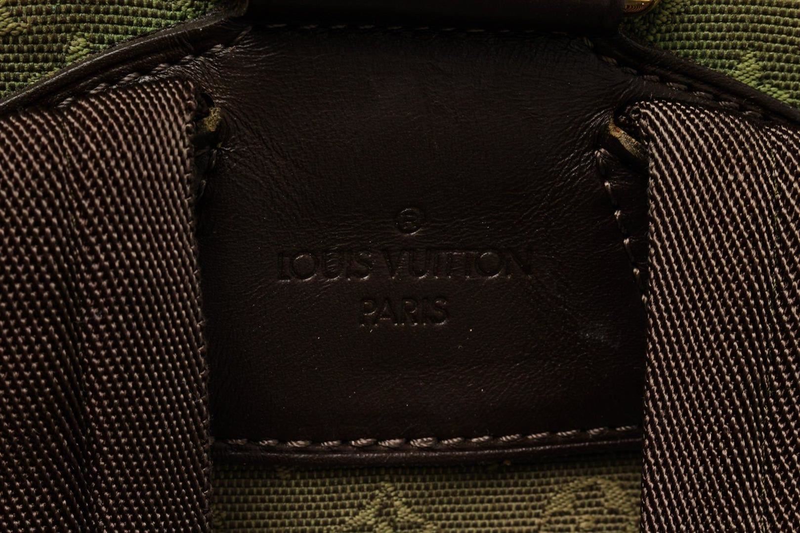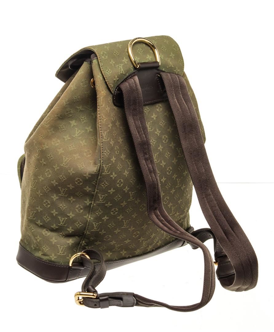 Louis Vuitton Green Monogram Montsouris GM Backpack Bag with monogram canvas, gold-tone hardware, tan vachetta leather, exterior zip pockets, interior slip pocket, shoulder strap and drawstring closure.