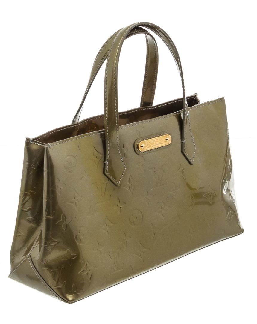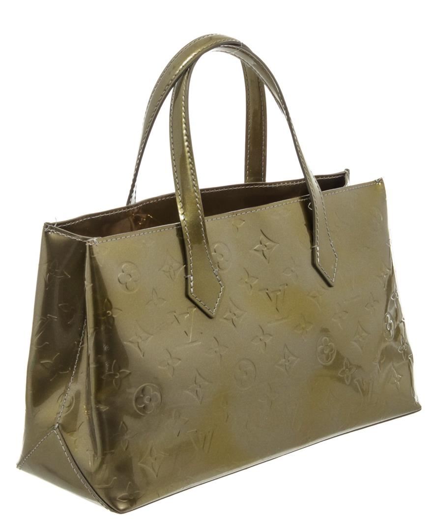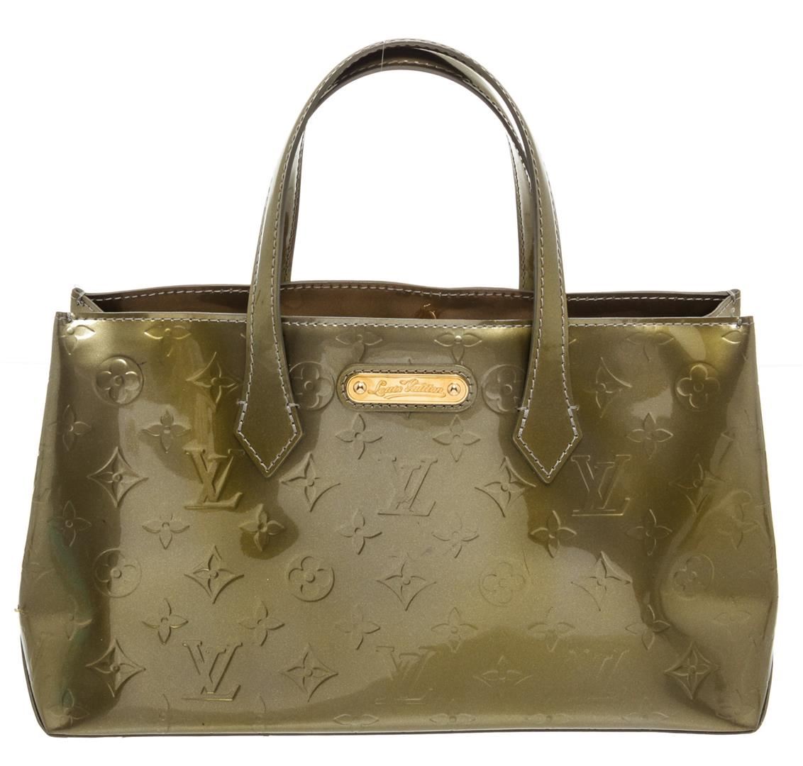 Monogram Vernis leather Louis Vuitton Wilshire PM with brass hardware, dual flat top handles, logo placard at front face, tonal canvas lining, single zip pocket at interior wall and clasp closure at top. Authentic.