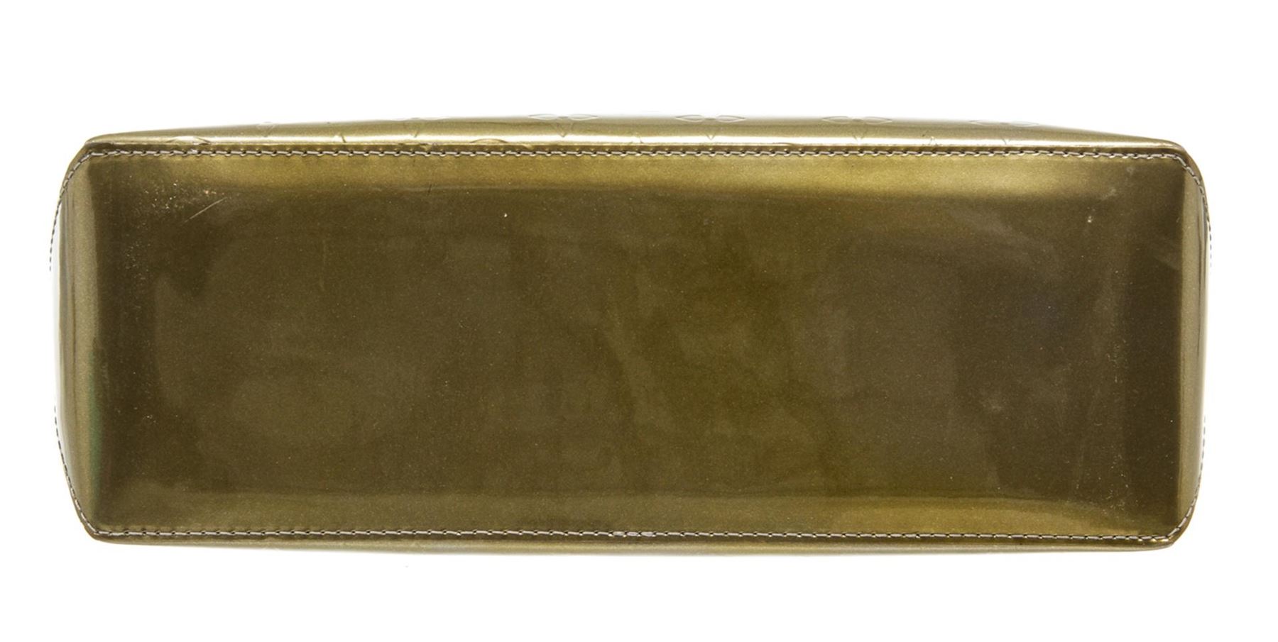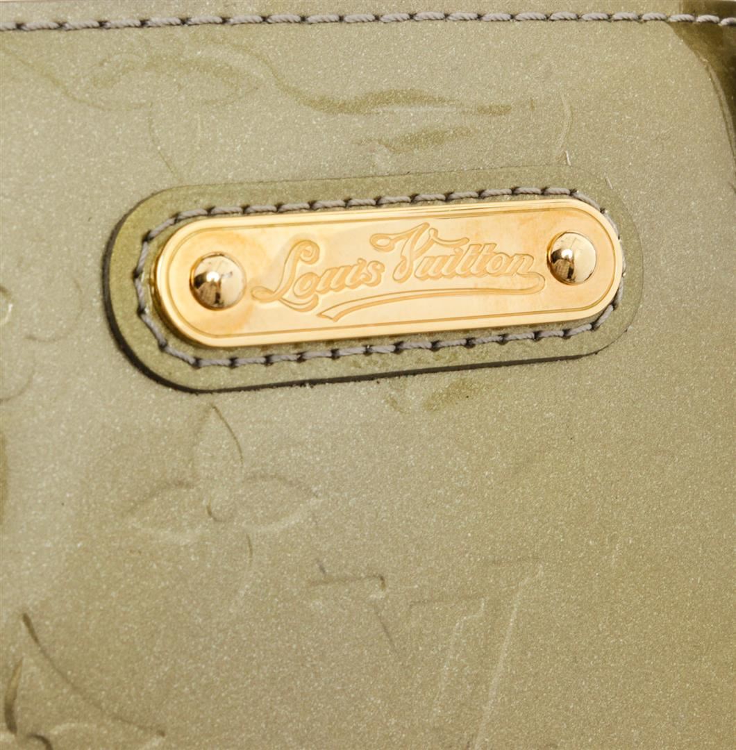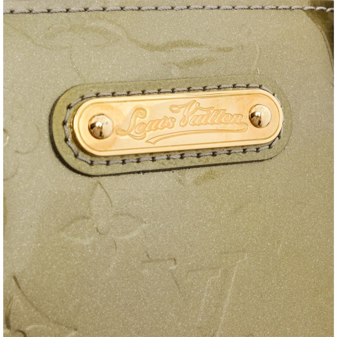 Monogram Vernis leather Louis Vuitton Wilshire PM with brass hardware, dual flat top handles, logo placard at front face, tonal canvas lining, single zip pocket at interior wall and clasp closure at top. Authentic.
