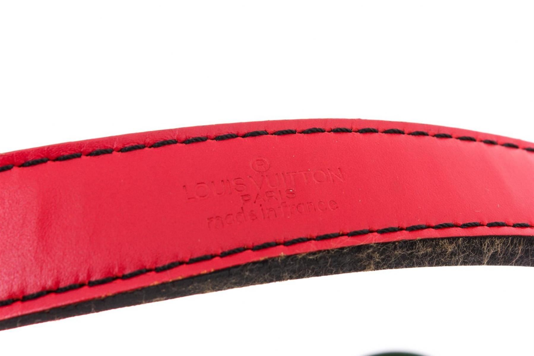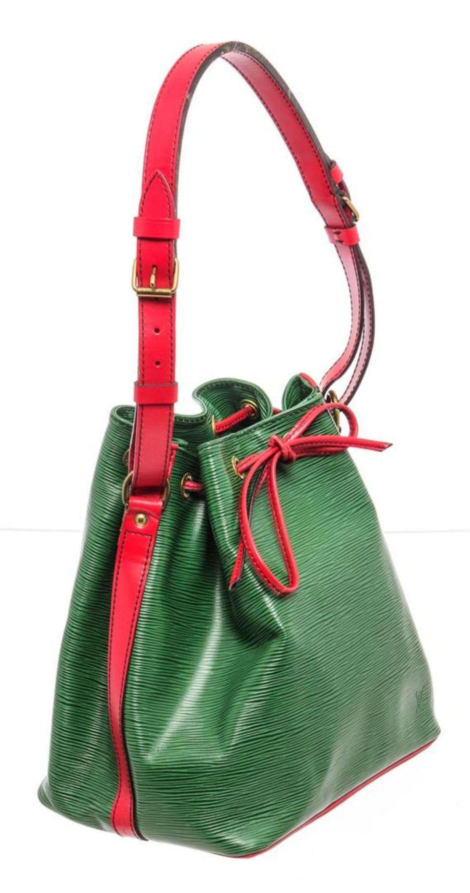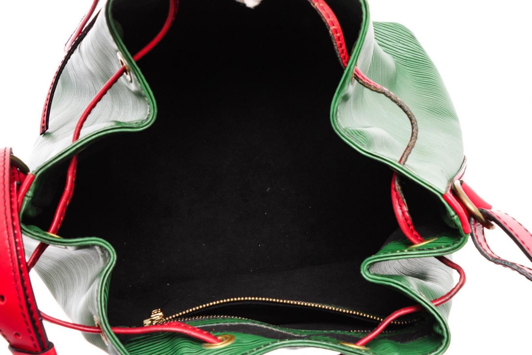 Green and Red Epi leather Louis Vuitton Noe PM with brass hardware, adjustable flat shoulder strap, tonal Alcantara lining and drawstring closure at top.