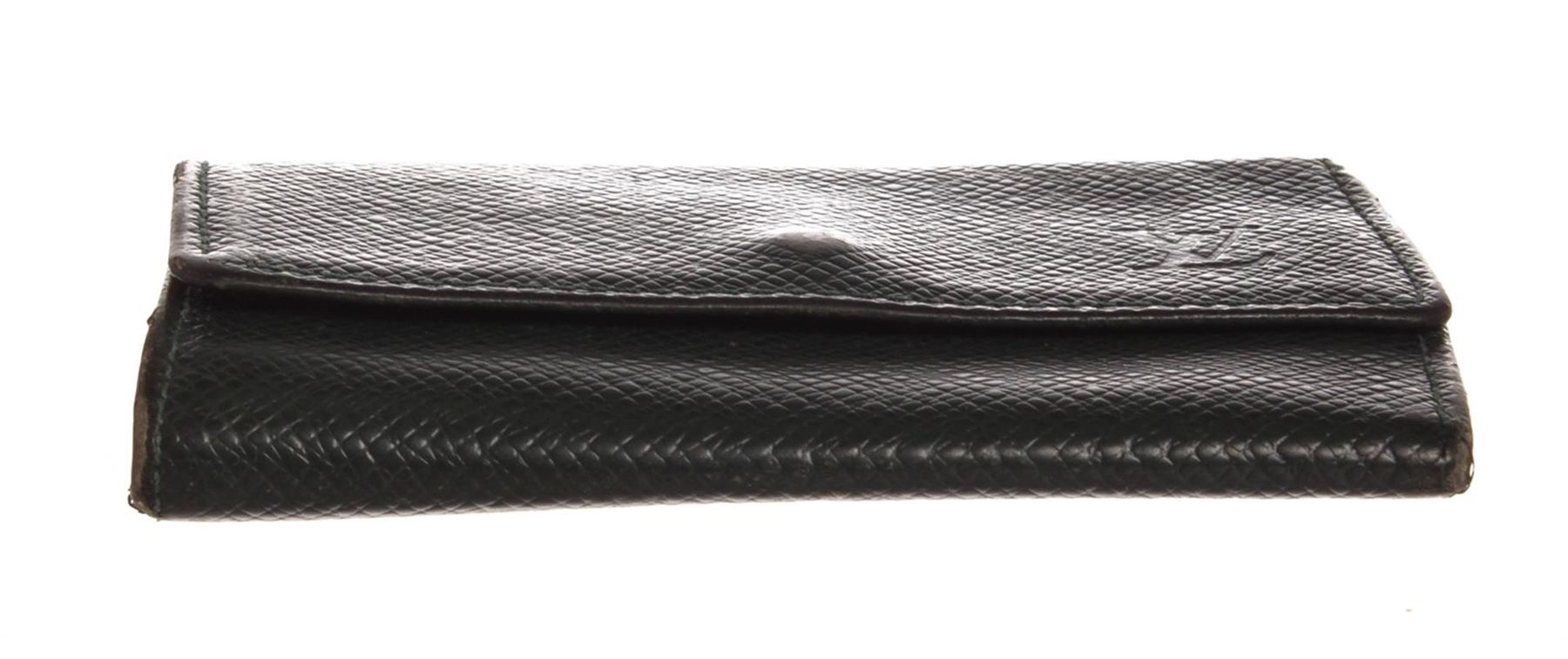 Louis Vuitton dark green Taiga Leather 6 Key Holder with leather interior featuring six key holders and snap closure at front.